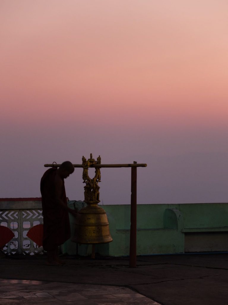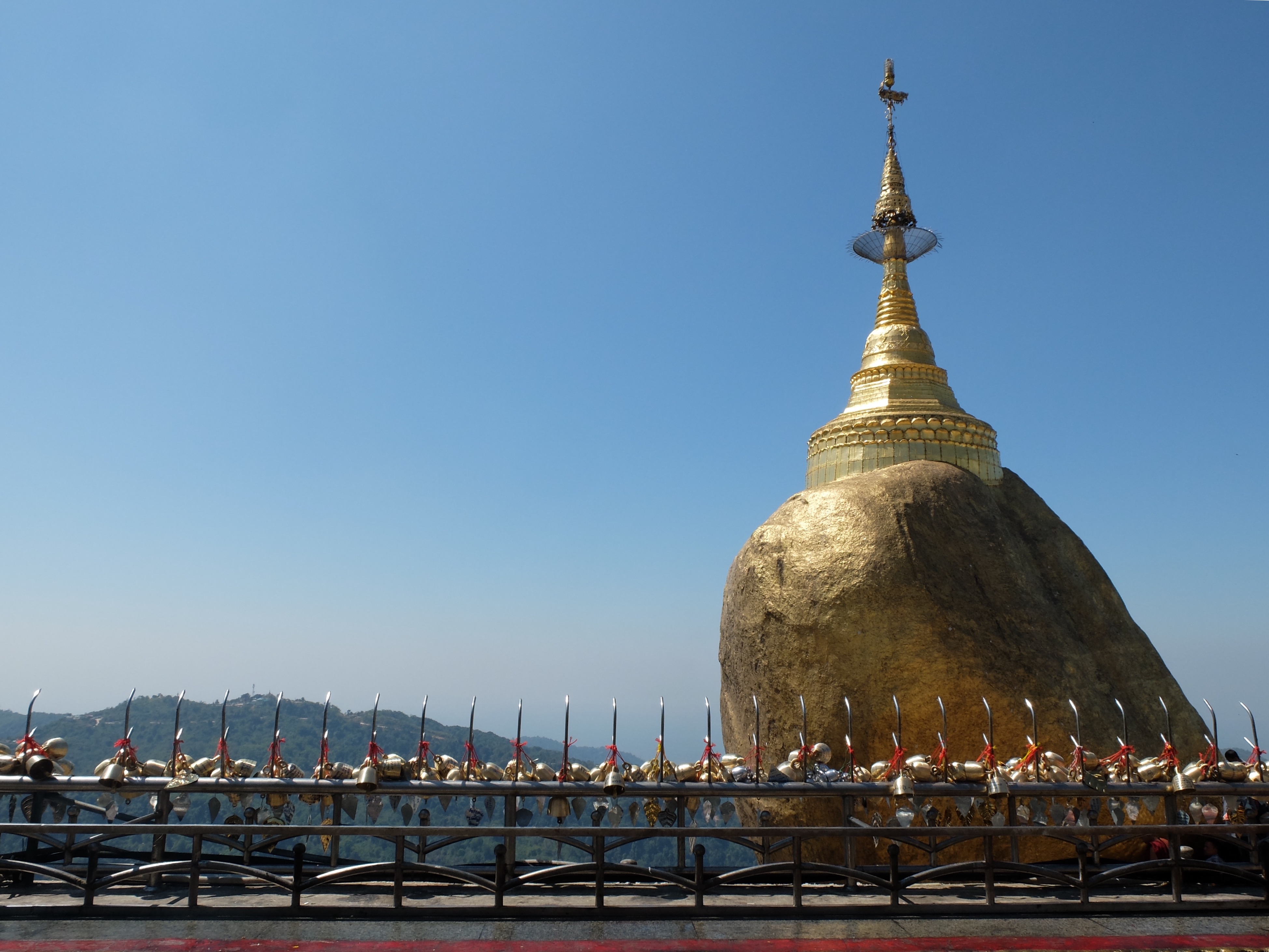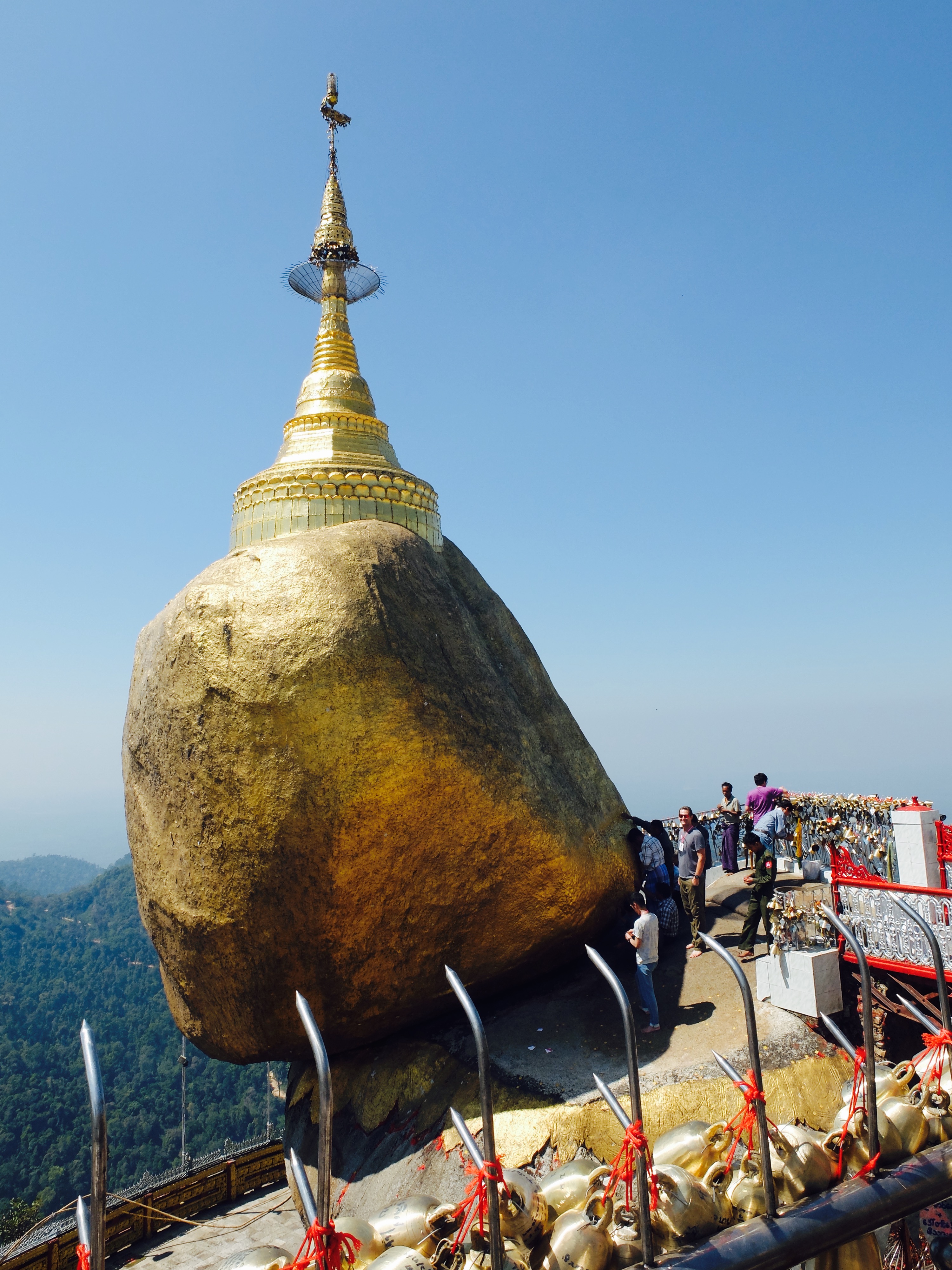 Met de slowtrain gingen we op weg naar Bago, ging echt wel heel langzaam. Ik vond het geinig. In Bago bezochten we de Golden Rock, wat een van de drukbezochtste religieuze plekken is van Myanmar. Het is een grote ronde gouden steen (no shit) met een pagoda erop, de mannen mogen erbij komen en het nog gouder maken (en dat kan bijna niet) met bladgoud. Voornamelijk de vrouwen hangen bellen aan het hek, in de hoop op geluk, met hun namen erop. Alleen de rit ernaartoe was het al waard. Opgepropt in een open truck met alleen maar locals, geweldig weer en de stijle berg op. Op de weg terug merkte iemand mn tattoo op en vervolgens sprak de hele truck erover. De crème die ik op mn gezicht deed wilden zij ook en de vrouwen achter me waren zo gelukkig met de Nivea. Het stadje zelf heel sereen en fijn. No pressure van mensen die iets van toeristen willen, ook hier.
