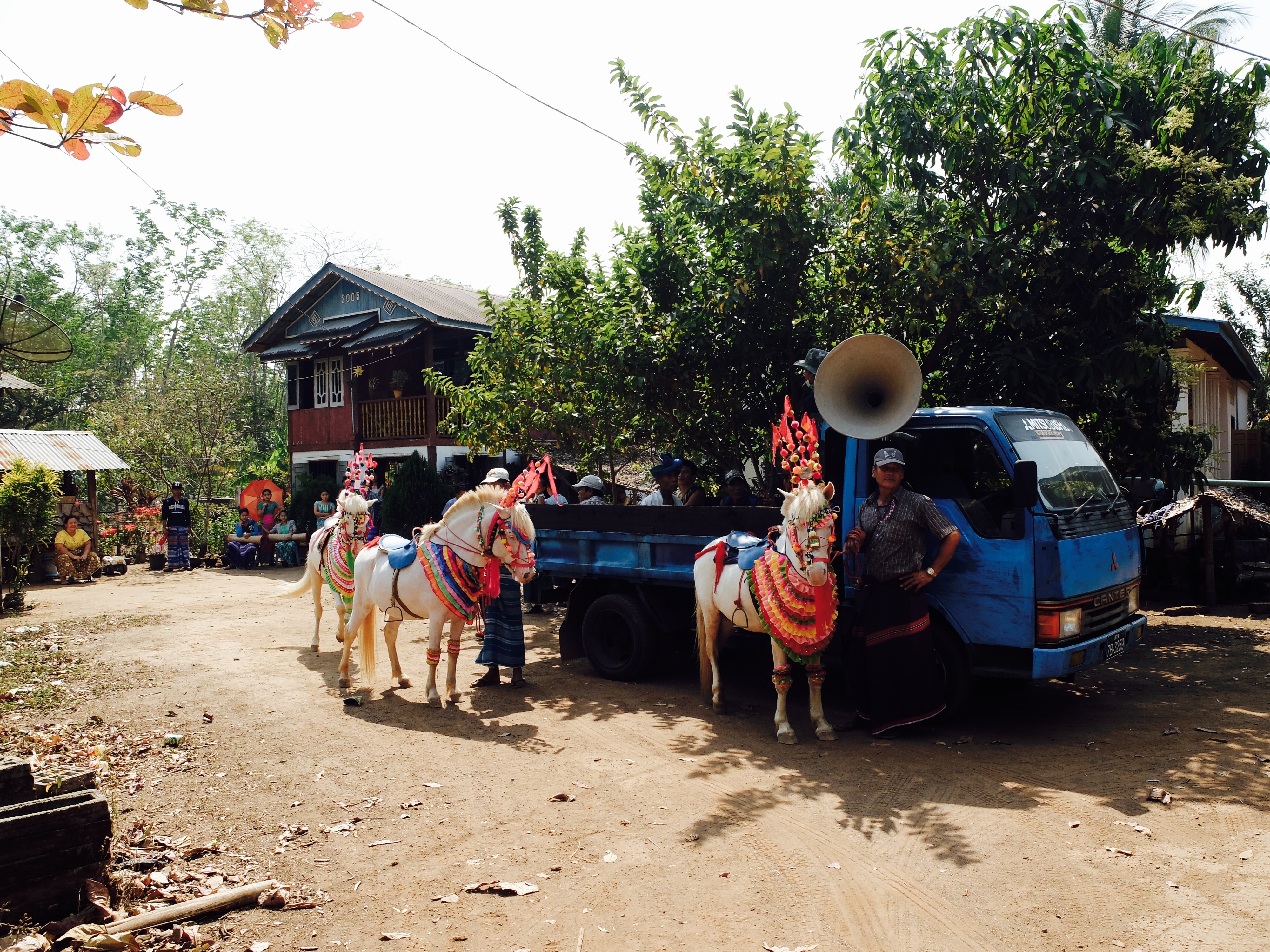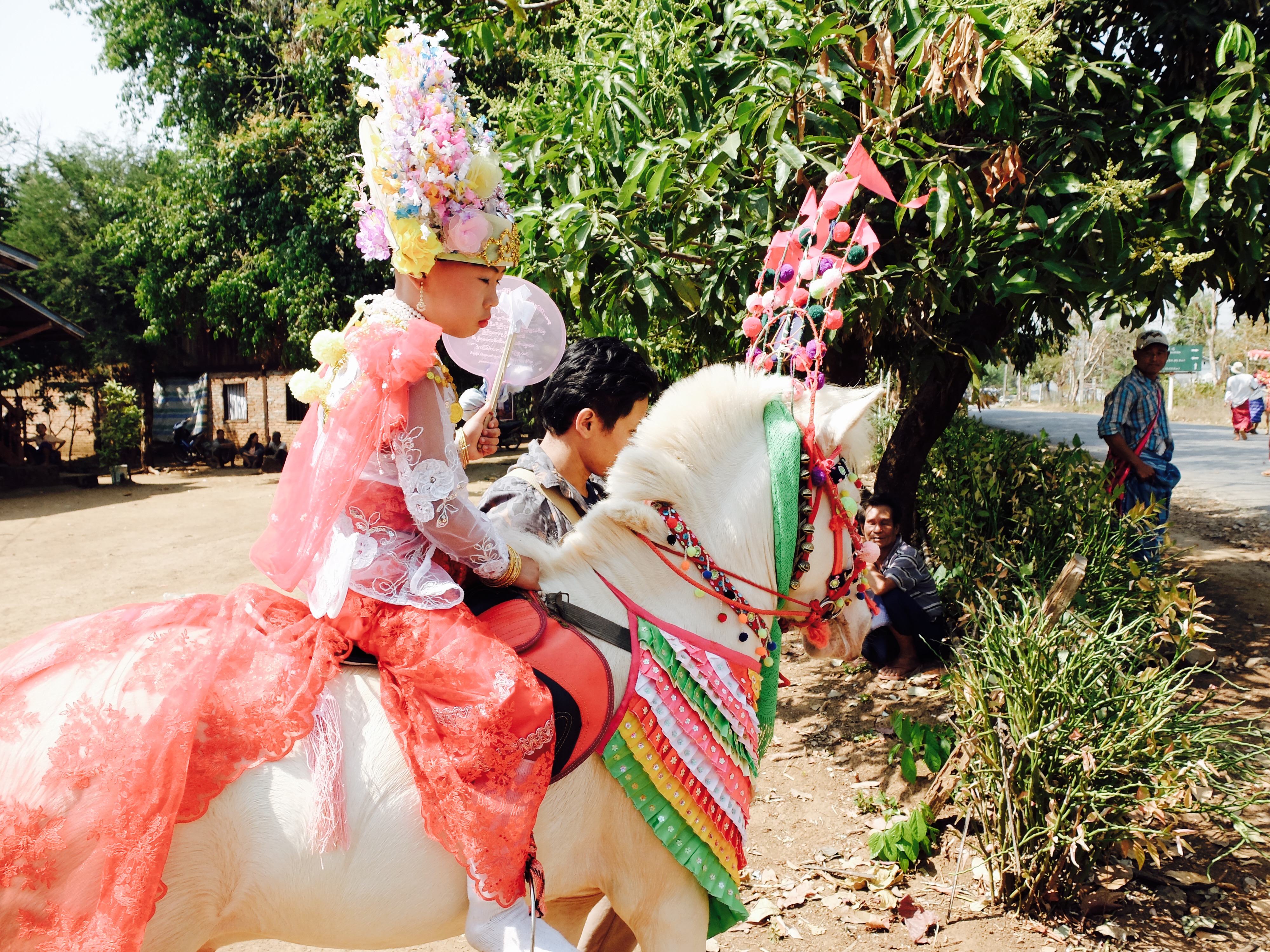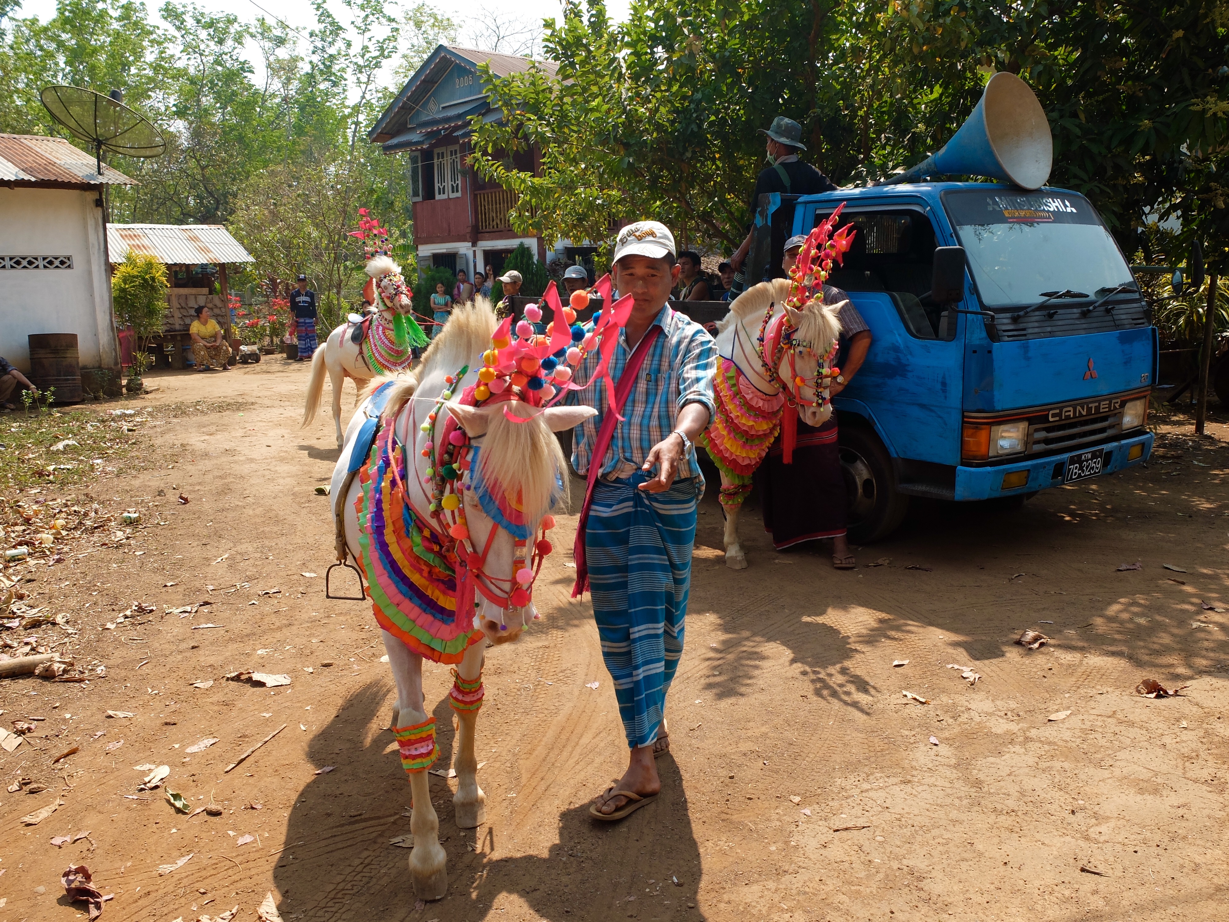 De bus bracht on naar Hpa an vanuit waar we de chocolade hill (zo zeg je het maar spel je het niet!) gingen bekijken, een klepel vormige rots met pagodaas erop. We gingen er heen op de scoot en de omgeving was ook zeer de moeite waard. Mooie plek. We hadden onze backpacks achtergelaten in Hpa an en een daypack bij ons omdat we in klooster op een berg wilden overnachten. Ik zag onderweg vanuit mijn ooghoek iets rozes bewegen en het zag er heel onwerkelijk uit, dus gingen we terug. Het bleken drie albino uitgedoste paarden te zijn, een zingende meneer wiens stem uit de luidspreker van de truck schalde en een bandje in de truck. Maar t indrukwekkendste was dat de paarden dansten op het ritme van de muziek, als een opdraaibeestje en schudde zijn hoofd vol met belletjes. We keken elkaar aan en het was echt een jawdropper. Een van de mannen kwam op ons aflopen en nodigde ons uit om te komen kijken. Een van de paarden 'gaf been' op commando, aan Gavin. Twee kindjes werden als eruitziende kleine prinsen op de paarden gezet, moet wel een ceremonie geweest zijn. We kregen varkensvet, waar we vriendelijk voor bedankten maar we aten de rijst wel en kregen meloen toe.