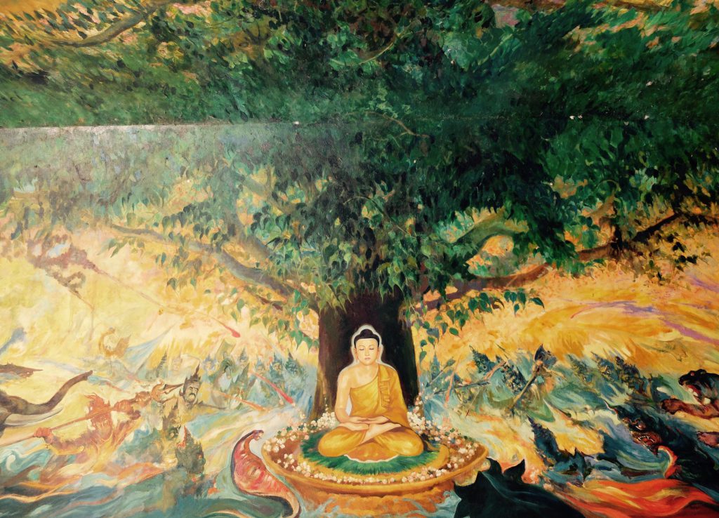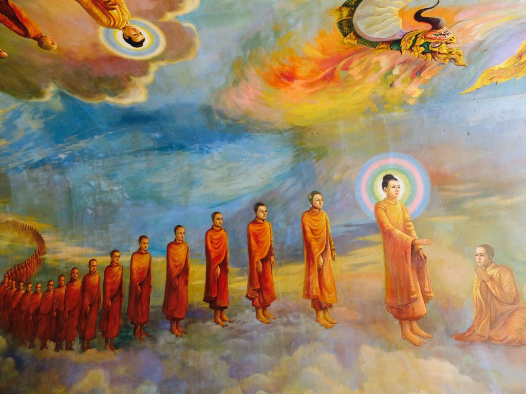 De stupa in het midden van het geheel was heel mooi. En de zonsondergang spectaculair en het licht daarna roze en onwerkelijk. Ik heb even een monnik geobserveerd die les gaf aan kinderen en ben daarna gaan mediteren bij een kleinere stupa. Twee slapende voeten door het dunne bamboe matje en beginnende spierpijn in mijn kuiten, ik kon niet meer opstaan. Later hebben we (onverwacht heel goed) gegeten en was ik total dood.