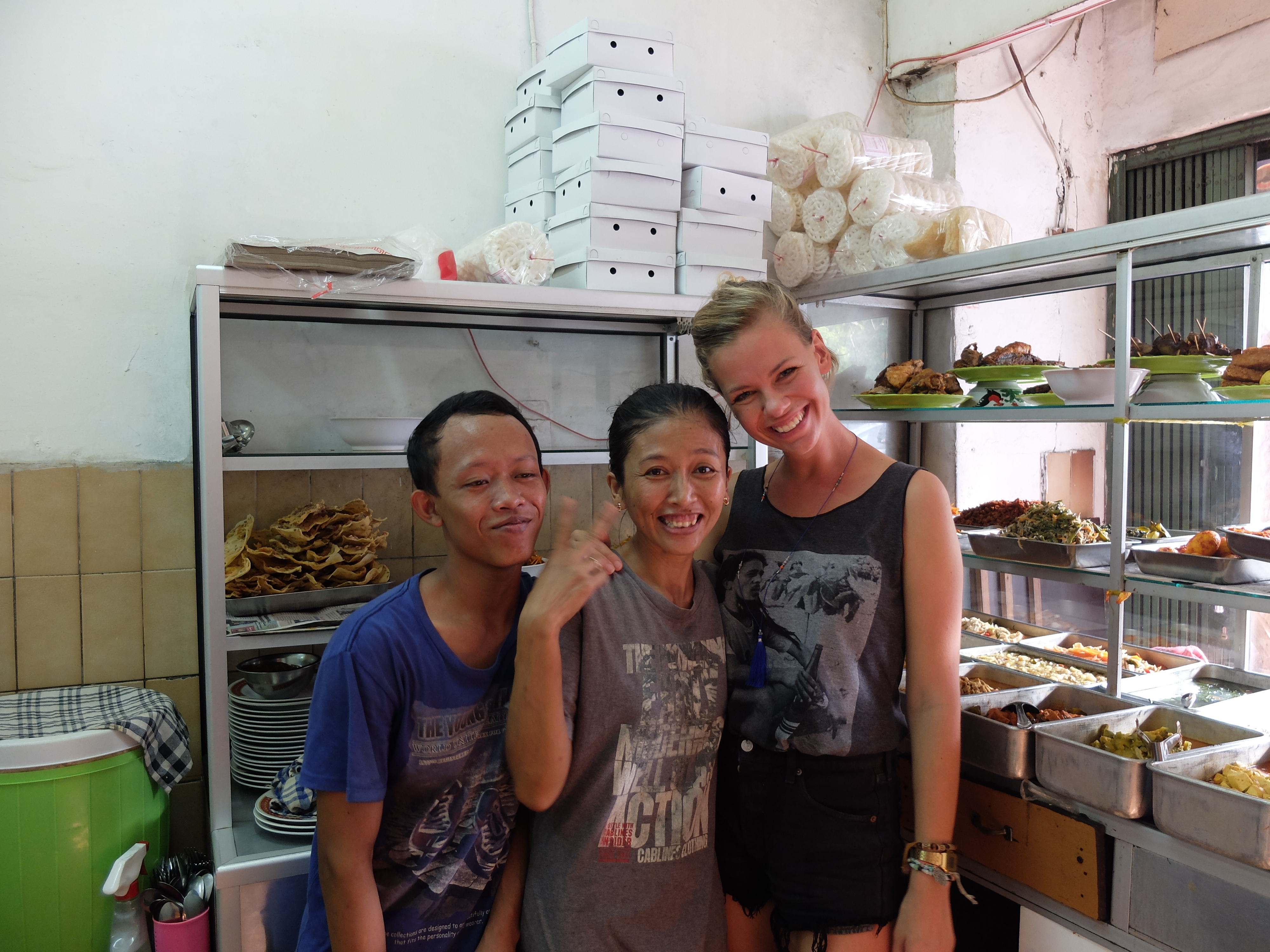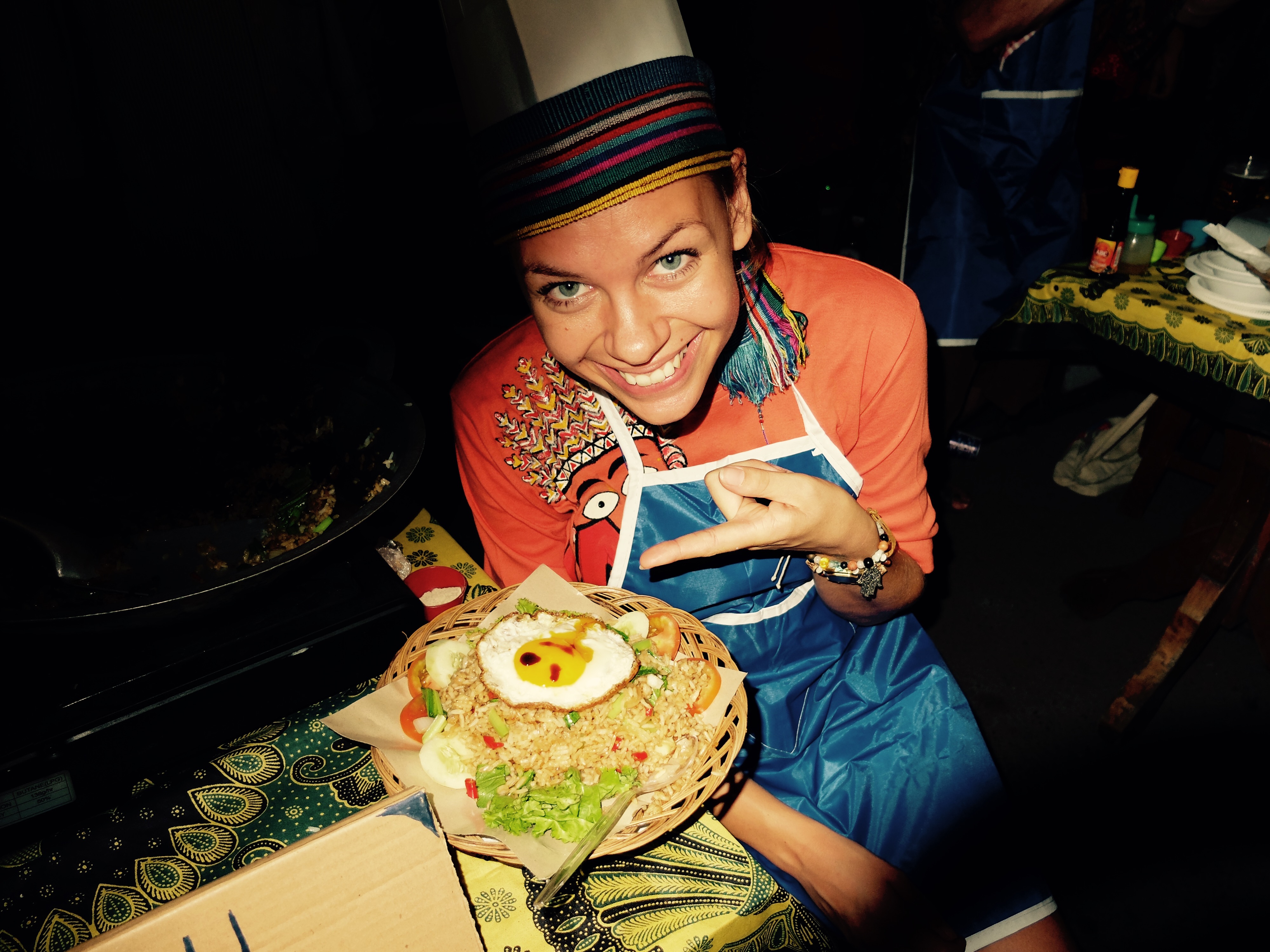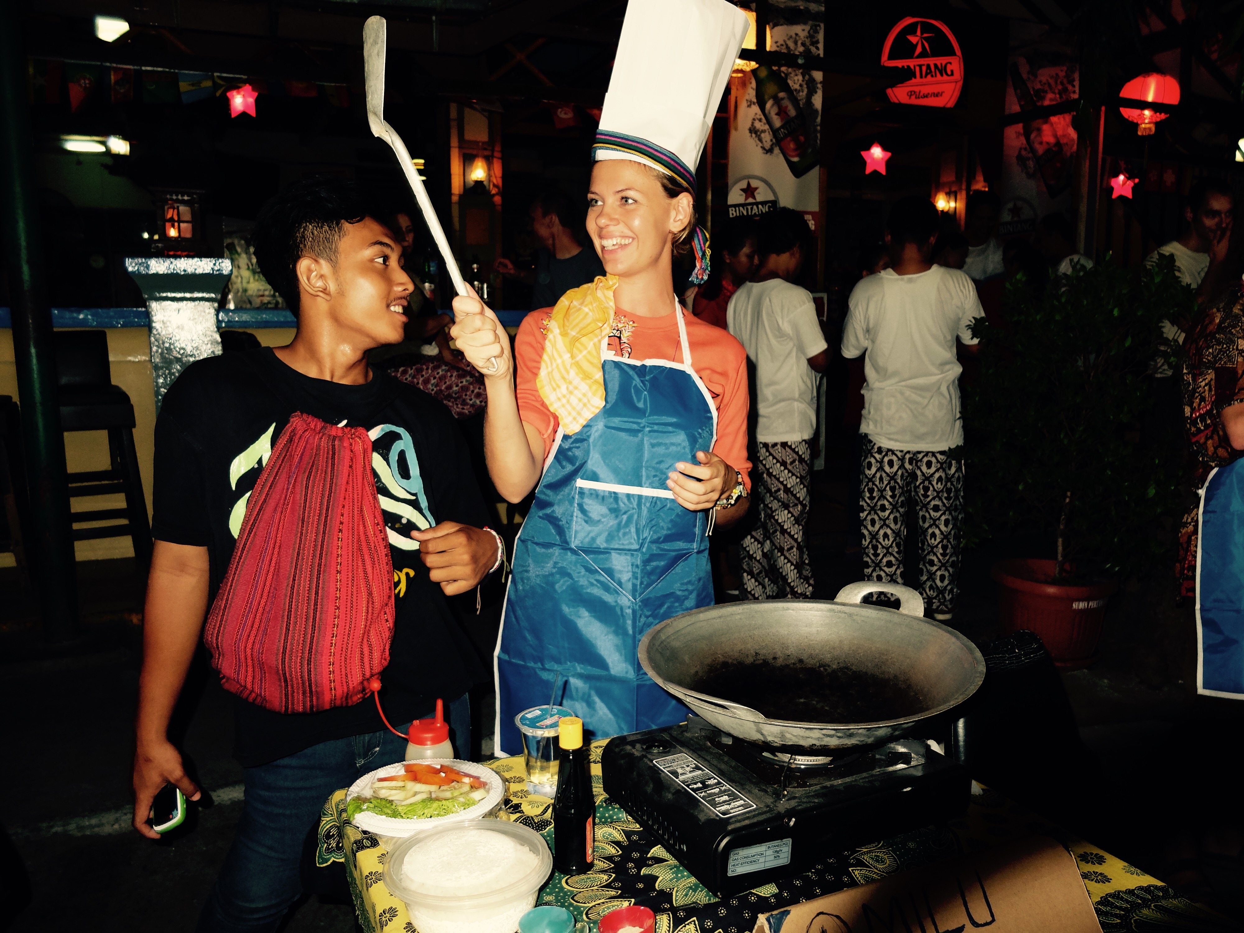Een van de redenen waarom ik moest blijven in Jaksa was omdat er een festival was, wat voor mijn vrienden heel veel betekent. Het is een jaarlijkse ontmoetingsdag voor alle mensen uit Jakarta. Er zijn stands, lekker eten, mensen verkopen spullen en er is muziek. Ik bracht meer tijd door met hen en ik werd gevraagd om s avonds mee te doen aan een Nasi Goreng contest. Grappend zei ik ja natuurlijk, doe ik wel even. Beetje koken, hele tijd niet gedaan. We gingen samen op zoek naar nog meer toeristen, die eigenlijk heel moeilijk te vinden waren. Laagseizoen! We hadden er uiteindelijk genoeg en ik was er een van. Ik kreeg van mijn Javaanse vader uit t hostel, ons huis, een zelf opgeschilderd tshirt met jalan jaksa erop en een sjaaltje uit Lombok. Ik trok het meteen aan en ik hoopte dat het mijn eer een beetje zou redden. Ik had namelijk echt geen idee hoe de authentieke nasi goreng smaakte EN hoe je die moest maken. Super trots was mn java vadertje toen ik daar stond met zijn shirt en sjaaltje, gewapend met een spatel. Ik kon het zien aan zijn gezicht. En ook mijn vrienden waren daar en een van hen smeekte me niet te verliezen. Oké, het is dus best een big deal, dacht ik. Kon alleen weinig veranderen aan t feit dat ik t wel kon bereiden maar niet op smaak kon brengen zoals de indo's dat doen. Ik kreeg een hoge koksmuts en schort.. oké het werd echt heel serieus genomen! Er kwamen afgevaardigden uit Jakarta om het eten te proeven en de looks te beoordelen. Ze waren allemaal heel mooi aangekleed. Er waren hordes mensen toen er na twee uur wachten eindelijk werd afgeteld. Mijn vrienden hielden de spanning bijna niet meer. Ik bakte een ei voor on top om het wat te laten lijken. Er werd geschreeuwd 'more ketjap', 'more chili'. Ik deed braaf maar wat er geroepen werd, van de hoeveelheden had ik geen idee. Er kwam een cameraploeg en we moesten opeens rechtop gaan staan met ons gerecht in de hand. De burgemeester kwam langs om te kijken naar onze gerechten. Hij werd onthaald als een koning. Ik had een glimlach op mijn gezicht die er niet meer afging. De honderden fotos (ook veel selfies) en de vriendelijke mensen. Dan denk je nu dat het verhaal klaar is, maar nee. We werden verzocht om met ons gekregen gratis bier (wat in deze streek nogal prijzig is, vanwege het feit dat de meerderheid moslim is) mee te nemen en mee te lopen. Onderweg nog meer fotos. Canadees Willy vroeg me wat ik met de rode pepers had gedaan. 'Er allemaal ingegooid', antwoordde ik trots. Aan zijn verbaasde gezicht te zien was dat echt wel een beetje teveel van t goede. Ik was echt een Bintang (merk bier maar betekent ook celebrity/star). Heel weird. We mochten op fancy stoelen zitten en werden ook nog gevoed. Daarna werden we een voor een naar voren gehaald. Met een hele aankondiging. Bizar. We kregen cadeaus en de nummer 1, geld. Dat was ik dus niet, de halloween smilie op het ei had niet geholpen. Maar toen gratis Bintang en ik zag de blik van Risma, zij was niet happy tussen de toeristen. En ik was ook wel weer ff klaar. Mijn vrienden uit Jakarta namen me mee, naar waar wist ik niet maar ik moest me serieus aankleden en nu komt het … sexy! Ik stak mezelf in de enige jurkje die in mijn backpack te vinden is en .. geen high heels… Ze probeerden me in hun maatje 37 schoenen te proppen, maar deze Belanda voeten zijn veel te groot. Dus het werd toch echt Nikies aantrekken onder het jurkje! Lekker stampen. Kon ermee door vonden ze. Not to bad. Fair enough. We reden naar de verrassingsplek.. het bleek een vijfsterren hotel, heel groot, met een ondergrondse club. De Canadees kwam er niet in met sandalen en gescheurde broek, backpackerstijl. Ik verschool mijn schoenen.. Die avond heb ik sugardaddy's uitgekleed door drankje naar drankje te krijgen, die natuurlijk onbetaalbaar waren. Wat een avond. En ik mis mijn vriendjes nu al ontzettend. Ze hebben mij alles gegeven en ik hen. En het afscheid nemen een dag later viel me zwaar. Ik ben zoveel over hen te weten gekomen, allen hebben ze een verhaal. Voor altijd bij me draag ik ze, deze mensen. Hopend op nog meer van dit soort ervaringen denk ik hier nog even over na. Zorg voor elkaar daar in Nederland, vergeet elkaar niet!