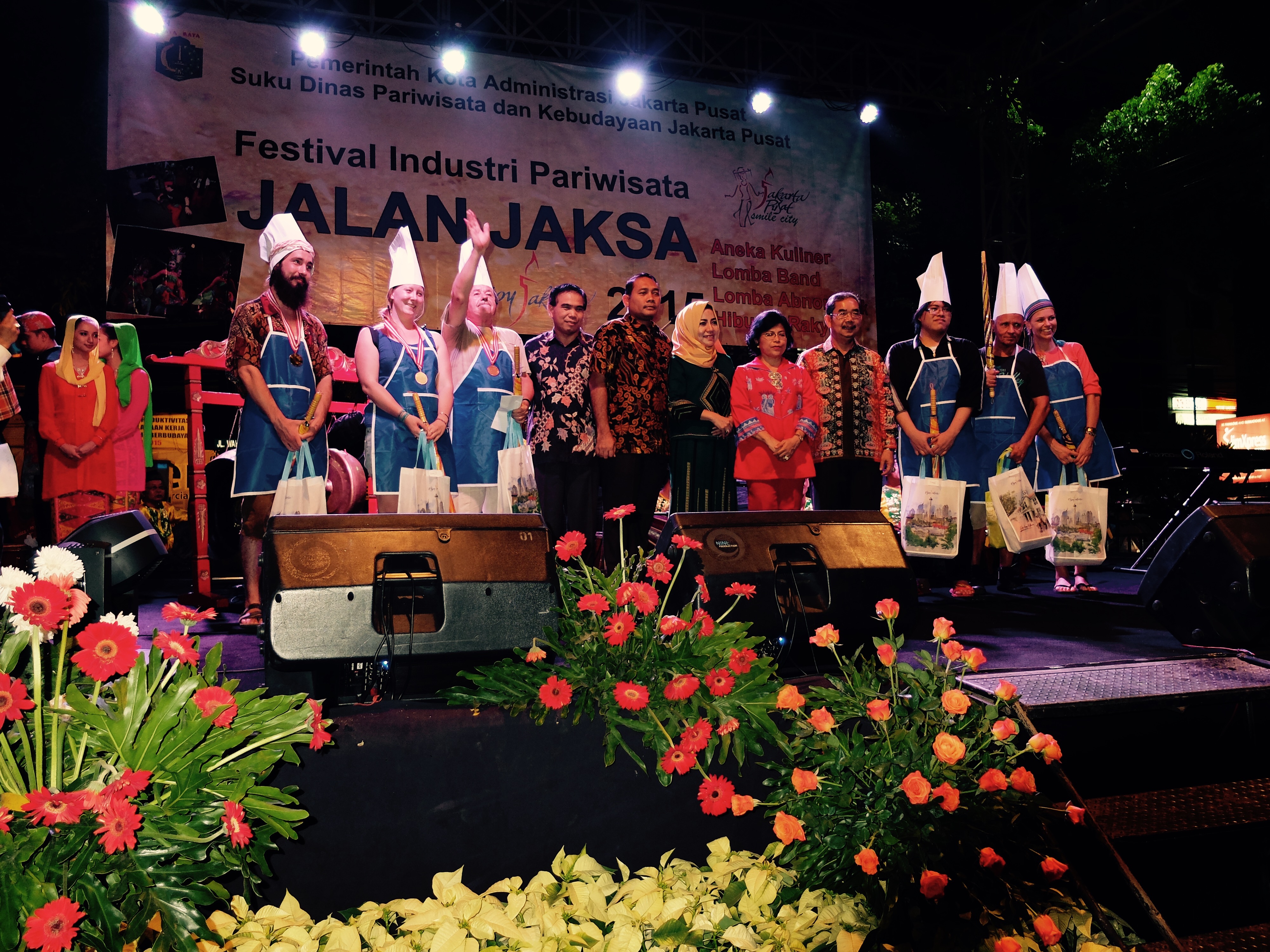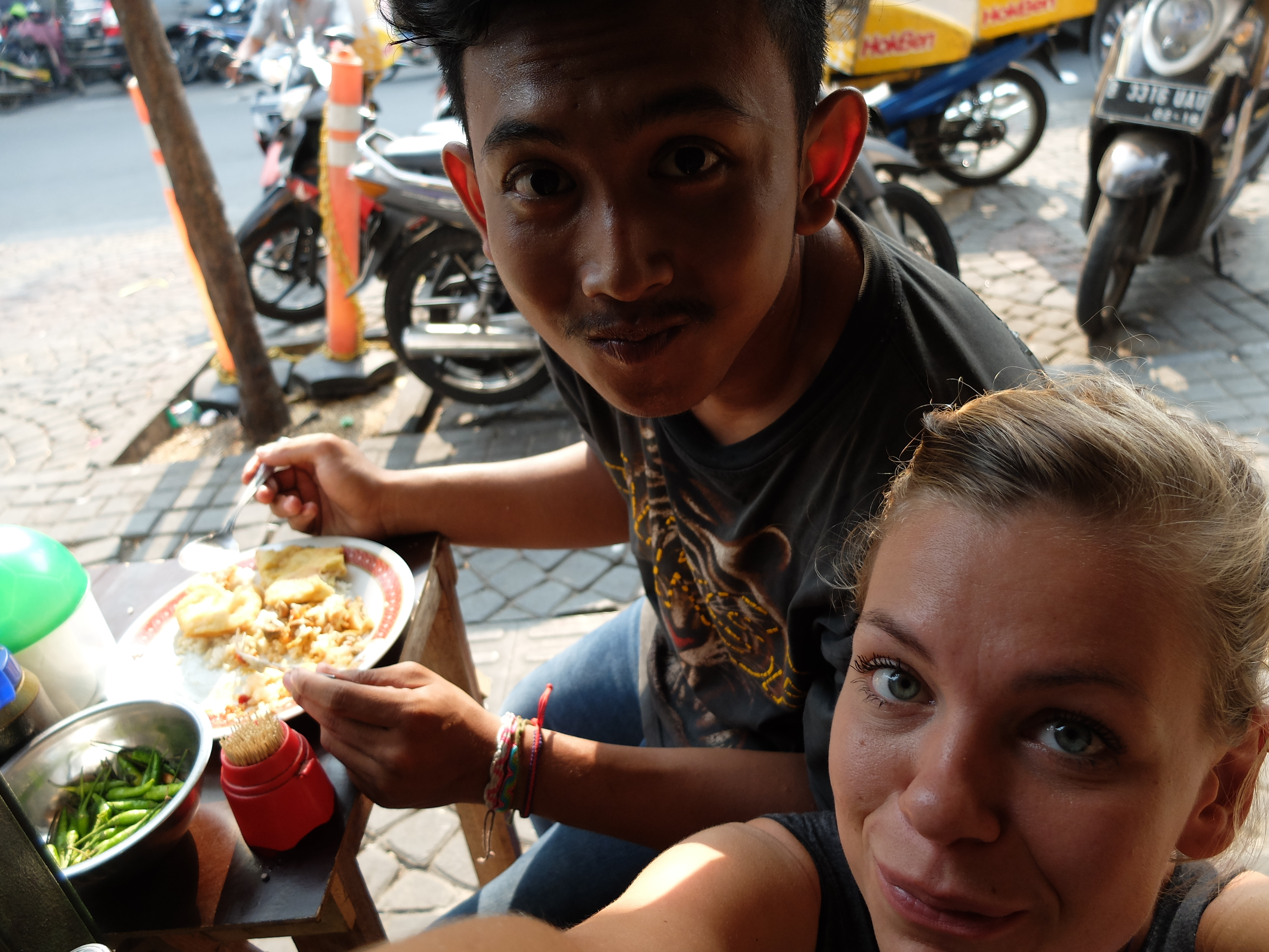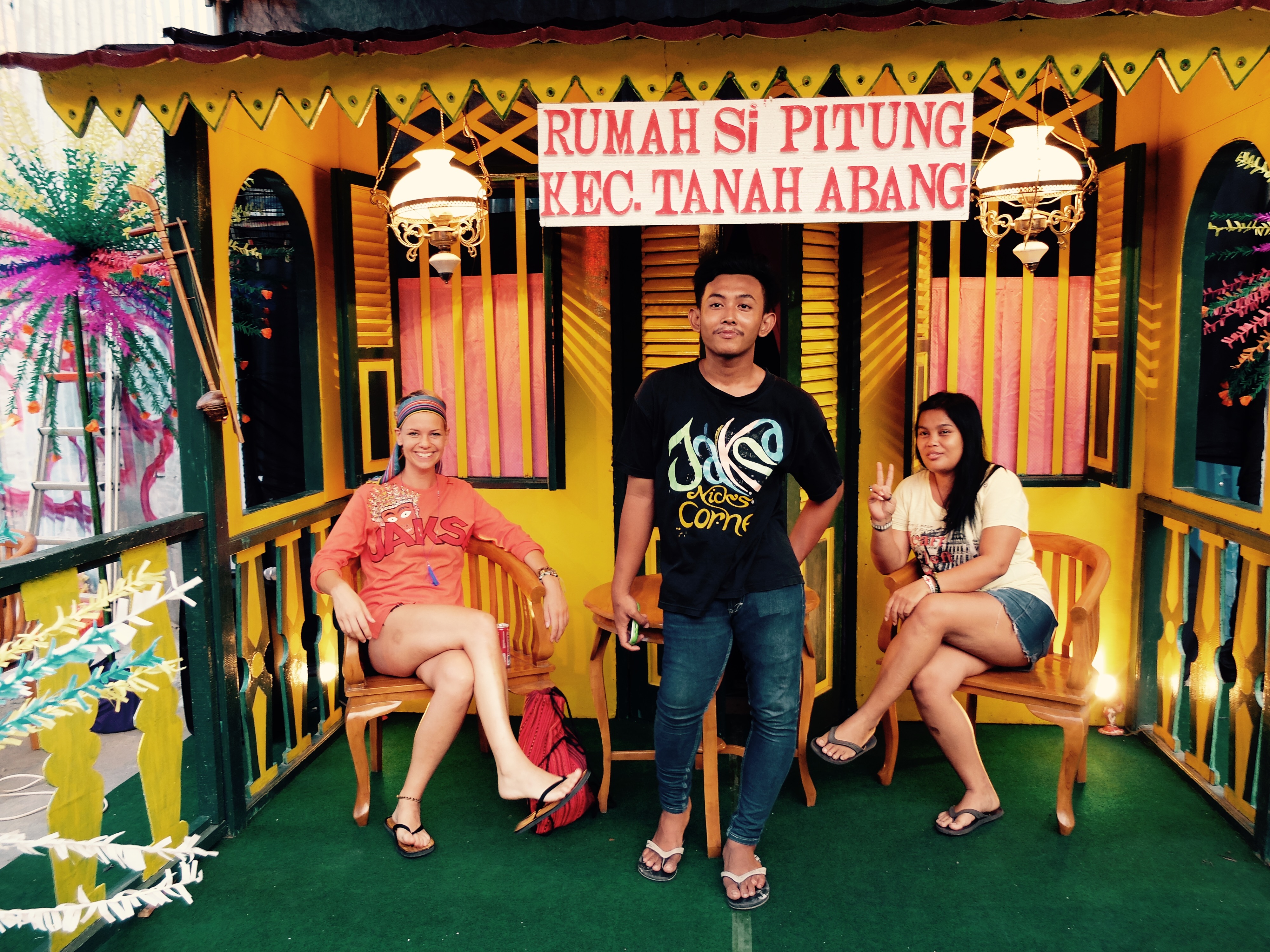 Een van de redenen waarom ik moest blijven in Jaksa was omdat er een festival was, wat voor mijn vrienden heel veel betekent. Het is een jaarlijkse ontmoetingsdag voor alle mensen uit Jakarta. Er zijn stands, lekker eten, mensen verkopen spullen en er is muziek. Ik bracht meer tijd door met hen en ik werd gevraagd om s avonds mee te doen aan een Nasi Goreng contest. Grappend zei ik ja natuurlijk, doe ik wel even. Beetje koken, hele tijd niet gedaan. We gingen samen op zoek naar nog meer toeristen, die eigenlijk heel moeilijk te vinden waren. Laagseizoen! We hadden er uiteindelijk genoeg en ik was er een van. Ik kreeg van mijn Javaanse vader uit t hostel, ons huis, een zelf opgeschilderd tshirt met jalan jaksa erop en een sjaaltje uit Lombok. Ik trok het meteen aan en ik hoopte dat het mijn eer een beetje zou redden. Ik had namelijk echt geen idee hoe de authentieke nasi goreng smaakte EN hoe je die moest maken. Super trots was mn java vadertje toen ik daar stond met zijn shirt en sjaaltje, gewapend met een spatel. Ik kon het zien aan zijn gezicht. En ook mijn vrienden waren daar en een van hen smeekte me niet te verliezen. Oké, het is dus best een big deal, dacht ik. Kon alleen weinig veranderen aan t feit dat ik t wel kon bereiden maar niet op smaak kon brengen zoals de indo's dat doen. Ik kreeg een hoge koksmuts en schort.. oké het werd echt heel serieus genomen! Er kwamen afgevaardigden uit Jakarta om het eten te proeven en de looks te beoordelen. Ze waren allemaal heel mooi aangekleed. Er waren hordes mensen toen er na twee uur wachten eindelijk werd afgeteld. Mijn vrienden hielden de spanning bijna niet meer. Ik bakte een ei voor on top om het wat te laten lijken. Er werd geschreeuwd 'more ketjap', 'more chili'. Ik deed braaf maar wat er geroepen werd, van de hoeveelheden had ik geen idee. Er kwam een cameraploeg en we moesten opeens rechtop gaan staan met ons gerecht in de hand. De burgemeester kwam langs om te kijken naar onze gerechten. Hij werd onthaald als een koning. Ik had een glimlach op mijn gezicht die er niet meer afging. De honderden fotos (ook veel selfies) en de vriendelijke mensen. Dan denk je nu dat het verhaal klaar is, maar nee. We werden verzocht om met ons gekregen gratis bier (wat in deze streek nogal prijzig is, vanwege het feit dat de meerderheid moslim is) mee te nemen en mee te lopen. Onderweg nog meer fotos. Canadees Willy vroeg me wat ik met de rode pepers had gedaan. 'Er allemaal ingegooid', antwoordde ik trots. Aan zijn verbaasde gezicht te zien was dat echt wel een beetje teveel van t goede. Ik was echt een Bintang (merk bier maar betekent ook celebrity/star). Heel weird. We mochten op fancy stoelen zitten en werden ook nog gevoed. Daarna werden we een voor een naar voren gehaald. Met een hele aankondiging. Bizar. We kregen cadeaus en de nummer 1, geld. Dat was ik dus niet, de halloween smilie op het ei had niet geholpen. Maar toen gratis Bintang en ik zag de blik van Risma, zij was niet happy tussen de toeristen. En ik was ook wel weer ff klaar. Mijn vrienden uit Jakarta namen me mee, naar waar wist ik niet maar ik moest me serieus aankleden en nu komt het … sexy! Ik stak mezelf in de enige jurkje die in mijn backpack te vinden is en .. geen high heels… Ze probeerden me in hun maatje 37 schoenen te proppen, maar deze Belanda voeten zijn veel te groot. Dus het werd toch echt Nikies aantrekken onder het jurkje! Lekker stampen. Kon ermee door vonden ze. Not to bad. Fair enough. We reden naar de verrassingsplek.. het bleek een vijfsterren hotel, heel groot, met een ondergrondse club. De Canadees kwam er niet in met sandalen en gescheurde broek, backpackerstijl. Ik verschool mijn schoenen.. Die avond heb ik sugardaddy's uitgekleed door drankje naar drankje te krijgen, die natuurlijk onbetaalbaar waren. Wat een avond. En ik mis mijn vriendjes nu al ontzettend. Ze hebben mij alles gegeven en ik hen. En het afscheid nemen een dag later viel me zwaar. Ik ben zoveel over hen te weten gekomen, allen hebben ze een verhaal. Voor altijd bij me draag ik ze, deze mensen. Hopend op nog meer van dit soort ervaringen denk ik hier nog even over na. Zorg voor elkaar daar in Nederland, vergeet elkaar niet!