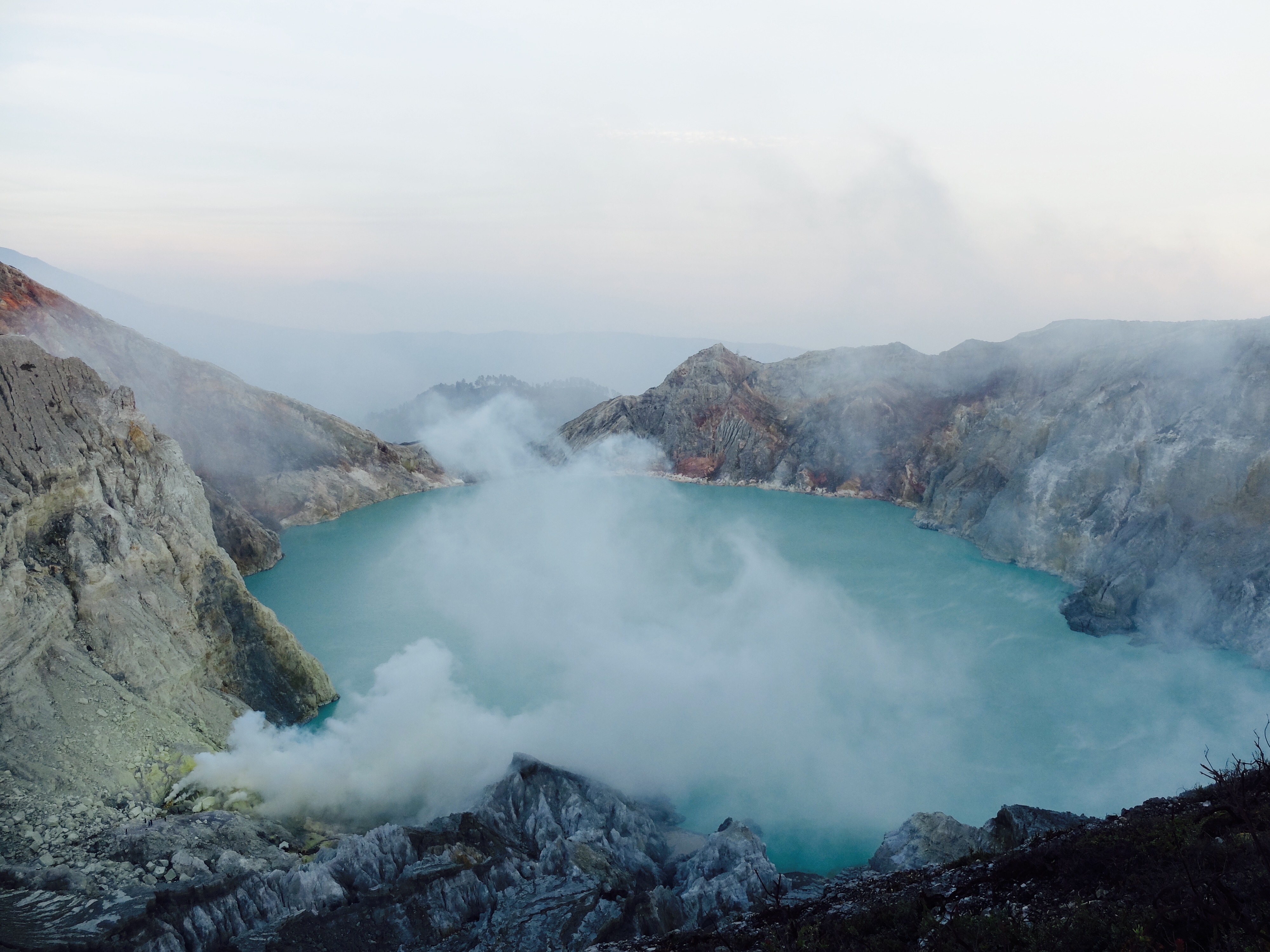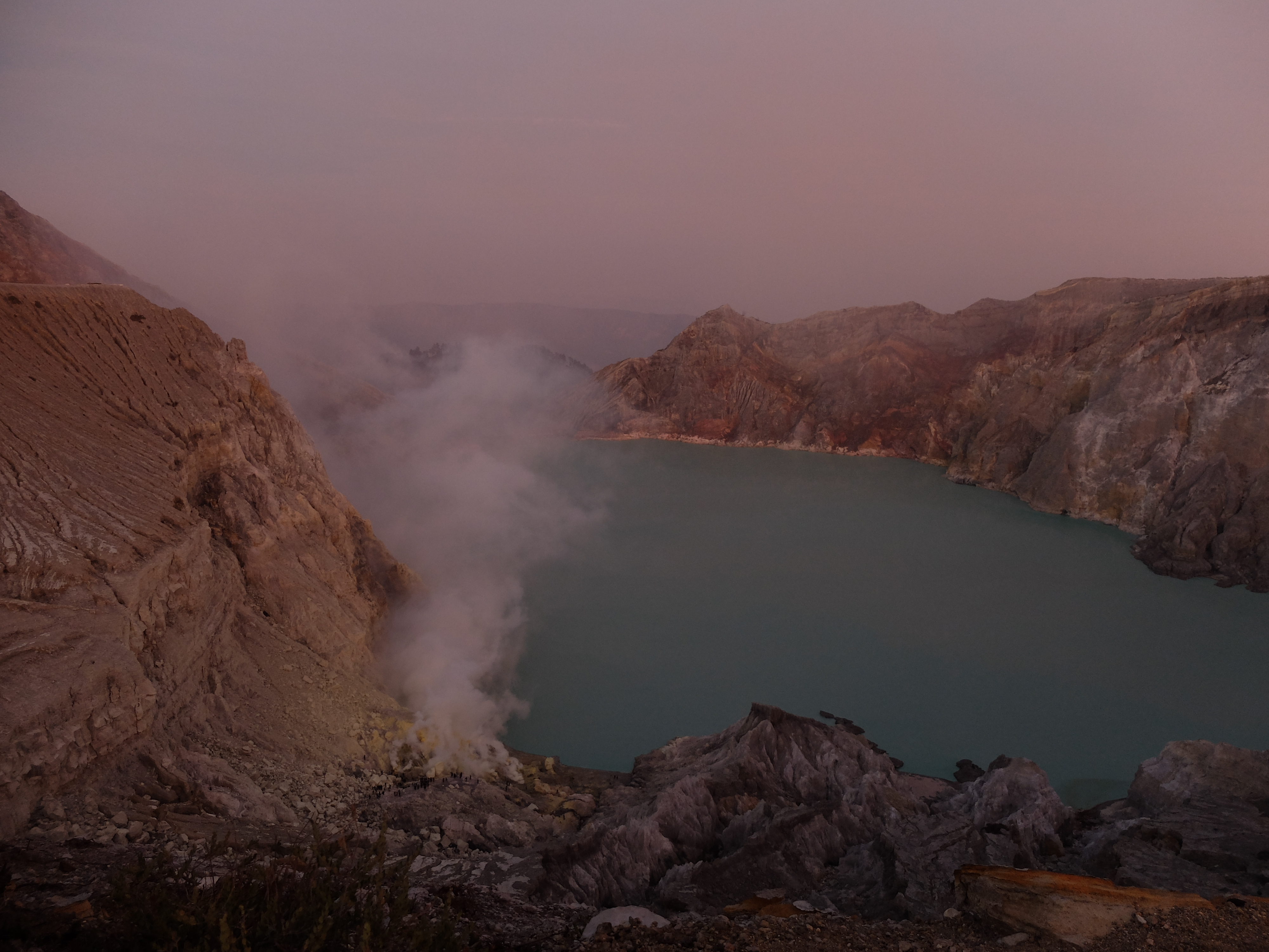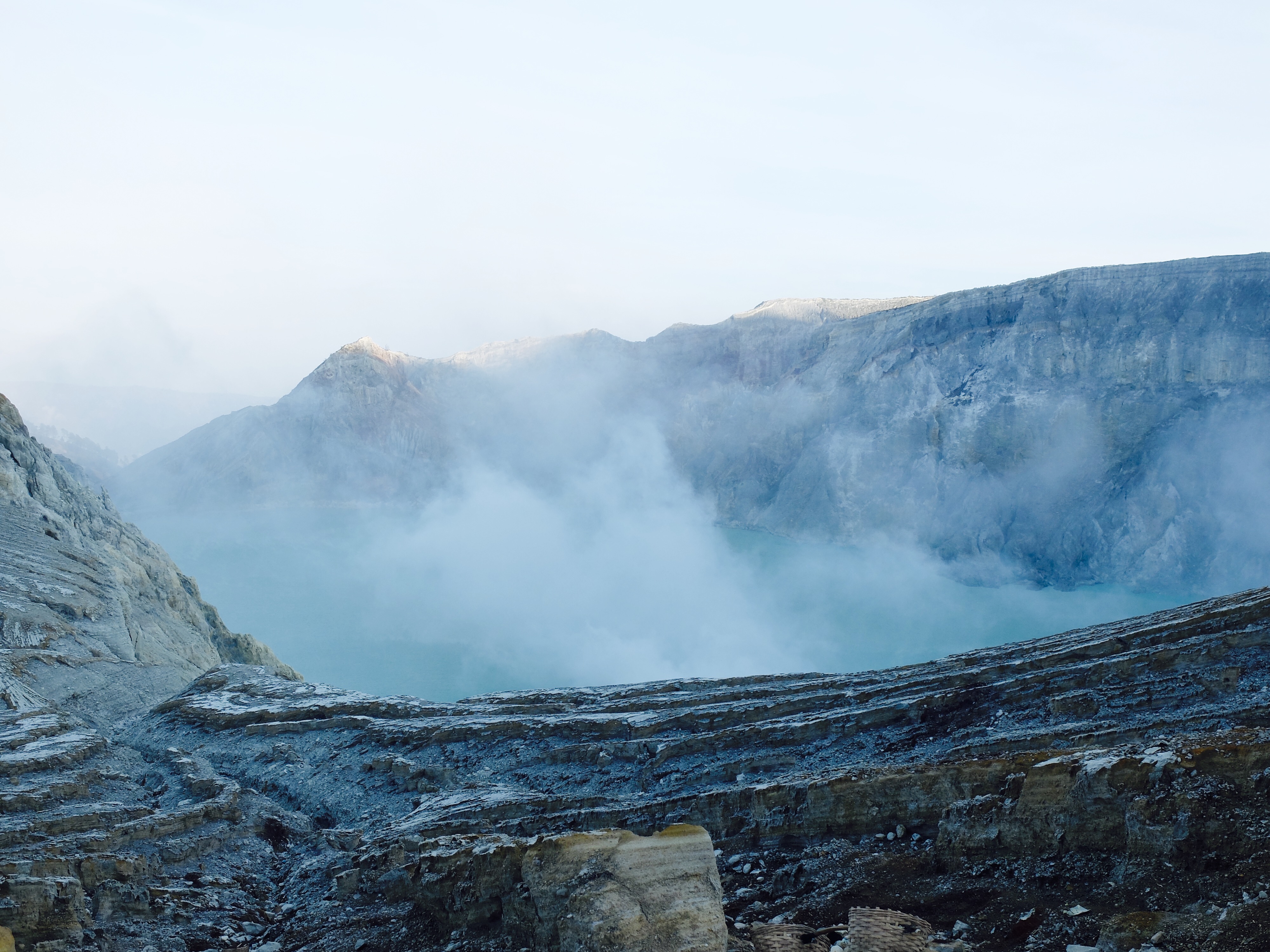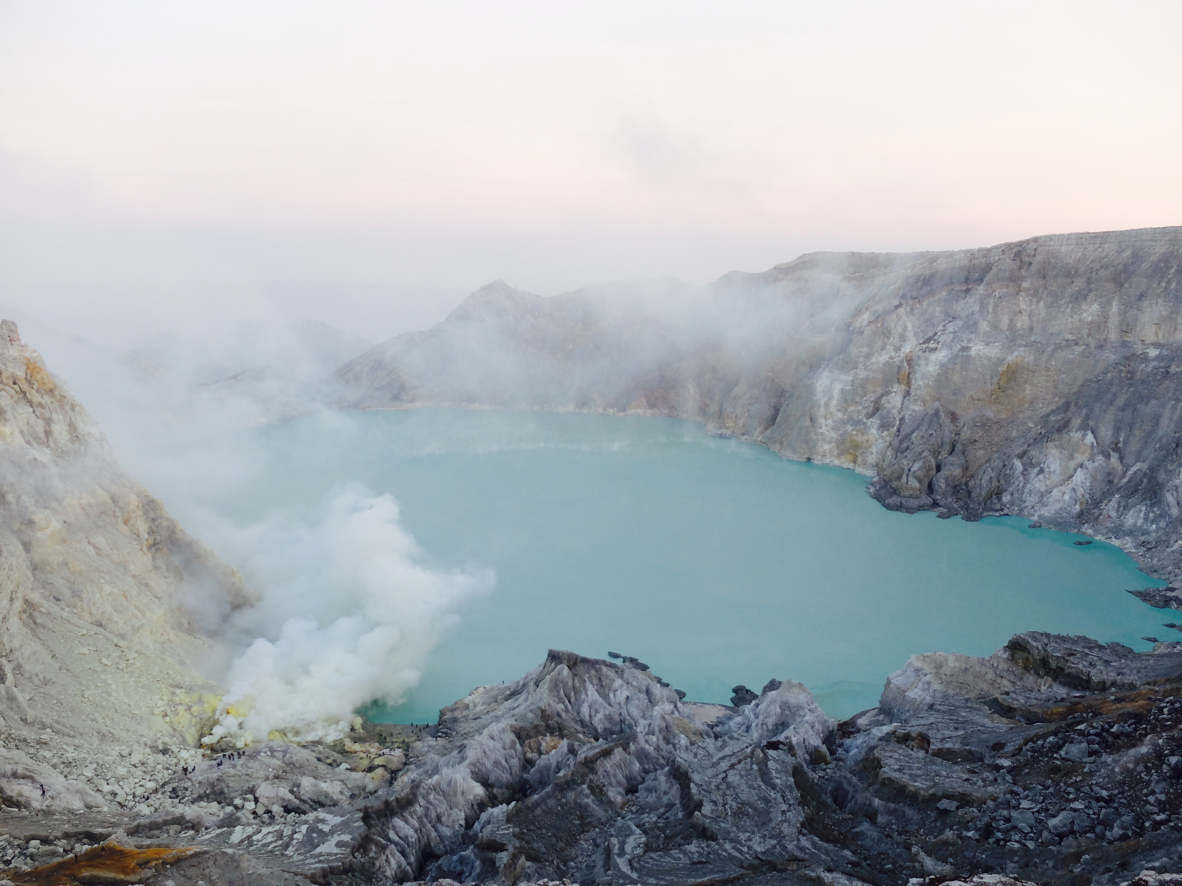 Uiteindelijk aangekomen in een guesthouse dichtbij de vulkaan. Die nacht om 1.30 opgestaan, om het blauwe vuur goed te kunnen zien in de nacht. Na mijn eerste kennismaking met vulkaan Semeru afgelopen jaar, had ik een lichte traumatische ervaring. En wat is de beste manier om een traumatische ervaring te verzachten of te verwerken..? Ik was dus best gespannen. De weg ernaartoe was niet te vergelijken met de Semeru maar sommige stukken waren best pittig. Onderweg werden gasmaskers verhuurd voor een aardige som, het is duidelijk dat de locals geld willen maken. Ik had echter wel mijn twijfels, bijna iedereen had er een. Na de afdaling in de krater kwamen we aan bij het blauwe vuur. Het was niet te geloven, zo indrukwekkend. Er kwamen grote wolken vanaf, maar de wind stond gunstig. We stonden heel dichtbij en waren een van de eersten, we hadden de hike op topsnelheid gedaan. Ik ging helemaal op in het fenomeen en Landon ook. Daardoor zagen we het gevaar van de rook die van het vuur afkwam niet en het overviel ons als een verstikkend deken. Ik probeerde adem te halen maar het werd alleen maar erger. Het brandde in mijn longen en ogen en het enige waar ik aan dacht was dat damn gasmasker wat ik had moeten huren. Ik draaide me half om naar Lando en wees naar de weg terug. Ik kroop omhoog, probeerde mijn vest uit mijn tas te halen, waardoor mijn camera op het gesteente viel. Ook dat nog, camera stuk, dacht ik. Ik drukte het vest tegen mijn mond en neus maar het hielp niets. Ik stikte bijna en mensen liepen heel droog voorbij. Toen ik mezelf opgetrokken had aan de stenen en mijn zicht wat beter werd, zag ik een gids lopen en er bungelde een gasmasker in zijn hand. Ik kroop naar hem toen en griste het uit zijn hand en drukte t op mijn gezicht. Ik denk dat hij aan mijn gezicht zag hoe desperate ik was. Maar ik wilde terug, niet alleen om nog meer van het blauwe vuur te zien maar moest ook Lando vinden die nog altijd daar was. De gids vroeg of ik mee wilde lopen en met knikkende knieën ging ik terug. Daar stond ik weer. Het was nog mooier dan de eerste keer. Maar het gasmasker hielp nauwelijks. Bij de tweede wolk kreeg ik minder binnen, maar het was toch heftig. Ik riep Landons naam maar kreeg geen gehoor. Ik besloot op dezelfde plek te blijven en gewoon af te wachten. En uit het niets was hij daar en hij trok me mee naar een lager gedeelte waar het zicht nog beter was. Hij vertelde me in een aantal woorden dat hij dezelfde ervaring had als ik. De volgende wolk die kwam, hurkte ik, hield ik mijn adem in en verborg ik mijn hoofd in mijn armen. Na een aantal minuten zijn we omhoog geklommen en het werd langzaam aan al licht. Toen we op de rand van de krater stonden kon ik zien waar we gestaan hadden en ook hoe gevaarlijk het is. En het uitzicht was fantastisch. Elke minuut veranderde het daglicht en de sfeer, dat kun je op de fotos zien. Er was niemand. Het water in de krater turqoise, de plek waar we hadden gestaan geel van het zwavel, het gesteente ijzig grijs, de hemel kleurde langzaam. Het gebergte achter ons immens en bruin en heel groen. Nog nooit in mijn leven zo iets gezien. Het was het half doodgaan dubbel en dik waard. En achja, ben niet voor niets gestopt met roken. We spraken over het feit dat locals de zwavel winnen en daar lang achter elkaar zijn, zonder gasmasker. Ongelofelijk.