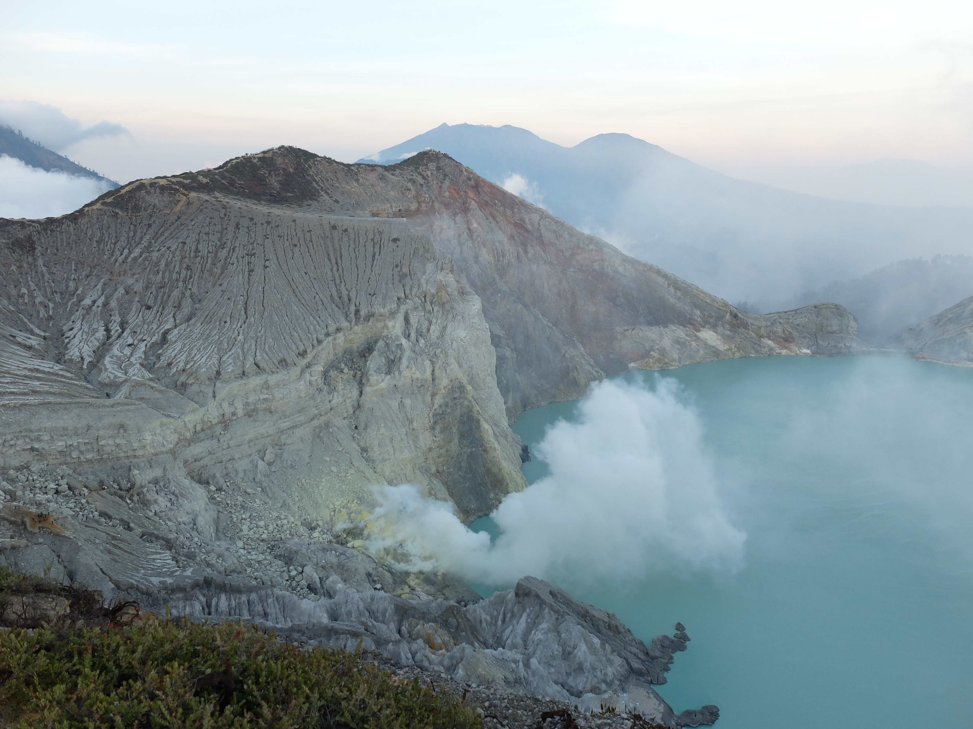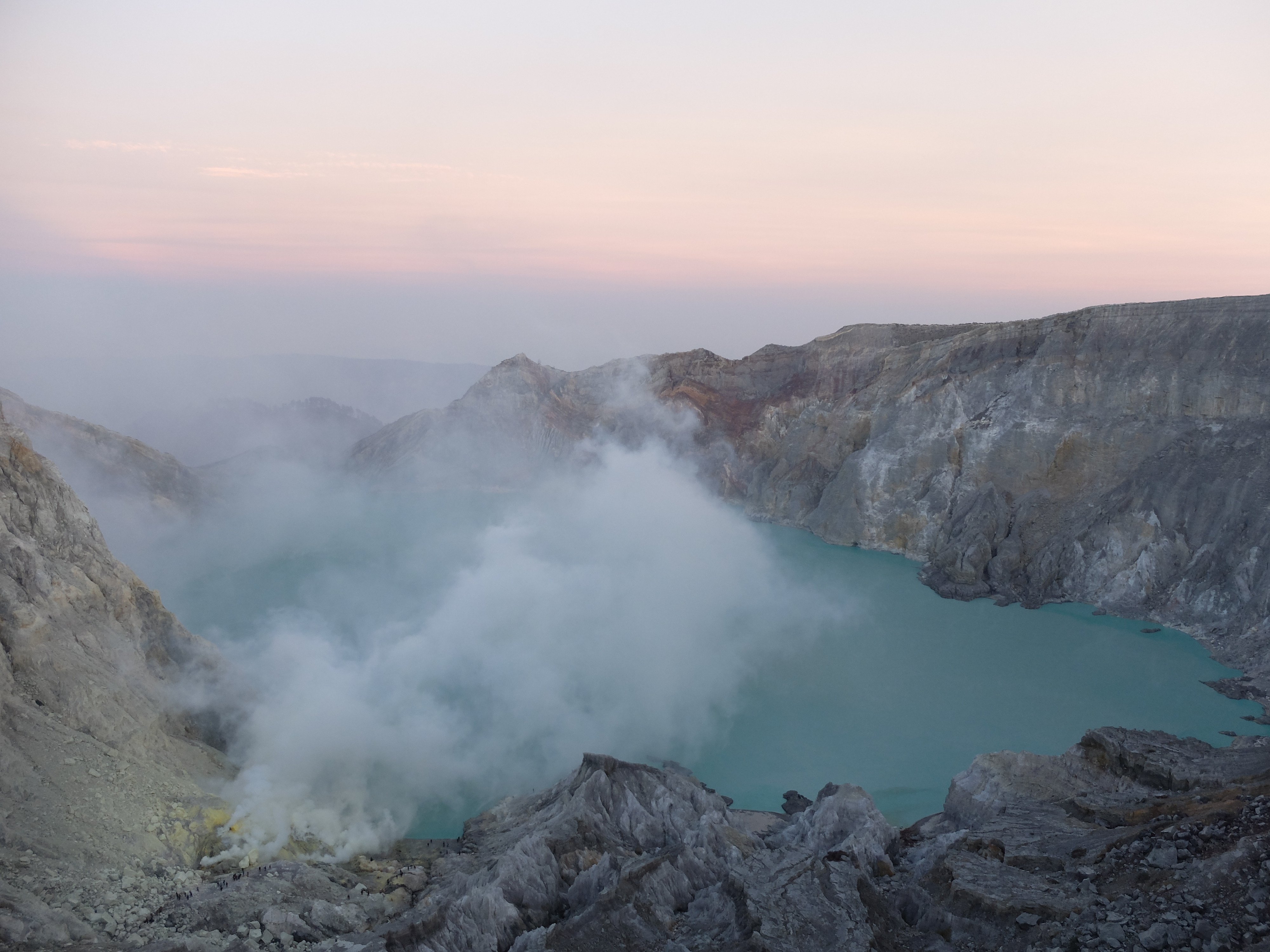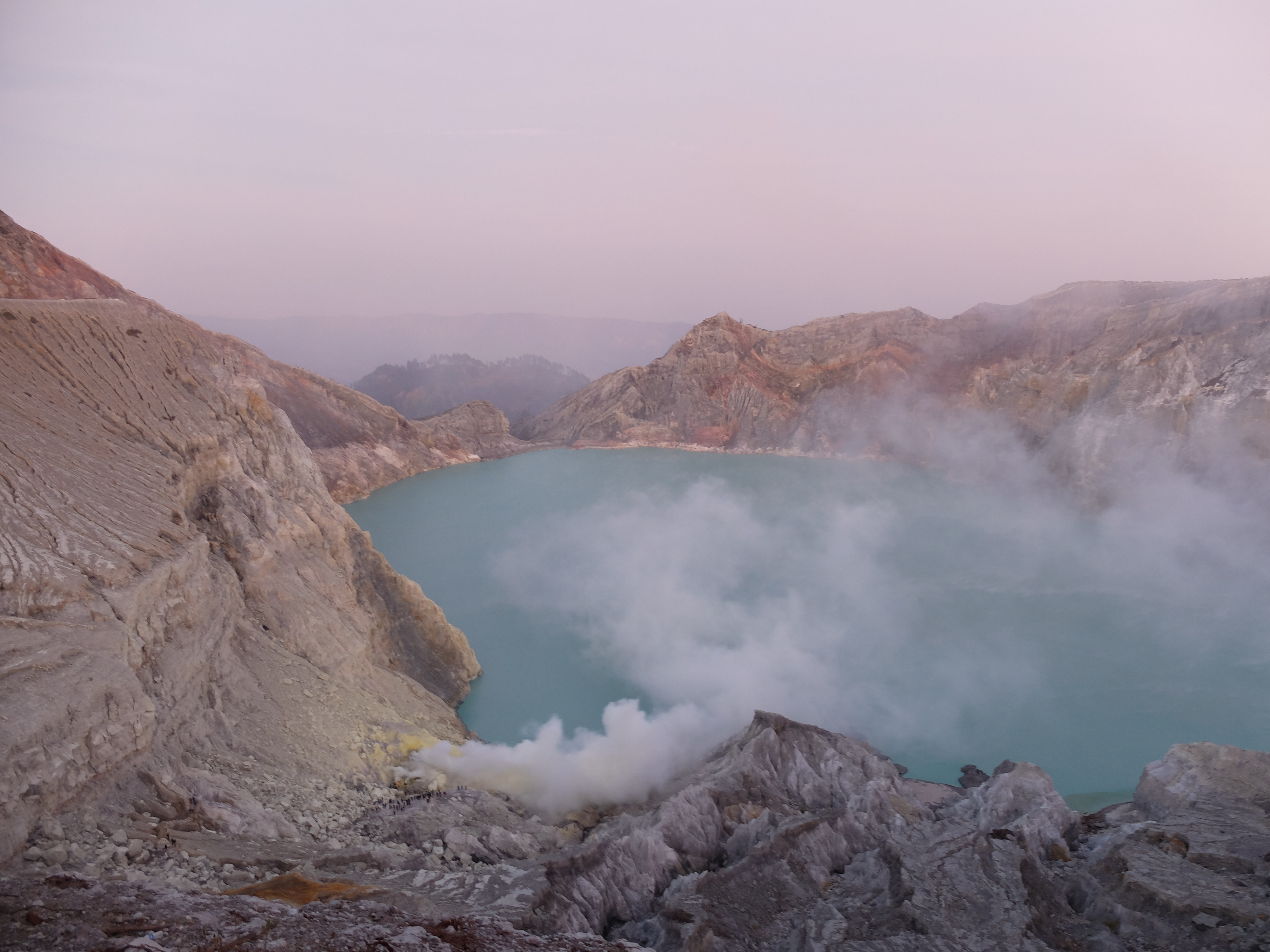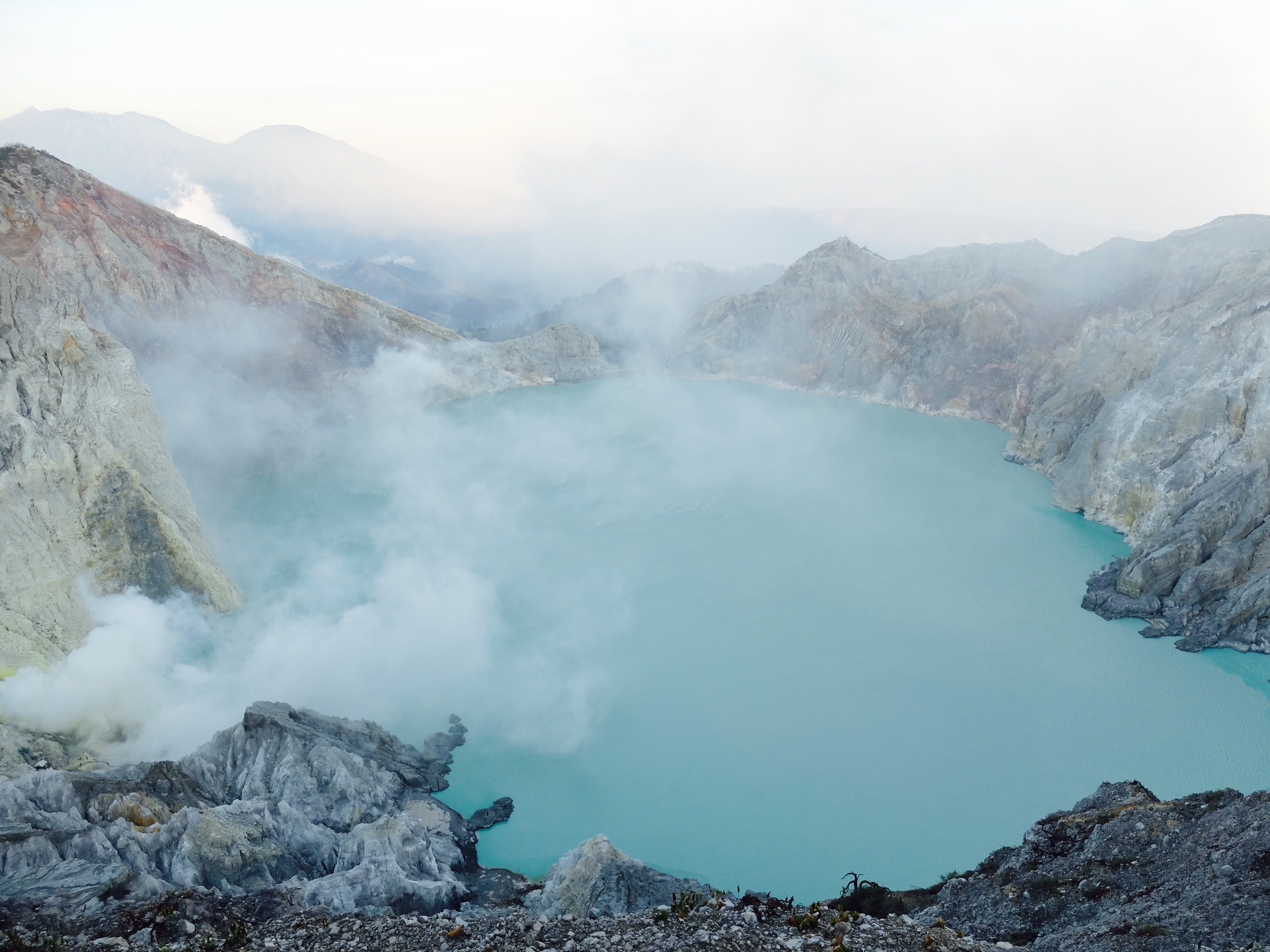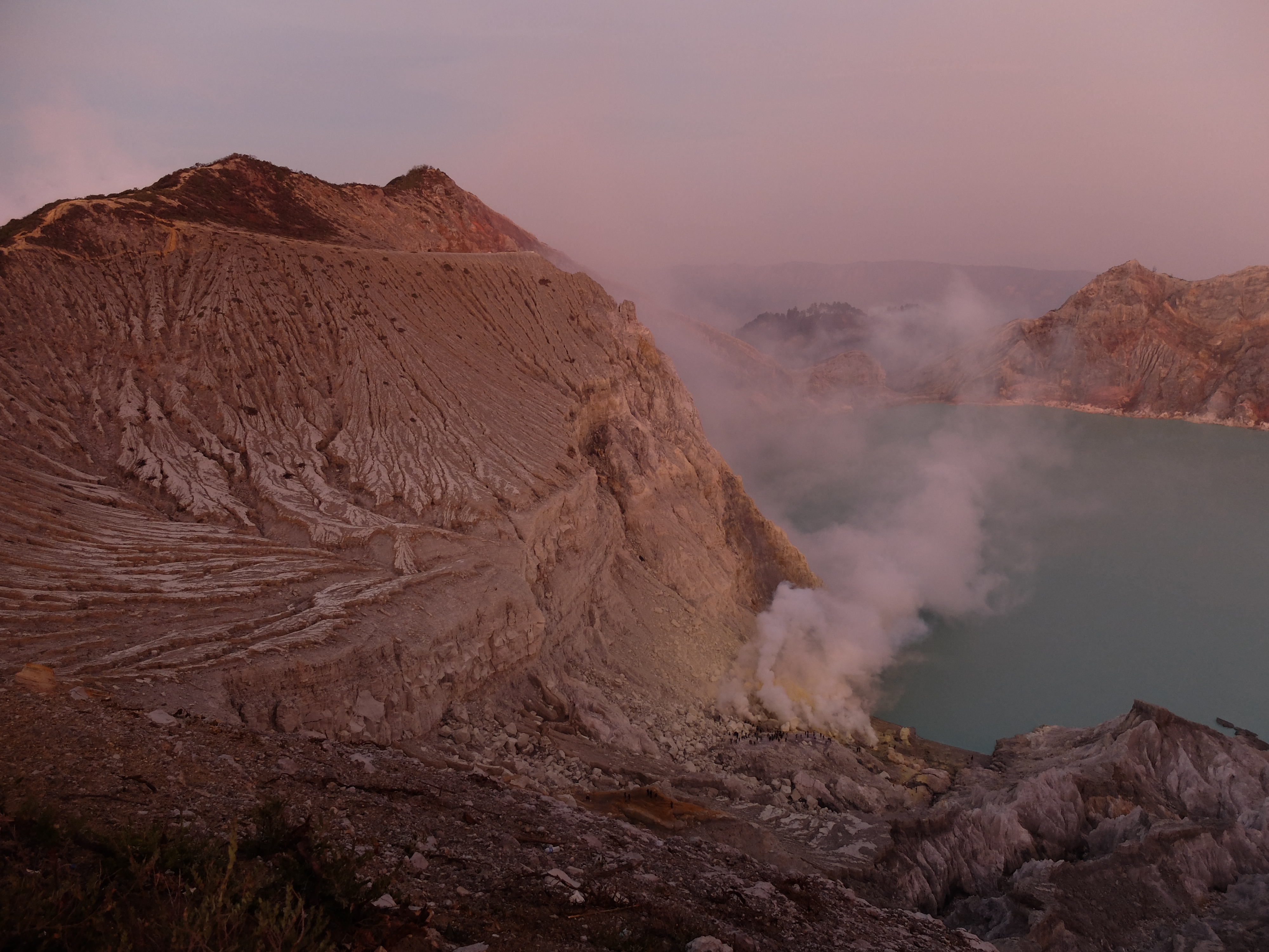 Uiteindelijk aangekomen in een guesthouse dichtbij de vulkaan. Die nacht om 1.30 opgestaan, om het blauwe vuur goed te kunnen zien in de nacht. Na mijn eerste kennismaking met vulkaan Semeru afgelopen jaar, had ik een lichte traumatische ervaring. En wat is de beste manier om een traumatische ervaring te verzachten of te verwerken..? Ik was dus best gespannen. De weg ernaartoe was niet te vergelijken met de Semeru maar sommige stukken waren best pittig. Onderweg werden gasmaskers verhuurd voor een aardige som, het is duidelijk dat de locals geld willen maken. Ik had echter wel mijn twijfels, bijna iedereen had er een. Na de afdaling in de krater kwamen we aan bij het blauwe vuur. Het was niet te geloven, zo indrukwekkend. Er kwamen grote wolken vanaf, maar de wind stond gunstig. We stonden heel dichtbij en waren een van de eersten, we hadden de hike op topsnelheid gedaan. Ik ging helemaal op in het fenomeen en Landon ook. Daardoor zagen we het gevaar van de rook die van het vuur afkwam niet en het overviel ons als een verstikkend deken. Ik probeerde adem te halen maar het werd alleen maar erger. Het brandde in mijn longen en ogen en het enige waar ik aan dacht was dat damn gasmasker wat ik had moeten huren. Ik draaide me half om naar Lando en wees naar de weg terug. Ik kroop omhoog, probeerde mijn vest uit mijn tas te halen, waardoor mijn camera op het gesteente viel. Ook dat nog, camera stuk, dacht ik. Ik drukte het vest tegen mijn mond en neus maar het hielp niets. Ik stikte bijna en mensen liepen heel droog voorbij. Toen ik mezelf opgetrokken had aan de stenen en mijn zicht wat beter werd, zag ik een gids lopen en er bungelde een gasmasker in zijn hand. Ik kroop naar hem toen en griste het uit zijn hand en drukte t op mijn gezicht. Ik denk dat hij aan mijn gezicht zag hoe desperate ik was. Maar ik wilde terug, niet alleen om nog meer van het blauwe vuur te zien maar moest ook Lando vinden die nog altijd daar was. De gids vroeg of ik mee wilde lopen en met knikkende knieën ging ik terug. Daar stond ik weer. Het was nog mooier dan de eerste keer. Maar het gasmasker hielp nauwelijks. Bij de tweede wolk kreeg ik minder binnen, maar het was toch heftig. Ik riep Landons naam maar kreeg geen gehoor. Ik besloot op dezelfde plek te blijven en gewoon af te wachten. En uit het niets was hij daar en hij trok me mee naar een lager gedeelte waar het zicht nog beter was. Hij vertelde me in een aantal woorden dat hij dezelfde ervaring had als ik. De volgende wolk die kwam, hurkte ik, hield ik mijn adem in en verborg ik mijn hoofd in mijn armen. Na een aantal minuten zijn we omhoog geklommen en het werd langzaam aan al licht. Toen we op de rand van de krater stonden kon ik zien waar we gestaan hadden en ook hoe gevaarlijk het is. En het uitzicht was fantastisch. Elke minuut veranderde het daglicht en de sfeer, dat kun je op de fotos zien. Er was niemand. Het water in de krater turqoise, de plek waar we hadden gestaan geel van het zwavel, het gesteente ijzig grijs, de hemel kleurde langzaam. Het gebergte achter ons immens en bruin en heel groen. Nog nooit in mijn leven zo iets gezien. Het was het half doodgaan dubbel en dik waard. En achja, ben niet voor niets gestopt met roken. We spraken over het feit dat locals de zwavel winnen en daar lang achter elkaar zijn, zonder gasmasker. Ongelofelijk.