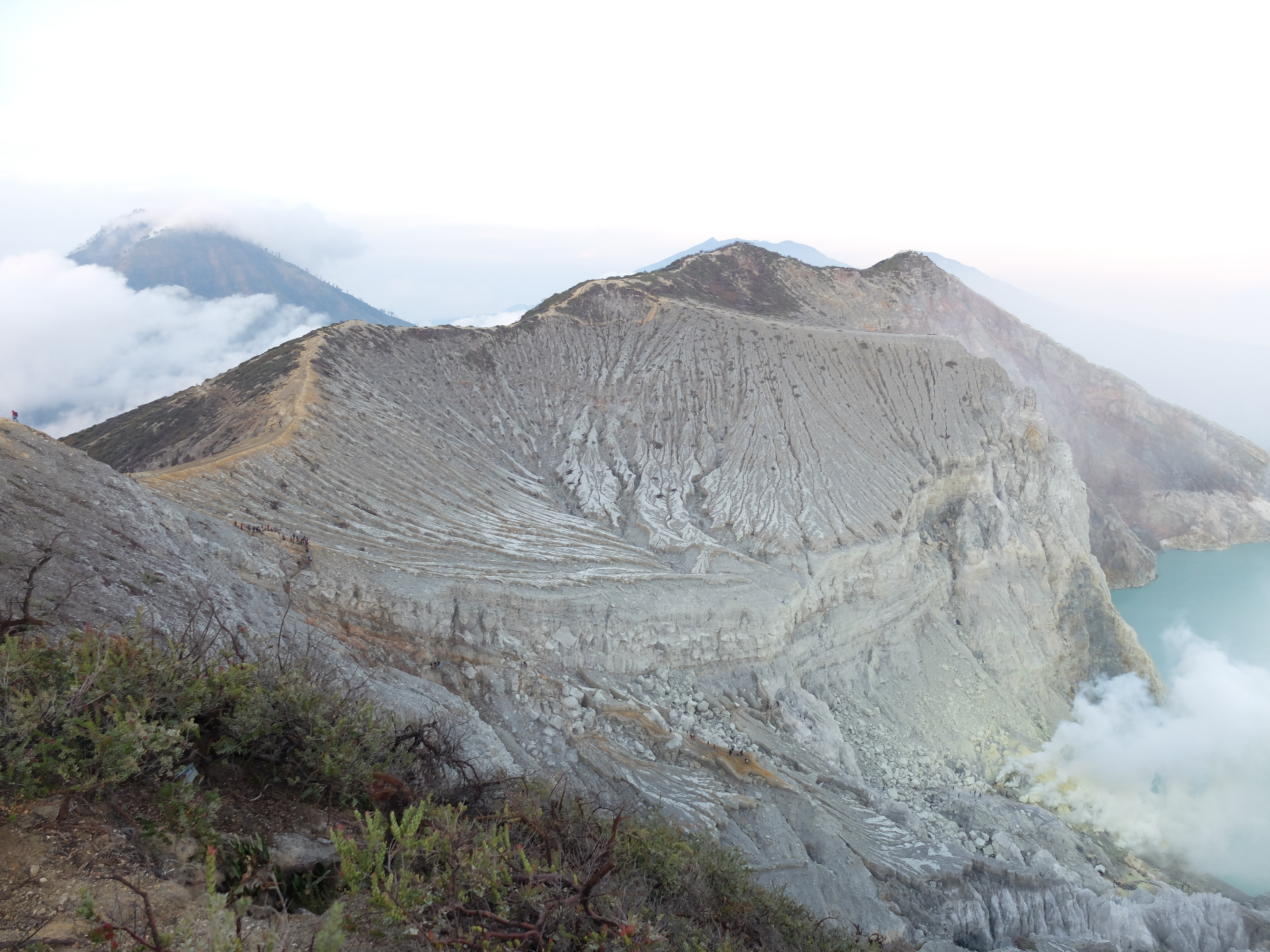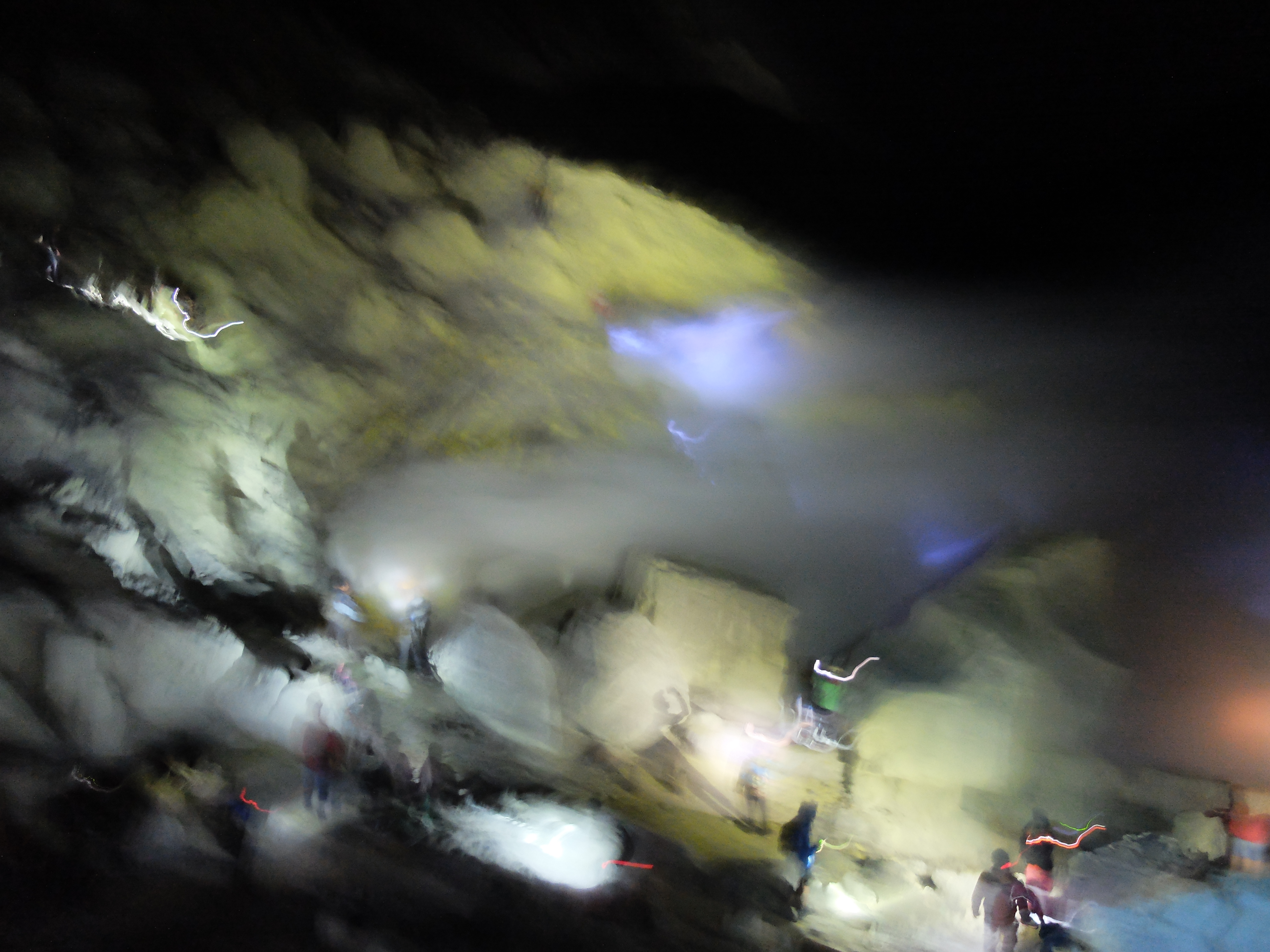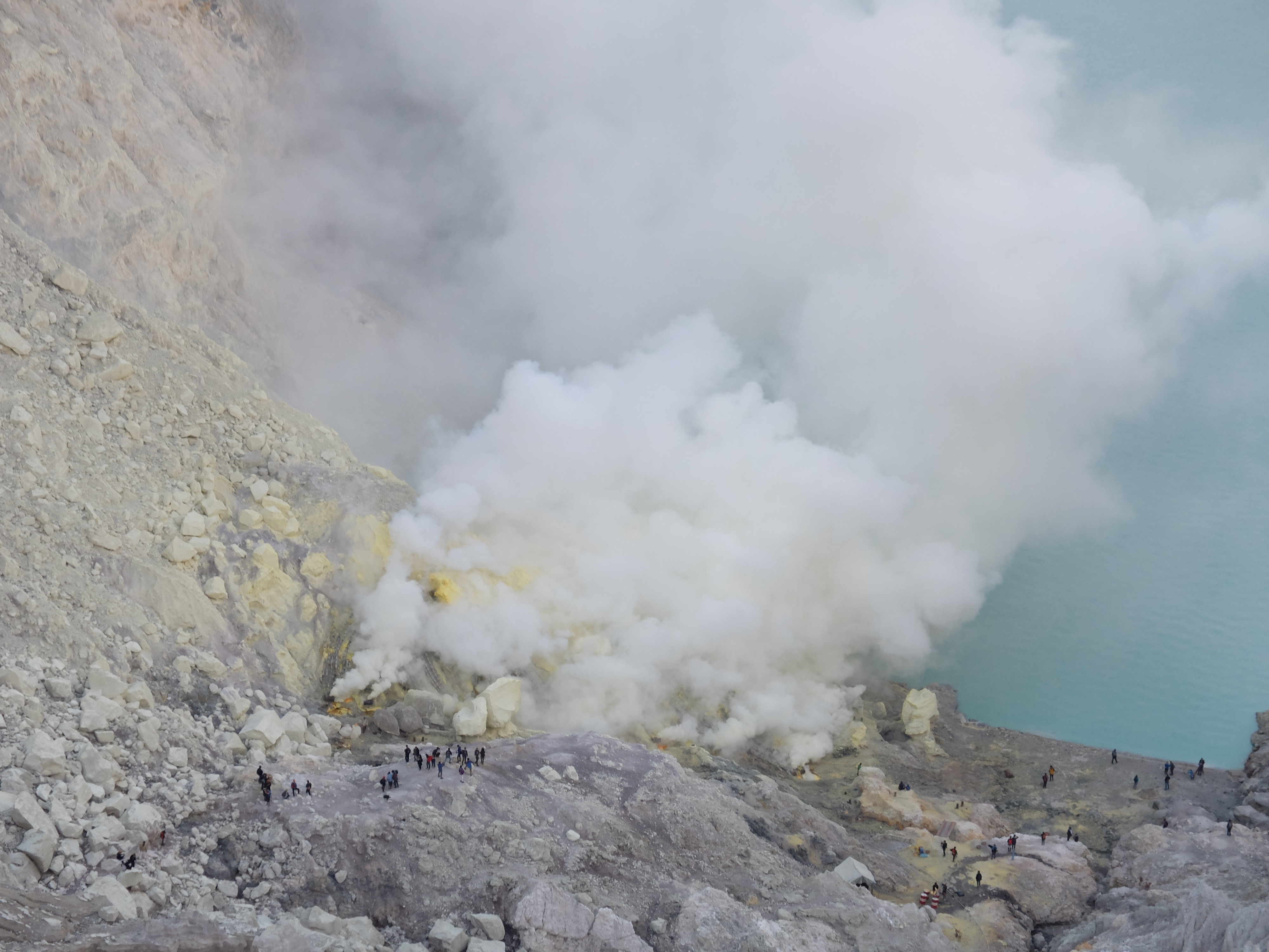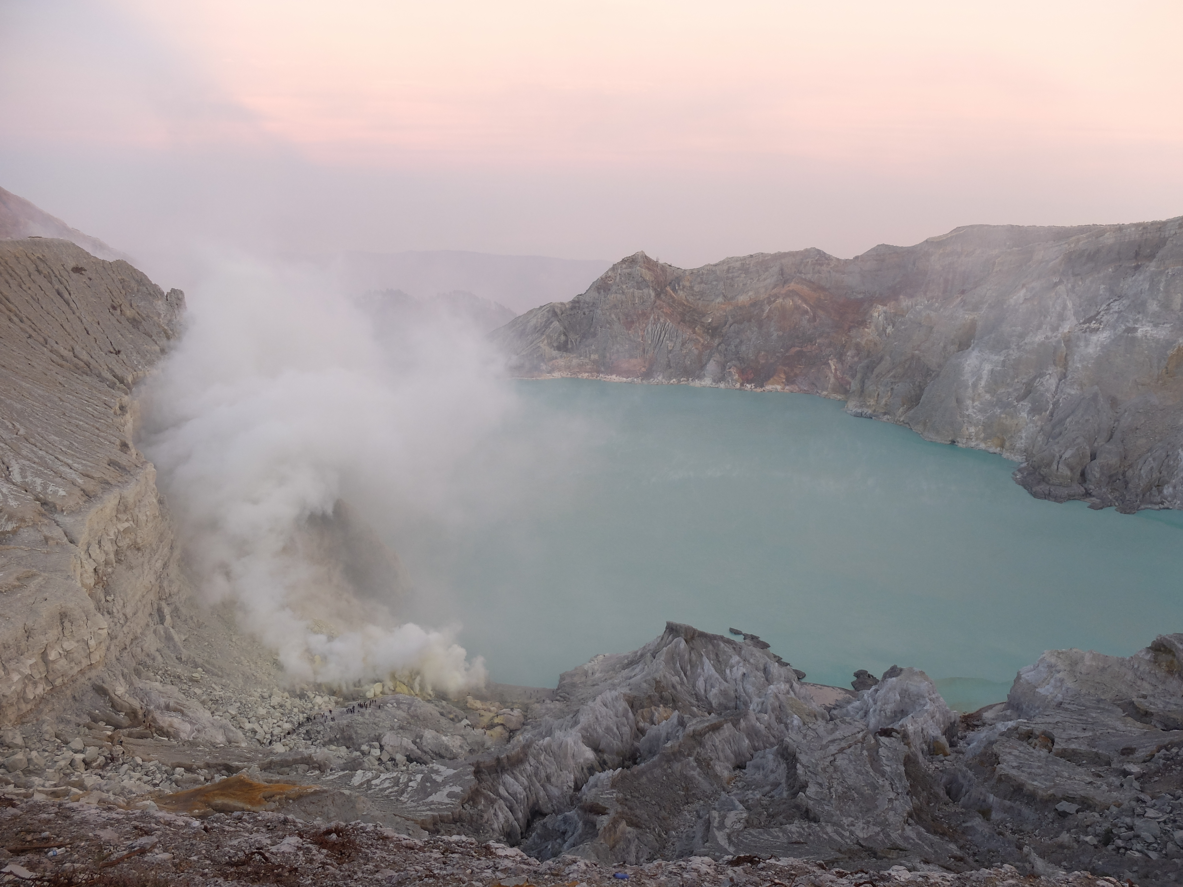 Uiteindelijk aangekomen in een guesthouse dichtbij de vulkaan. Die nacht om 1.30 opgestaan, om het blauwe vuur goed te kunnen zien in de nacht. Na mijn eerste kennismaking met vulkaan Semeru afgelopen jaar, had ik een lichte traumatische ervaring. En wat is de beste manier om een traumatische ervaring te verzachten of te verwerken..? Ik was dus best gespannen. De weg ernaartoe was niet te vergelijken met de Semeru maar sommige stukken waren best pittig. Onderweg werden gasmaskers verhuurd voor een aardige som, het is duidelijk dat de locals geld willen maken. Ik had echter wel mijn twijfels, bijna iedereen had er een. Na de afdaling in de krater kwamen we aan bij het blauwe vuur. Het was niet te geloven, zo indrukwekkend. Er kwamen grote wolken vanaf, maar de wind stond gunstig. We stonden heel dichtbij en waren een van de eersten, we hadden de hike op topsnelheid gedaan. Ik ging helemaal op in het fenomeen en Landon ook. Daardoor zagen we het gevaar van de rook die van het vuur afkwam niet en het overviel ons als een verstikkend deken. Ik probeerde adem te halen maar het werd alleen maar erger. Het brandde in mijn longen en ogen en het enige waar ik aan dacht was dat damn gasmasker wat ik had moeten huren. Ik draaide me half om naar Lando en wees naar de weg terug. Ik kroop omhoog, probeerde mijn vest uit mijn tas te halen, waardoor mijn camera op het gesteente viel. Ook dat nog, camera stuk, dacht ik. Ik drukte het vest tegen mijn mond en neus maar het hielp niets. Ik stikte bijna en mensen liepen heel droog voorbij. Toen ik mezelf opgetrokken had aan de stenen en mijn zicht wat beter werd, zag ik een gids lopen en er bungelde een gasmasker in zijn hand. Ik kroop naar hem toen en griste het uit zijn hand en drukte t op mijn gezicht. Ik denk dat hij aan mijn gezicht zag hoe desperate ik was. Maar ik wilde terug, niet alleen om nog meer van het blauwe vuur te zien maar moest ook Lando vinden die nog altijd daar was. De gids vroeg of ik mee wilde lopen en met knikkende knieën ging ik terug. Daar stond ik weer. Het was nog mooier dan de eerste keer. Maar het gasmasker hielp nauwelijks. Bij de tweede wolk kreeg ik minder binnen, maar het was toch heftig. Ik riep Landons naam maar kreeg geen gehoor. Ik besloot op dezelfde plek te blijven en gewoon af te wachten. En uit het niets was hij daar en hij trok me mee naar een lager gedeelte waar het zicht nog beter was. Hij vertelde me in een aantal woorden dat hij dezelfde ervaring had als ik. De volgende wolk die kwam, hurkte ik, hield ik mijn adem in en verborg ik mijn hoofd in mijn armen. Na een aantal minuten zijn we omhoog geklommen en het werd langzaam aan al licht. Toen we op de rand van de krater stonden kon ik zien waar we gestaan hadden en ook hoe gevaarlijk het is. En het uitzicht was fantastisch. Elke minuut veranderde het daglicht en de sfeer, dat kun je op de fotos zien. Er was niemand. Het water in de krater turqoise, de plek waar we hadden gestaan geel van het zwavel, het gesteente ijzig grijs, de hemel kleurde langzaam. Het gebergte achter ons immens en bruin en heel groen. Nog nooit in mijn leven zo iets gezien. Het was het half doodgaan dubbel en dik waard. En achja, ben niet voor niets gestopt met roken. We spraken over het feit dat locals de zwavel winnen en daar lang achter elkaar zijn, zonder gasmasker. Ongelofelijk.
