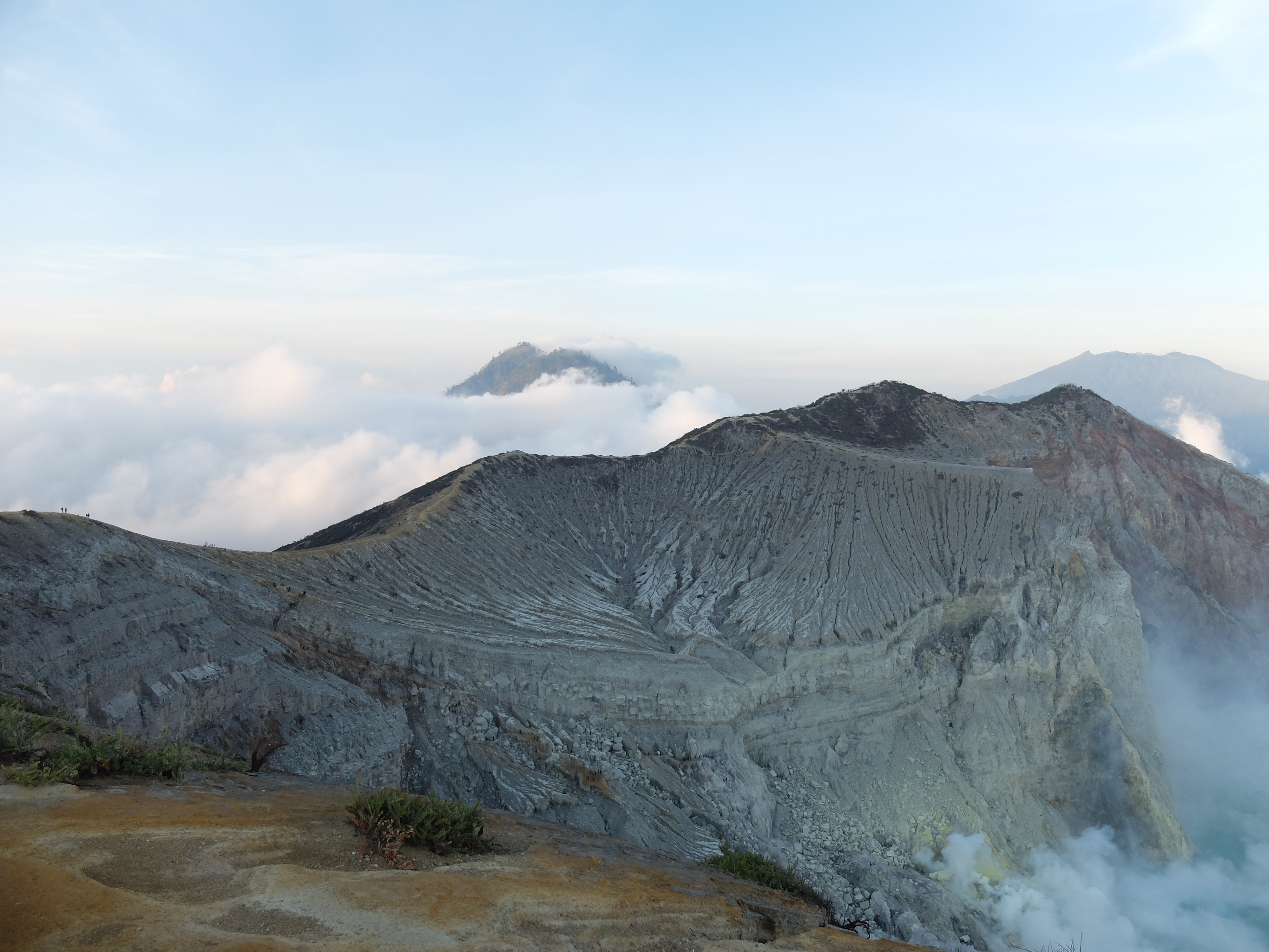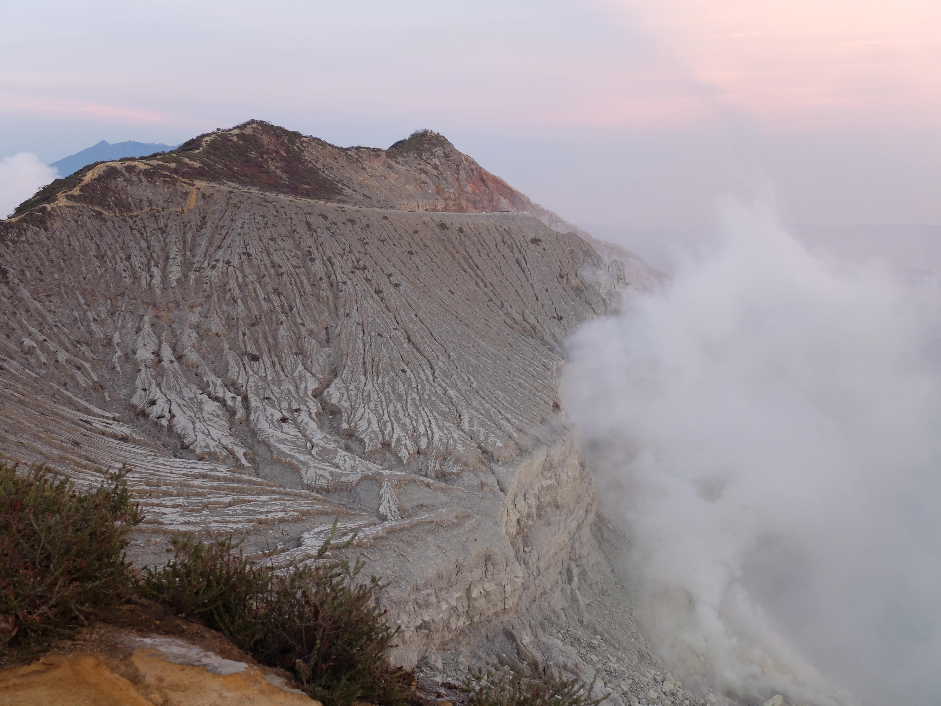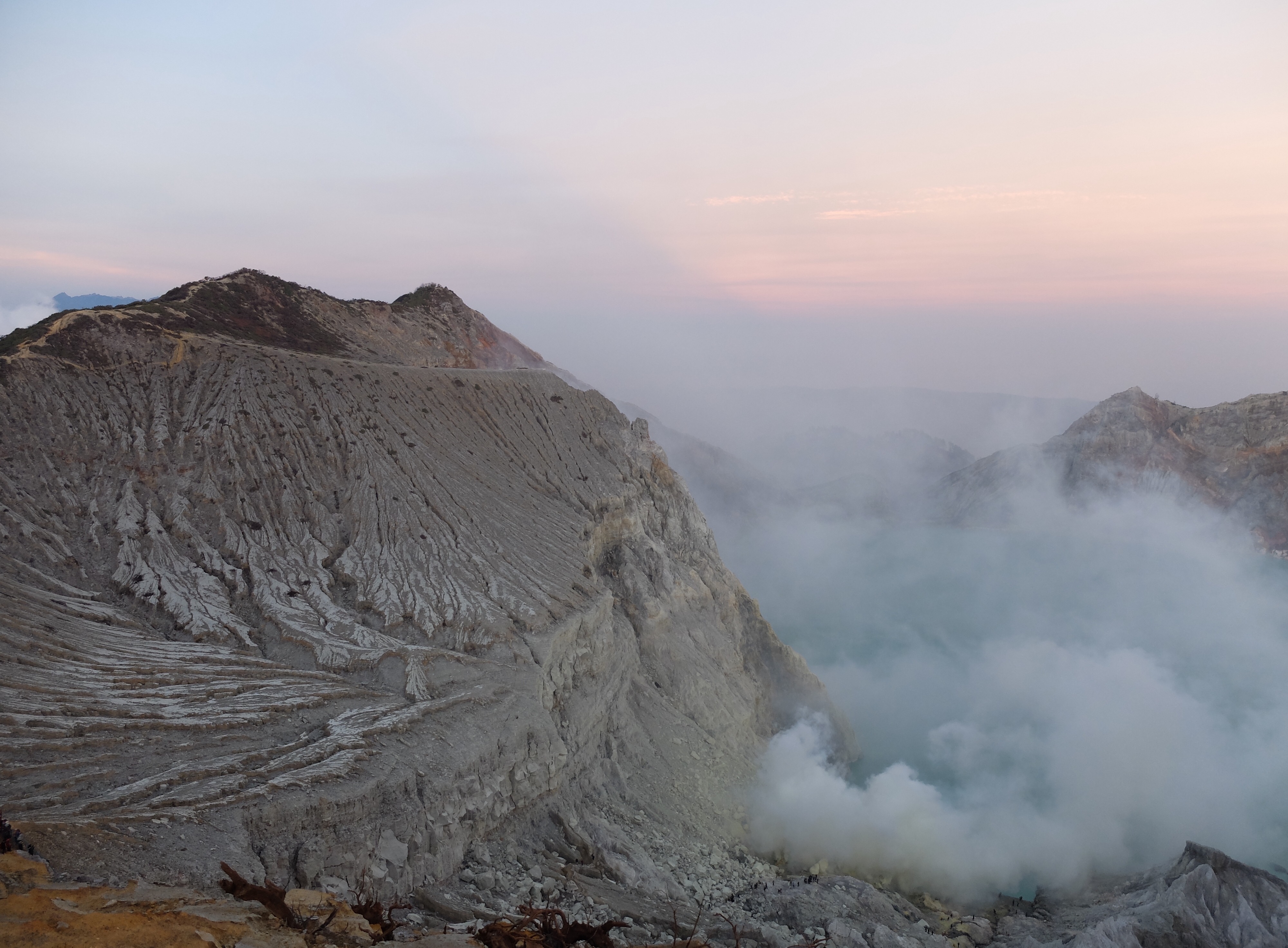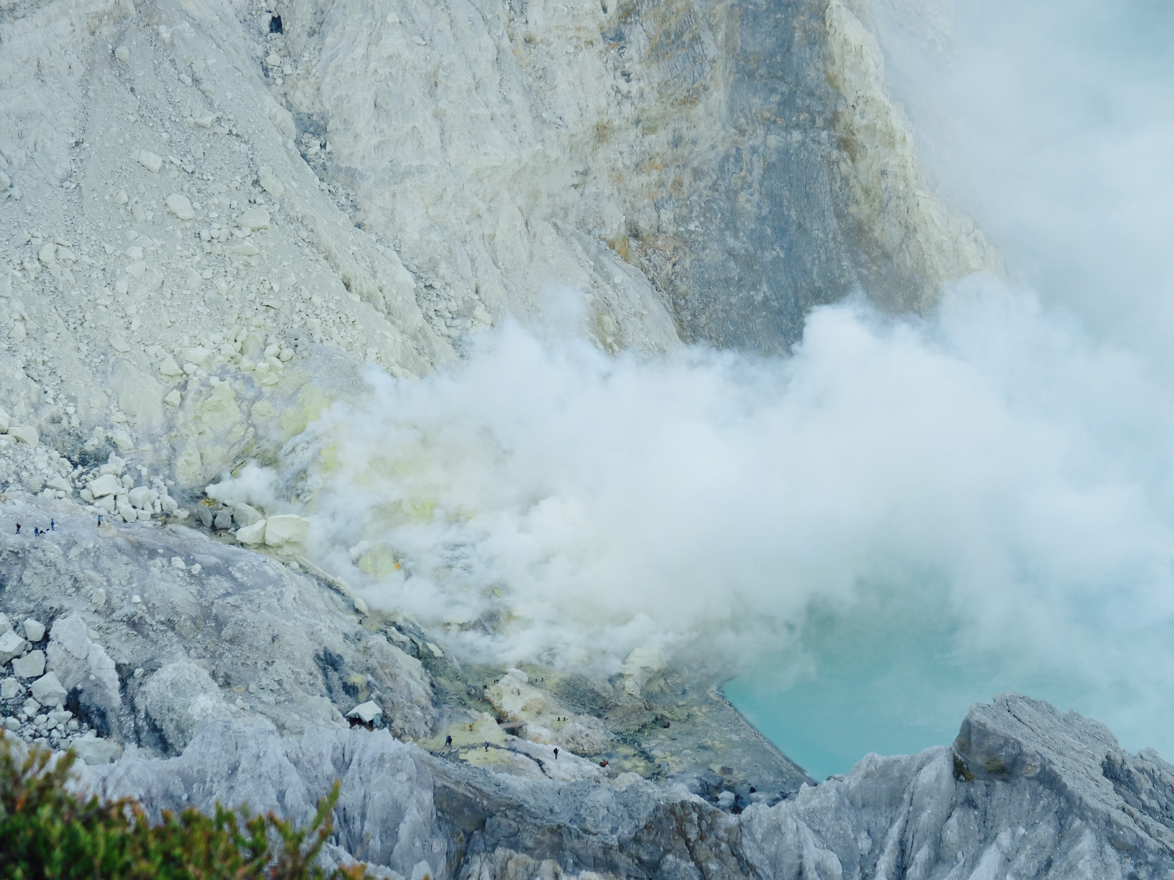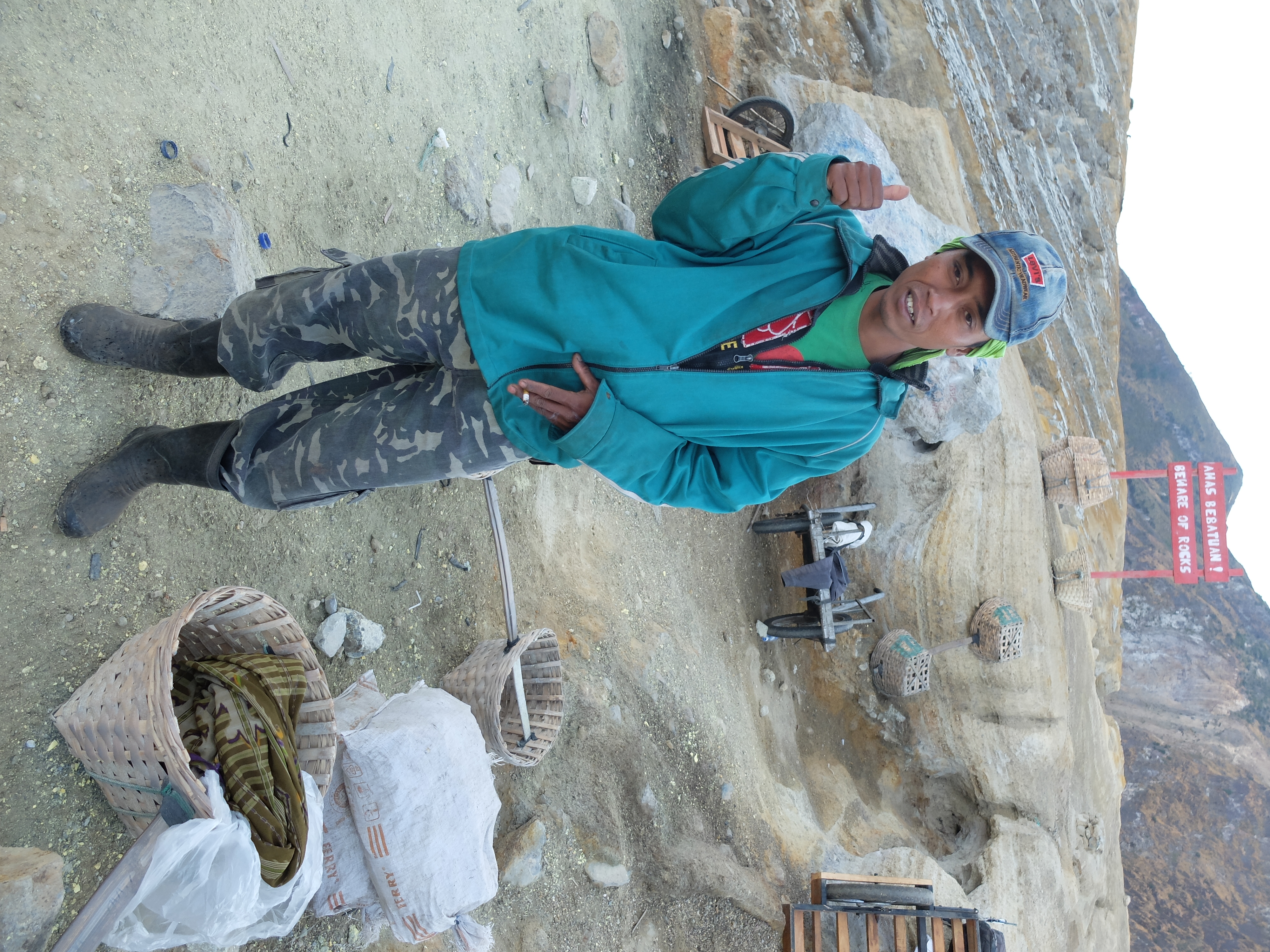 Uiteindelijk aangekomen in een guesthouse dichtbij de vulkaan. Die nacht om 1.30 opgestaan, om het blauwe vuur goed te kunnen zien in de nacht. Na mijn eerste kennismaking met vulkaan Semeru afgelopen jaar, had ik een lichte traumatische ervaring. En wat is de beste manier om een traumatische ervaring te verzachten of te verwerken..? Ik was dus best gespannen. De weg ernaartoe was niet te vergelijken met de Semeru maar sommige stukken waren best pittig. Onderweg werden gasmaskers verhuurd voor een aardige som, het is duidelijk dat de locals geld willen maken. Ik had echter wel mijn twijfels, bijna iedereen had er een. Na de afdaling in de krater kwamen we aan bij het blauwe vuur. Het was niet te geloven, zo indrukwekkend. Er kwamen grote wolken vanaf, maar de wind stond gunstig. We stonden heel dichtbij en waren een van de eersten, we hadden de hike op topsnelheid gedaan. Ik ging helemaal op in het fenomeen en Landon ook. Daardoor zagen we het gevaar van de rook die van het vuur afkwam niet en het overviel ons als een verstikkend deken. Ik probeerde adem te halen maar het werd alleen maar erger. Het brandde in mijn longen en ogen en het enige waar ik aan dacht was dat damn gasmasker wat ik had moeten huren. Ik draaide me half om naar Lando en wees naar de weg terug. Ik kroop omhoog, probeerde mijn vest uit mijn tas te halen, waardoor mijn camera op het gesteente viel. Ook dat nog, camera stuk, dacht ik. Ik drukte het vest tegen mijn mond en neus maar het hielp niets. Ik stikte bijna en mensen liepen heel droog voorbij. Toen ik mezelf opgetrokken had aan de stenen en mijn zicht wat beter werd, zag ik een gids lopen en er bungelde een gasmasker in zijn hand. Ik kroop naar hem toen en griste het uit zijn hand en drukte t op mijn gezicht. Ik denk dat hij aan mijn gezicht zag hoe desperate ik was. Maar ik wilde terug, niet alleen om nog meer van het blauwe vuur te zien maar moest ook Lando vinden die nog altijd daar was. De gids vroeg of ik mee wilde lopen en met knikkende knieën ging ik terug. Daar stond ik weer. Het was nog mooier dan de eerste keer. Maar het gasmasker hielp nauwelijks. Bij de tweede wolk kreeg ik minder binnen, maar het was toch heftig. Ik riep Landons naam maar kreeg geen gehoor. Ik besloot op dezelfde plek te blijven en gewoon af te wachten. En uit het niets was hij daar en hij trok me mee naar een lager gedeelte waar het zicht nog beter was. Hij vertelde me in een aantal woorden dat hij dezelfde ervaring had als ik. De volgende wolk die kwam, hurkte ik, hield ik mijn adem in en verborg ik mijn hoofd in mijn armen. Na een aantal minuten zijn we omhoog geklommen en het werd langzaam aan al licht. Toen we op de rand van de krater stonden kon ik zien waar we gestaan hadden en ook hoe gevaarlijk het is. En het uitzicht was fantastisch. Elke minuut veranderde het daglicht en de sfeer, dat kun je op de fotos zien. Er was niemand. Het water in de krater turqoise, de plek waar we hadden gestaan geel van het zwavel, het gesteente ijzig grijs, de hemel kleurde langzaam. Het gebergte achter ons immens en bruin en heel groen. Nog nooit in mijn leven zo iets gezien. Het was het half doodgaan dubbel en dik waard. En achja, ben niet voor niets gestopt met roken. We spraken over het feit dat locals de zwavel winnen en daar lang achter elkaar zijn, zonder gasmasker. Ongelofelijk.