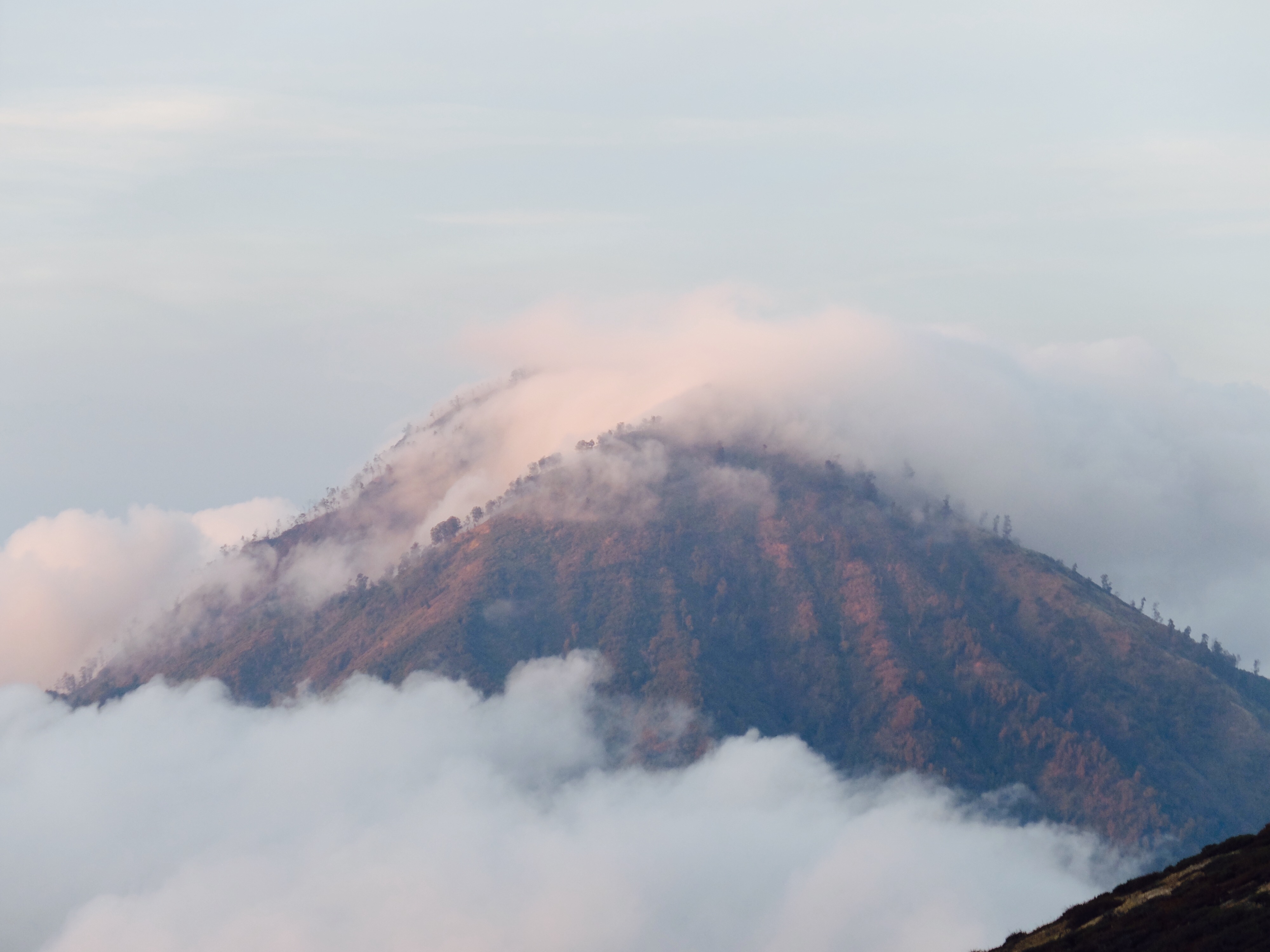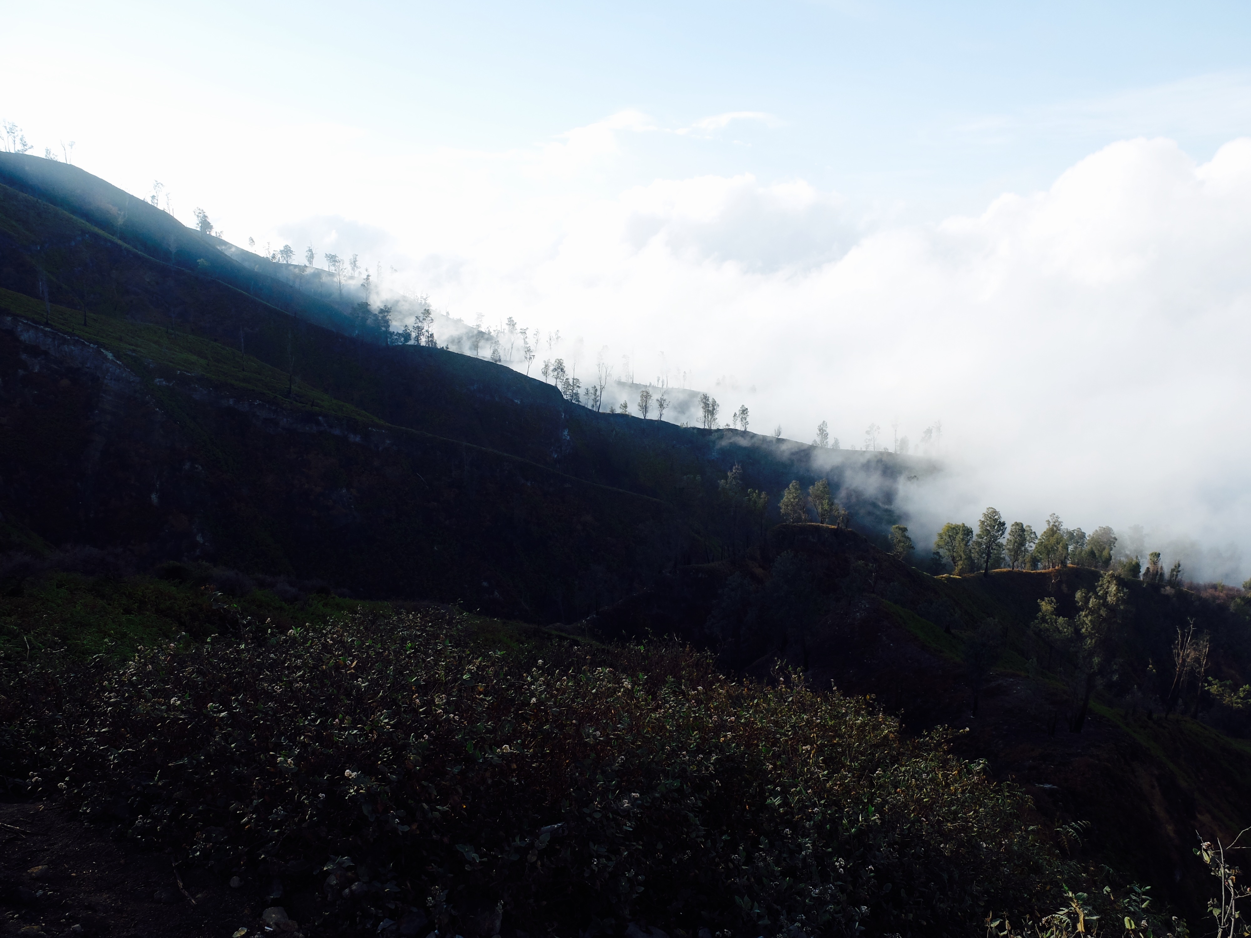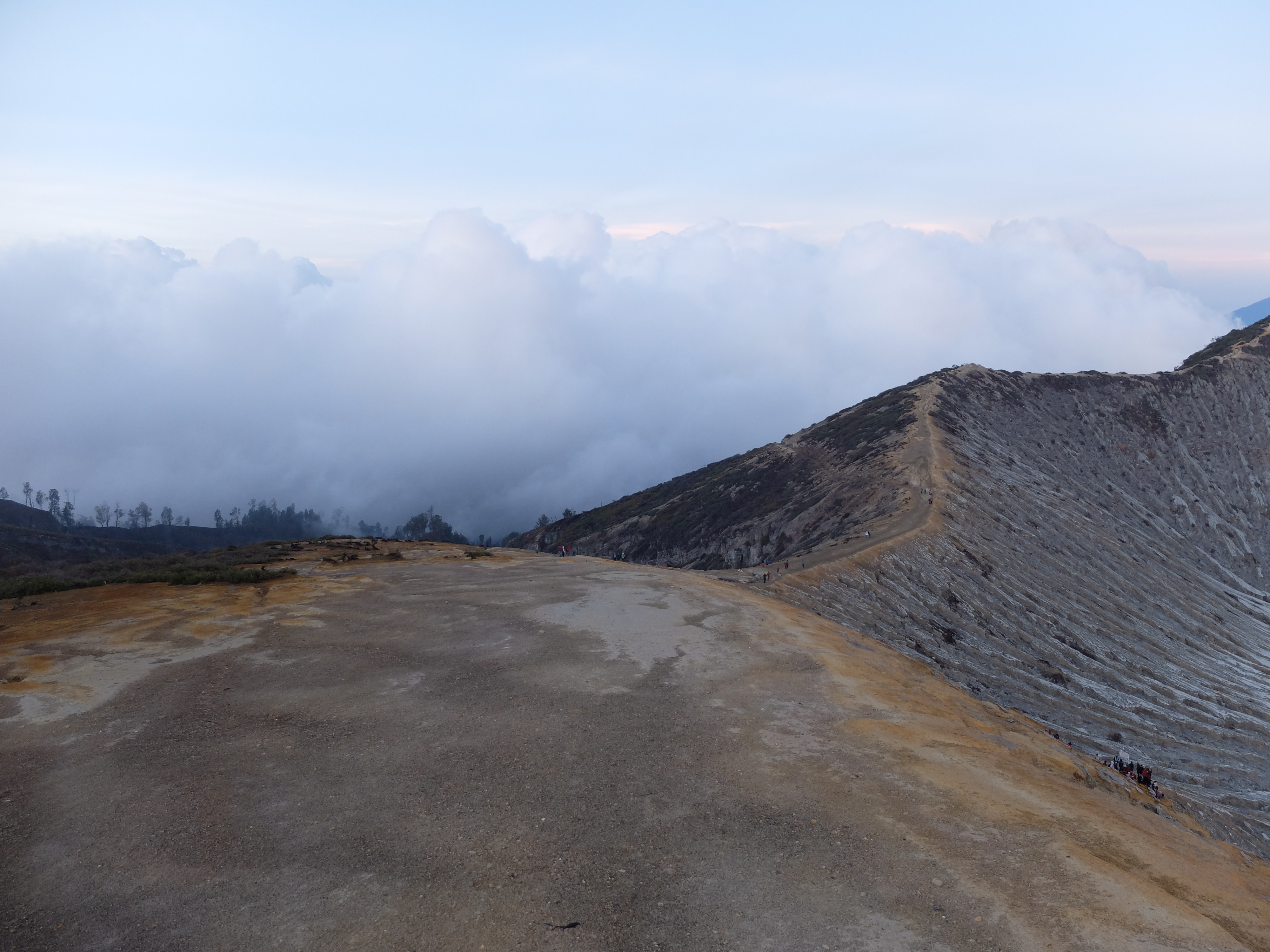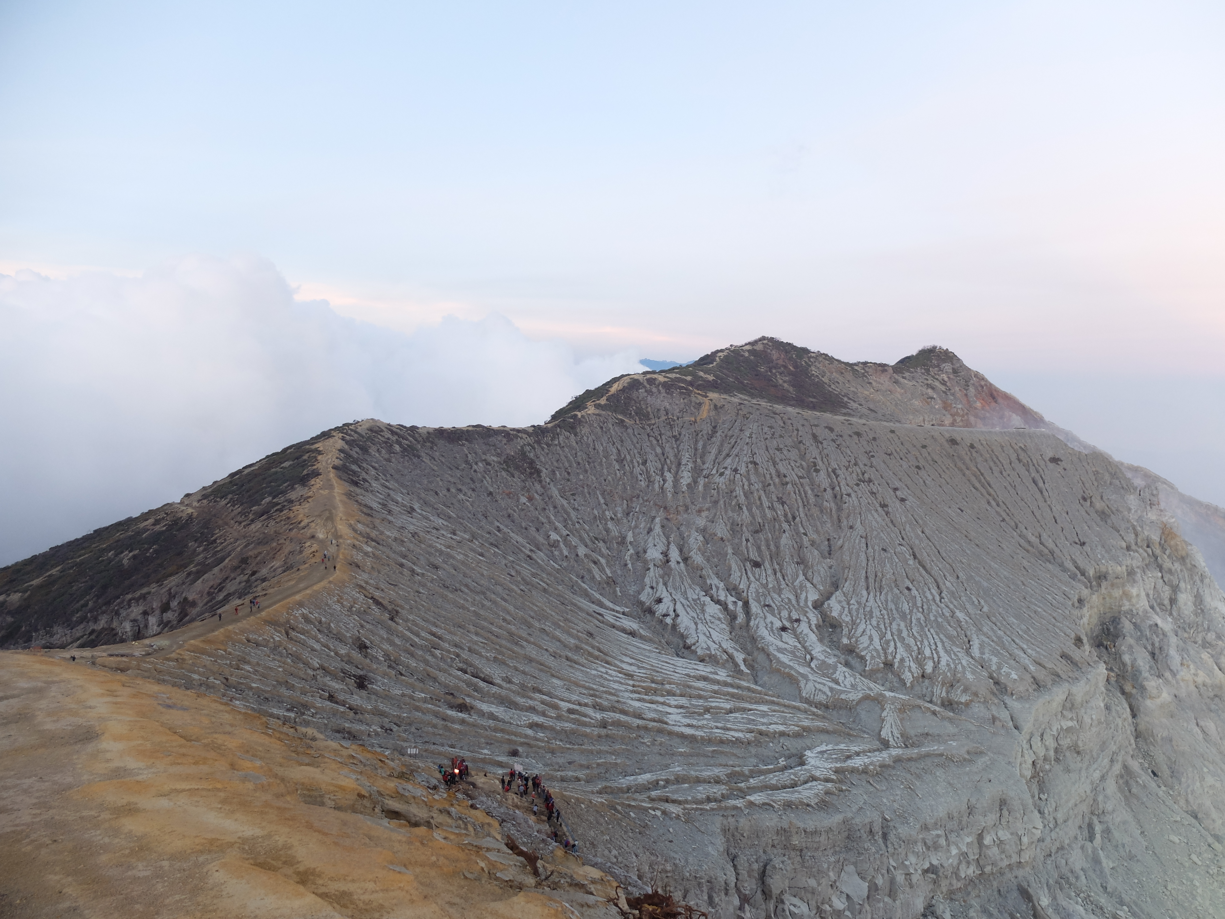Uiteindelijk aangekomen in een guesthouse dichtbij de vulkaan. Die nacht om 1.30 opgestaan, om het blauwe vuur goed te kunnen zien in de nacht. Na mijn eerste kennismaking met vulkaan Semeru afgelopen jaar, had ik een lichte traumatische ervaring. En wat is de beste manier om een traumatische ervaring te verzachten of te verwerken..? Ik was dus best gespannen. De weg ernaartoe was niet te vergelijken met de Semeru maar sommige stukken waren best pittig. Onderweg werden gasmaskers verhuurd voor een aardige som, het is duidelijk dat de locals geld willen maken. Ik had echter wel mijn twijfels, bijna iedereen had er een. Na de afdaling in de krater kwamen we aan bij het blauwe vuur. Het was niet te geloven, zo indrukwekkend. Er kwamen grote wolken vanaf, maar de wind stond gunstig. We stonden heel dichtbij en waren een van de eersten, we hadden de hike op topsnelheid gedaan. Ik ging helemaal op in het fenomeen en Landon ook. Daardoor zagen we het gevaar van de rook die van het vuur afkwam niet en het overviel ons als een verstikkend deken. Ik probeerde adem te halen maar het werd alleen maar erger. Het brandde in mijn longen en ogen en het enige waar ik aan dacht was dat damn gasmasker wat ik had moeten huren. Ik draaide me half om naar Lando en wees naar de weg terug. Ik kroop omhoog, probeerde mijn vest uit mijn tas te halen, waardoor mijn camera op het gesteente viel. Ook dat nog, camera stuk, dacht ik. Ik drukte het vest tegen mijn mond en neus maar het hielp niets. Ik stikte bijna en mensen liepen heel droog voorbij. Toen ik mezelf opgetrokken had aan de stenen en mijn zicht wat beter werd, zag ik een gids lopen en er bungelde een gasmasker in zijn hand. Ik kroop naar hem toen en griste het uit zijn hand en drukte t op mijn gezicht. Ik denk dat hij aan mijn gezicht zag hoe desperate ik was. Maar ik wilde terug, niet alleen om nog meer van het blauwe vuur te zien maar moest ook Lando vinden die nog altijd daar was. De gids vroeg of ik mee wilde lopen en met knikkende knieën ging ik terug. Daar stond ik weer. Het was nog mooier dan de eerste keer. Maar het gasmasker hielp nauwelijks. Bij de tweede wolk kreeg ik minder binnen, maar het was toch heftig. Ik riep Landons naam maar kreeg geen gehoor. Ik besloot op dezelfde plek te blijven en gewoon af te wachten. En uit het niets was hij daar en hij trok me mee naar een lager gedeelte waar het zicht nog beter was. Hij vertelde me in een aantal woorden dat hij dezelfde ervaring had als ik. De volgende wolk die kwam, hurkte ik, hield ik mijn adem in en verborg ik mijn hoofd in mijn armen. Na een aantal minuten zijn we omhoog geklommen en het werd langzaam aan al licht. Toen we op de rand van de krater stonden kon ik zien waar we gestaan hadden en ook hoe gevaarlijk het is. En het uitzicht was fantastisch. Elke minuut veranderde het daglicht en de sfeer, dat kun je op de fotos zien. Er was niemand. Het water in de krater turqoise, de plek waar we hadden gestaan geel van het zwavel, het gesteente ijzig grijs, de hemel kleurde langzaam. Het gebergte achter ons immens en bruin en heel groen. Nog nooit in mijn leven zo iets gezien. Het was het half doodgaan dubbel en dik waard. En achja, ben niet voor niets gestopt met roken. We spraken over het feit dat locals de zwavel winnen en daar lang achter elkaar zijn, zonder gasmasker. Ongelofelijk.