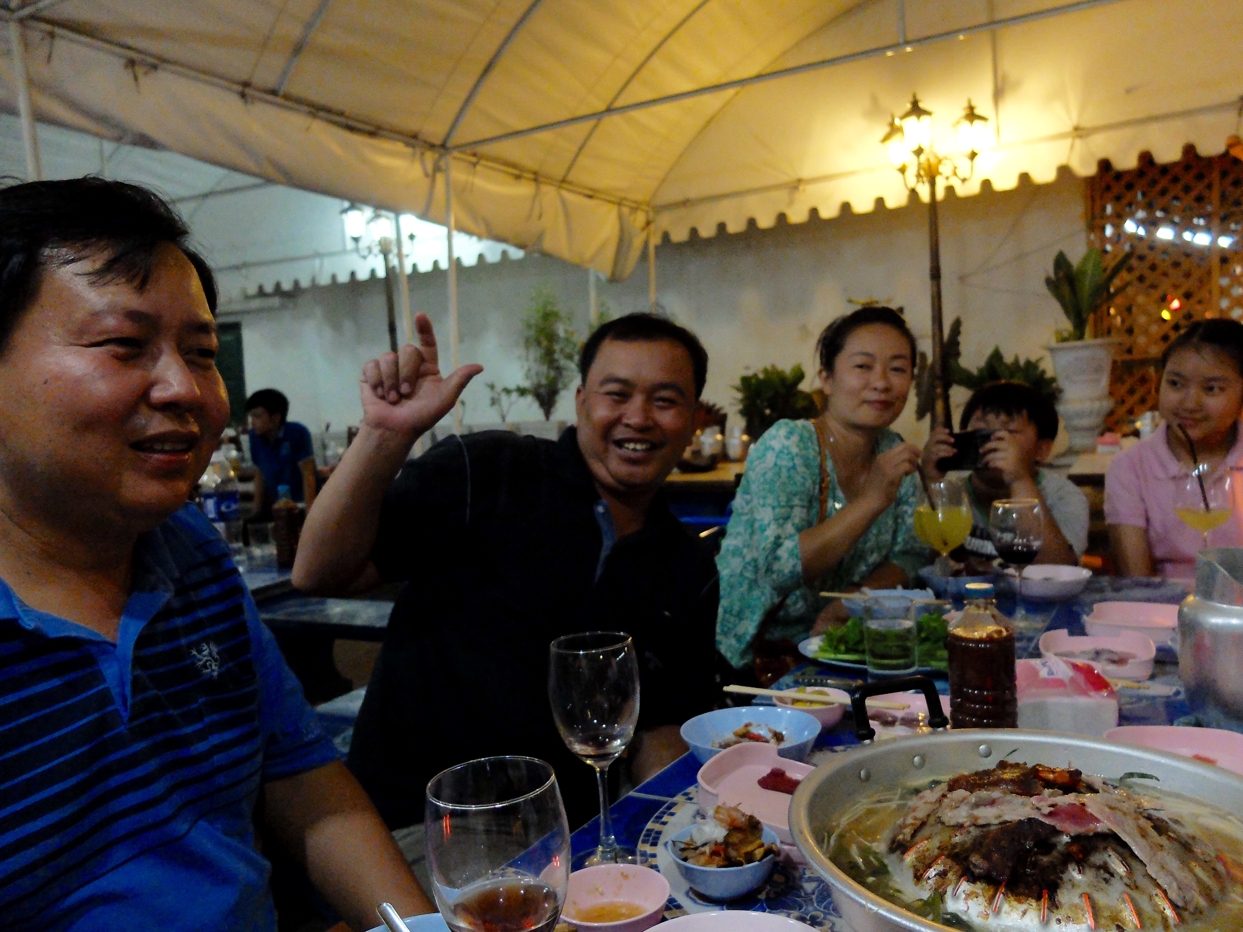 Die avond was ik uitgenodigd om met de familie van mijn guesthouse te gaan eten. De fles witte wijn die ik had gekregen op school ging gewoon mee en werd nog gekoeld ook.. Toen ik vroeg waarom kreeg ik als antwoord dat ze geen wijn serveren; het is dan toch logisch je eigen booze mee te nemen?! Het bleek bruine wijn te zijn maar dat gaf niet, het eten maakte alles goed. Barbecue met alle soorten vis en vlees en salades. Er kwamen zoveel mensen bij en zij deden zo hun best om met mij te communiceren en ik met hen. Oneindig proosten en de Lao Lao spiritus werd weer tevoorschijn getoverd. De kids werden thuis gedropt en we gingen naar een ware nachtclub. Dansen op onbekende live muziek, traditioneel en raar dansen door elkaar heen. Na elk nummer iedereen van de dansvloer, slow nummer en daarna iedereen weer terug. Ik in mijn Lao skirt, op maat gemaakt door mn tweede moeder, met wie ik ook danste. Voel me nog dolgelukkig als ik eraan terugdenk. Dit volk is zo authentiek en uniek met hun gedragingen, gewoontes, uitingen, geloofsovertuigingen, historie en gevoel voor humor. En het is er nog. Het is niet veranderd door toerisme… Ik hoop zo dat dit kan blijven bestaan.