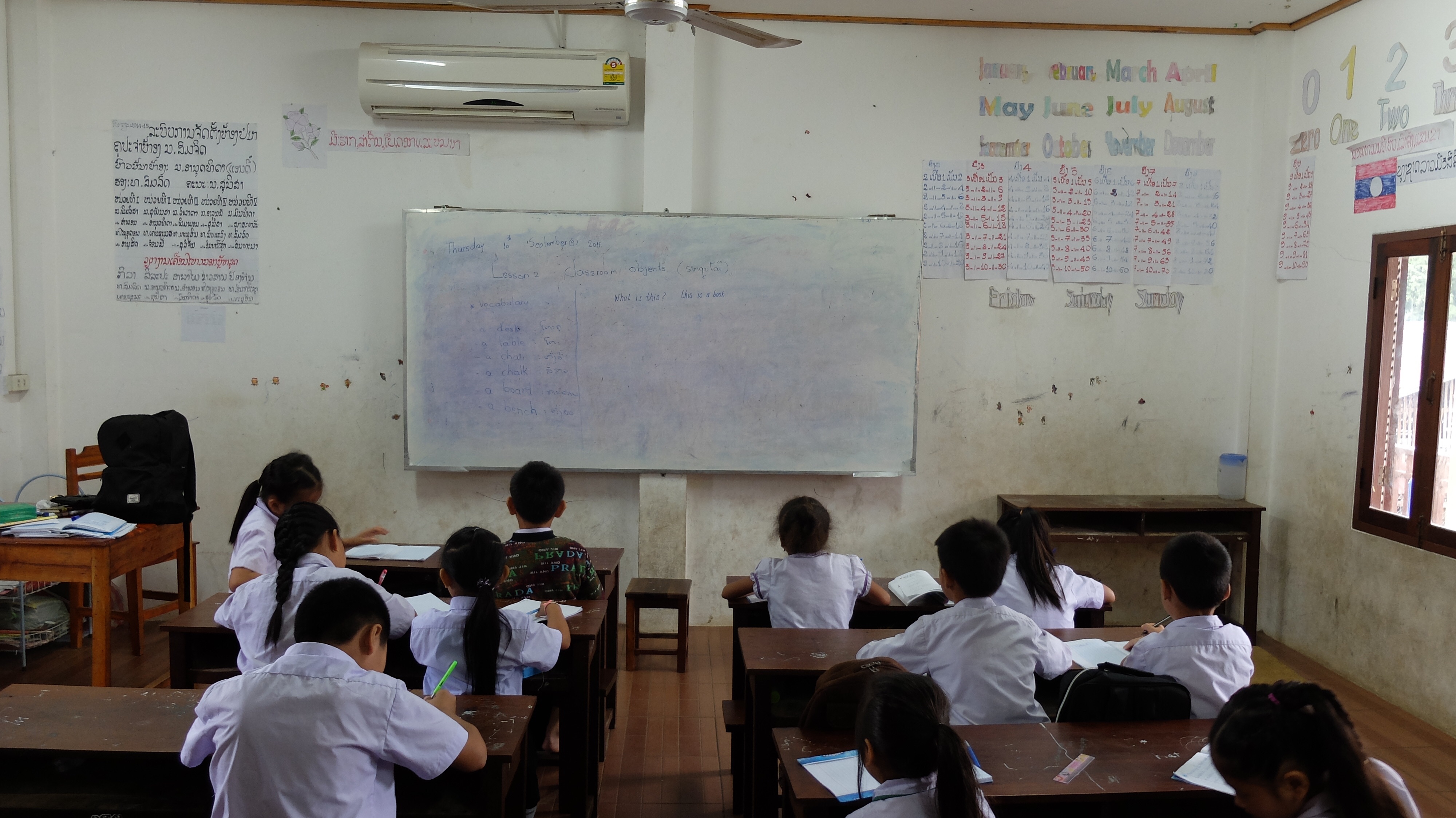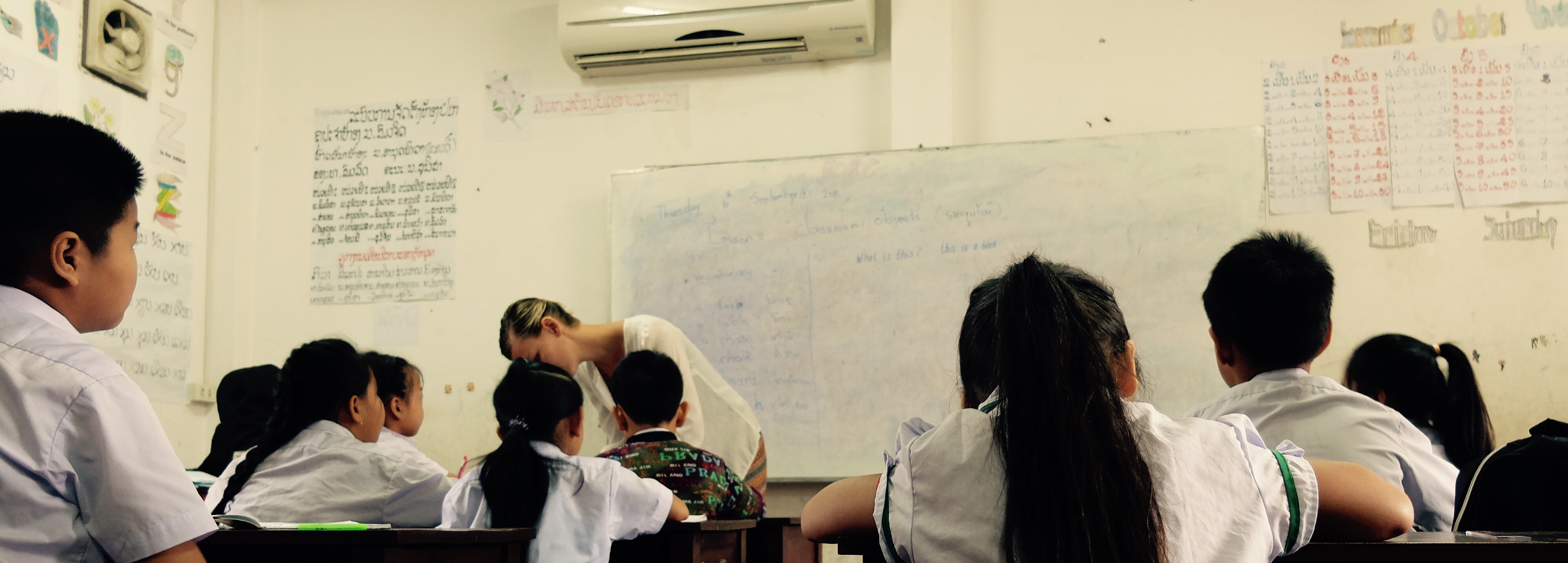 Een van mijn doelen tijdens mijn reis is het doen van vrijwilligerswerk op een plek waar het echt nodig is. Ik voelde me een beetje nutteloos (en dat na nog geen drie weken) en wilde graag wat betekenen. Maar niet via een project ofzo, ik wilde het anders. Ik wilde zelf bepalen hoe, wat en waar. Laos is zoals al eerder gezegd heel arm, daarom leek me dit de plek bij uitstek om aan de slag te gaan. Ik besloot om gewoon wat scholen te bezoeken en te vragen of ze behoefte hebben aan een lerares Engels hebben. De reacties waren heel verschillend. Men spreekt hier weinig of geen Engels, dat maakt het lastig. Bij een school was ik duidelijk niet gewenst, ik werd weggejaagd. Bij twee andere kon ik later terugkomen. Bij terugkomst bij de ene, kon ik de volgende dag weer terugkomen. Dat deed ik dus. De persoon die toen aanwezig was gaf me een telefoonnummer van een andere school. Ik belde deze school, maar het was een heel ongemakkelijk gesprek, we begrepen elkaar niet. In het hostel waar ik op dat moment verbleef was een Thais meisje en zij bood aan me te helpen. Loa en Thai lijkt erg op elkaar. Door haar kwam 'de baas' van de school me ophalen en liet zijn school zien. Ik probeerde een beetje te onderhandelen. Hij wilde me eerst laten overnachten in de school en laten douchen met een tuinslang bij de wc's. Dat leek me niet zo. Uiteindelijk betaalt de school de helft van het guesthouse waar ik verblijf en kan ik meelunchen. Tegenprestatie: ik geef als (enige) vrijwilliger de hele week les op de leukste school van Loas. Schooltje met 250 leerlingen, van elke klas is er een. Ik geniet van elke dag dat ik er ben. Wel is het lastig, want er zijn nogal wat verschillen. Wat voorbeelden: de kinderen lopen onder lestijd de klas uit om snoep te kopen, snoepwinkel is op het schoolplein. Ze komen terug en eten het op in de klas. Zie je dit voor je in Nederland? Als tussendoortje is snoep not done op scholen, laat staan het op het schoolplein zelf te kunnen halen. Sommige kinderen zie je een les lang niet omdat ze 'problem with brain' hebben. Alles gebeurt klassikaal, waardoor het langzaam gaat. Iedereen spreekt door elkaar, er is geen 'orde'. Er zijn geen boeken, alleen de leerkracht heeft een boek. De engelse leerkracht waarmee ik werk, spreekt eigenlijk geen Engels. Ze leert de kinderen vanuit het boek, schrijft de vertalingen op het bord, maar spreekt de taal niet. Ik doe mijn best te laten zien welke onderwijsvormen er nog meer zijn. De monden van de leerkrachten vielen open toen ik de kinderen een beetje liet bewegen (drie uur zitten in de hitte, zonder airco, met drie kinderen aan een bank en dat als je zes bent kan nooit goed zijn). De kinderen waren aan het giechelen… zoveel mooie, gelukkige gezichtjes, daar doe je het voor! Ik probeer de docent de juiste uitspraak mee te geven, het Lao heeft zoveel andere klanken, is zo lastig voor haar. Ik laat haar zien dat je best wat van het boek af mag wijken, maar dat is ondenkbaar. De komende weken ga ik me voor 100 procent inzetten! Ik spreek al wat Lao. Ik leer Lao van haar, zij Engels van mij. En de kinderen als het goed is ook wat meer engels