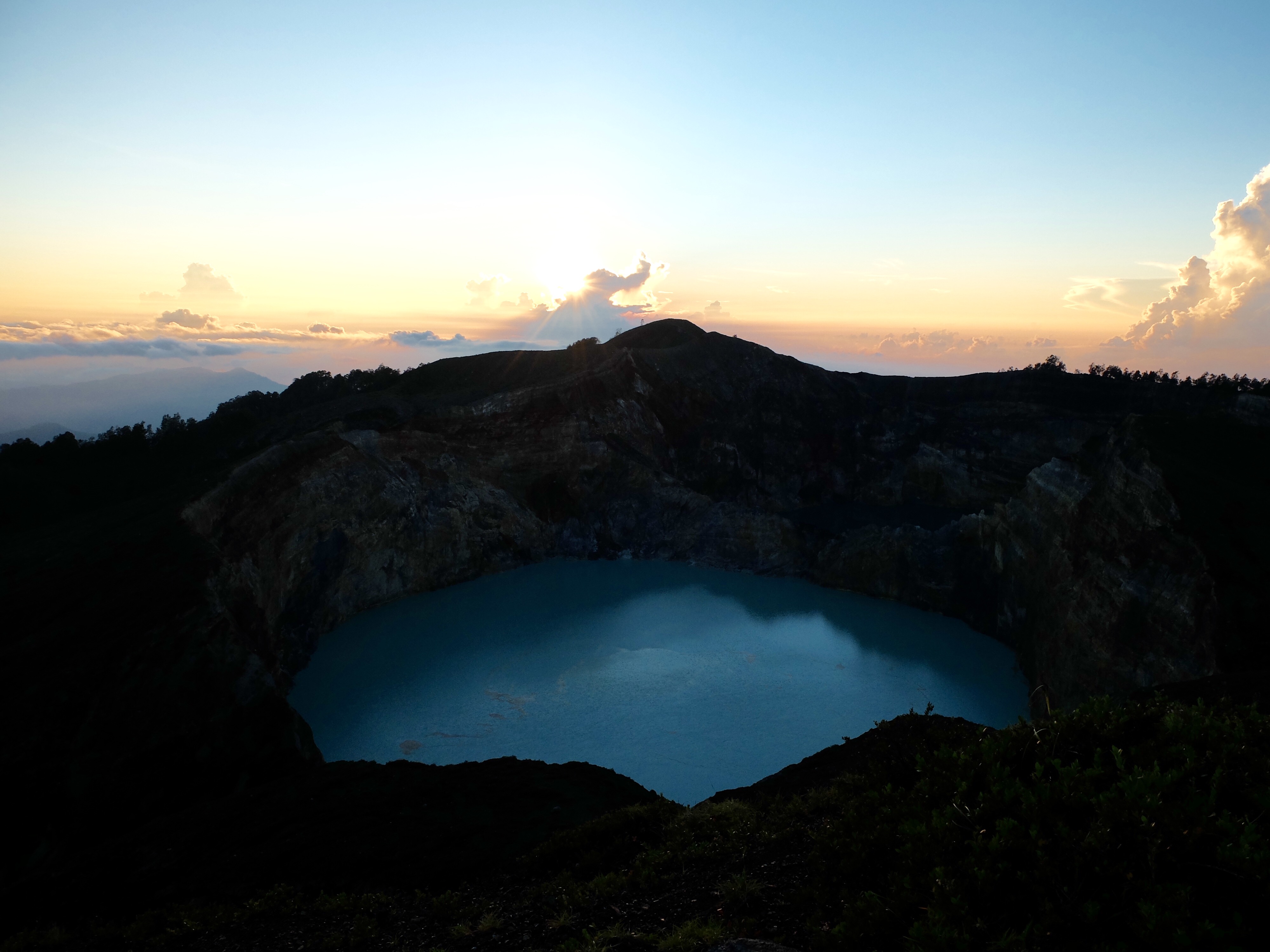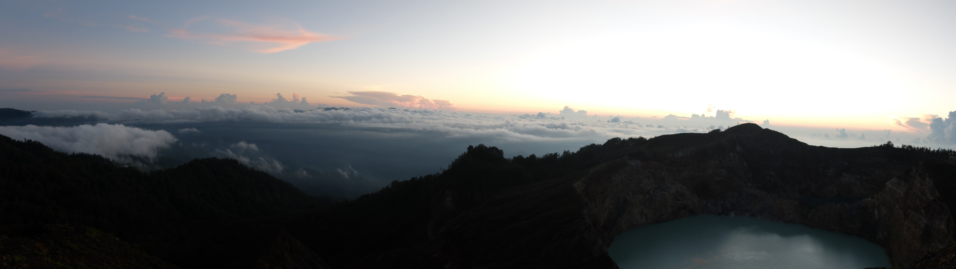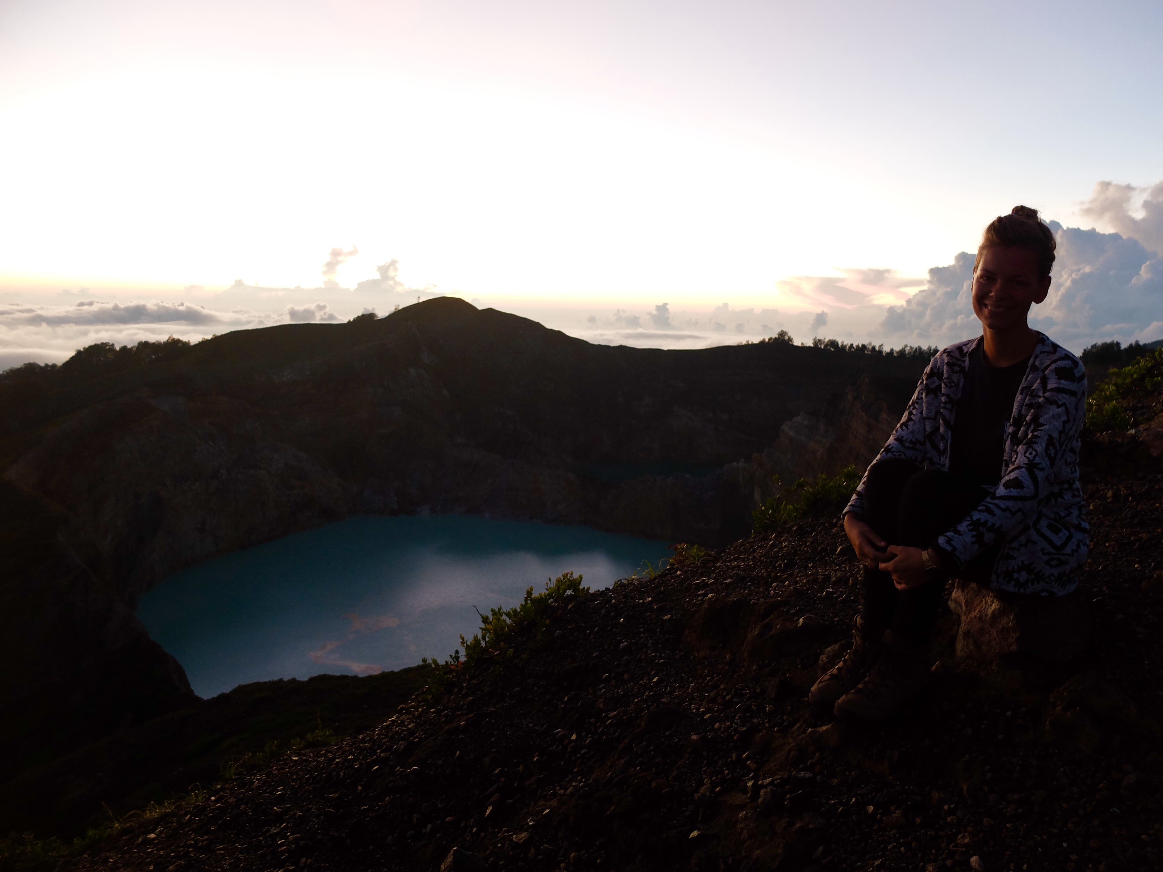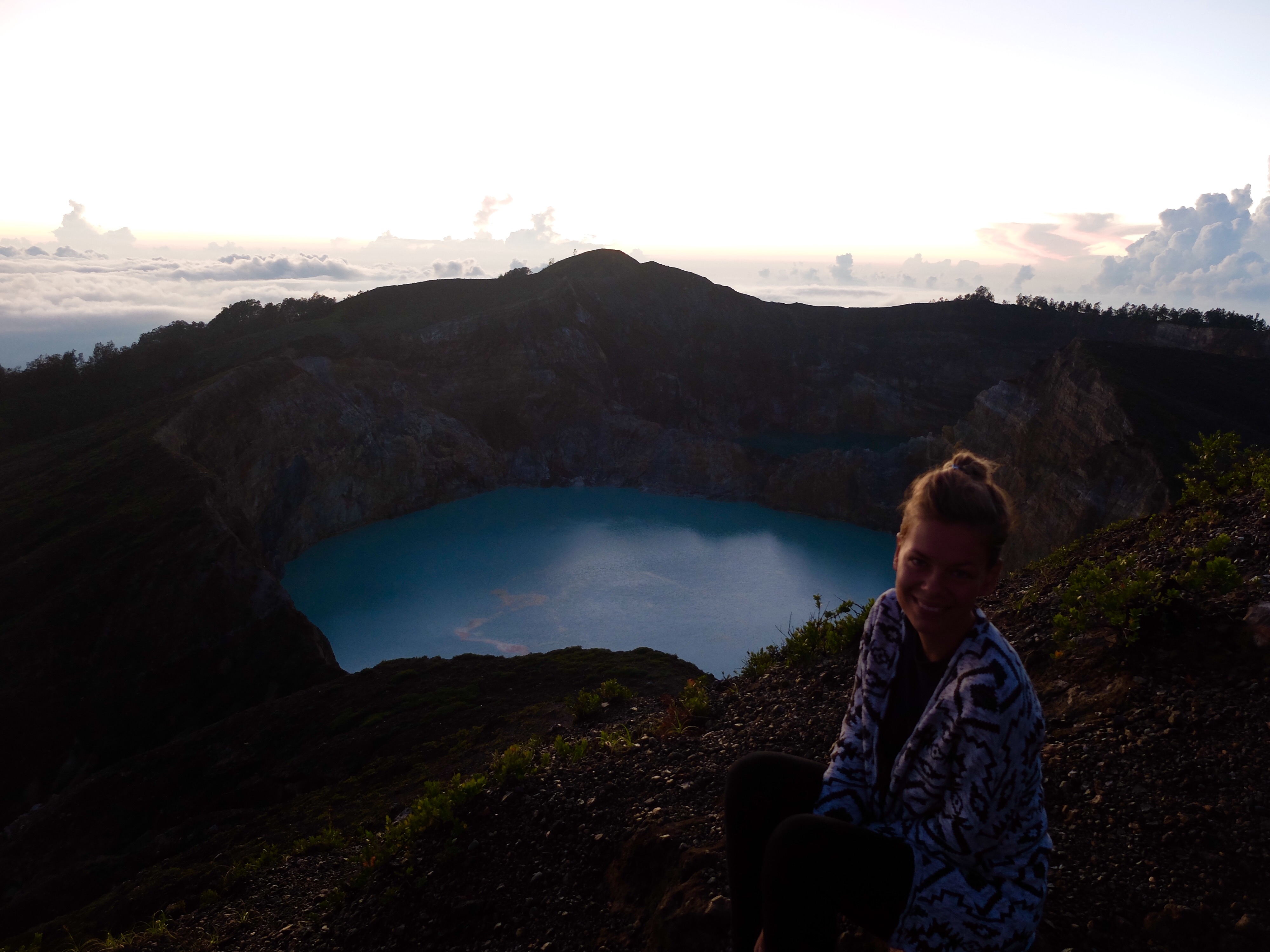 Om 4 am haalde Udin me op en we scheurden op zijn motor naar de vulkaan. En wat voor een motor, dikke adrenalinerush. Aangekomen bij het viewpoint (niet ver lopen) waren we de eersten en was het nog donker. De zonsopgang was erg mooi en de twee meren van de vulkaan werden langzaam zichtbaar. Ik kwam Ier Colin tegen, wie per toeval ook Flores wilde verlaten en de kant van Lombok op wilde. We spraken af om samen te gaan en hij vertrok. Ik kocht een sjaal bij en vrouwtje waar ze twee maanden aan heeft gewerkt, met komodoos en gekkoos erop en de scenery van Flores, heel blij mee. We dronken koffie en ginger thee, wat ik gratis kreeg, vermoedelijk omdat ik mn bahasa oefende. Toen de zon later hoger stond liepen Udin en ik met een spaans koppel eerst naar de andere zijde, waar de wolken net opgetrokken waren en een groen meer te zien was. Aan de viewpoint kant konden we dichterbij de andere meten komen, welke unreal mooi waren. Lichtblauw en turquoise met een swirl van sulfer in een van de twee. De fotos zijn goed uitgepakt, al zeg ik het zelf. Men gelooft dat als een persoon overlijd, de spirit naar een van de drie meren gaat en natuurlijk hangt het ervan af hoe goed je hebt geleefd en ook hoe oud je was, waar je terecht komt.