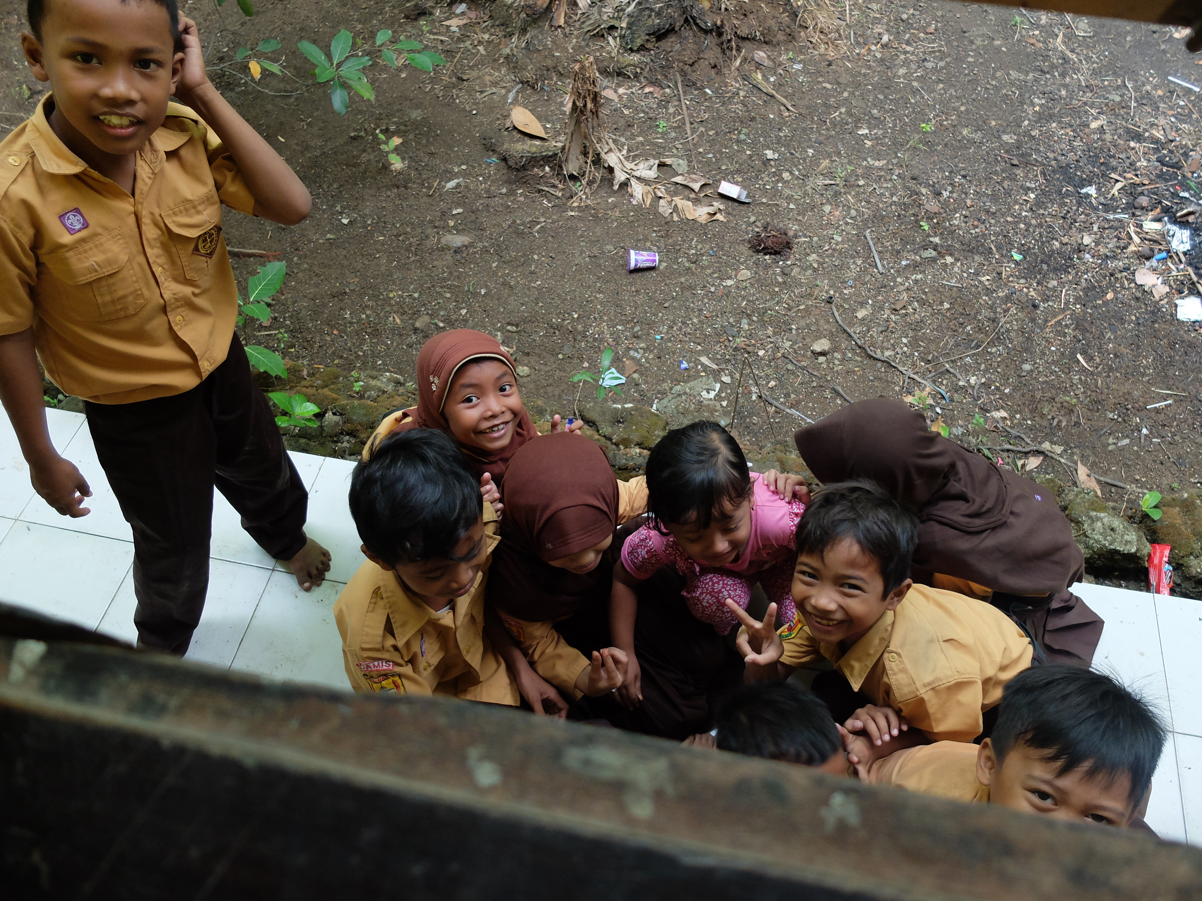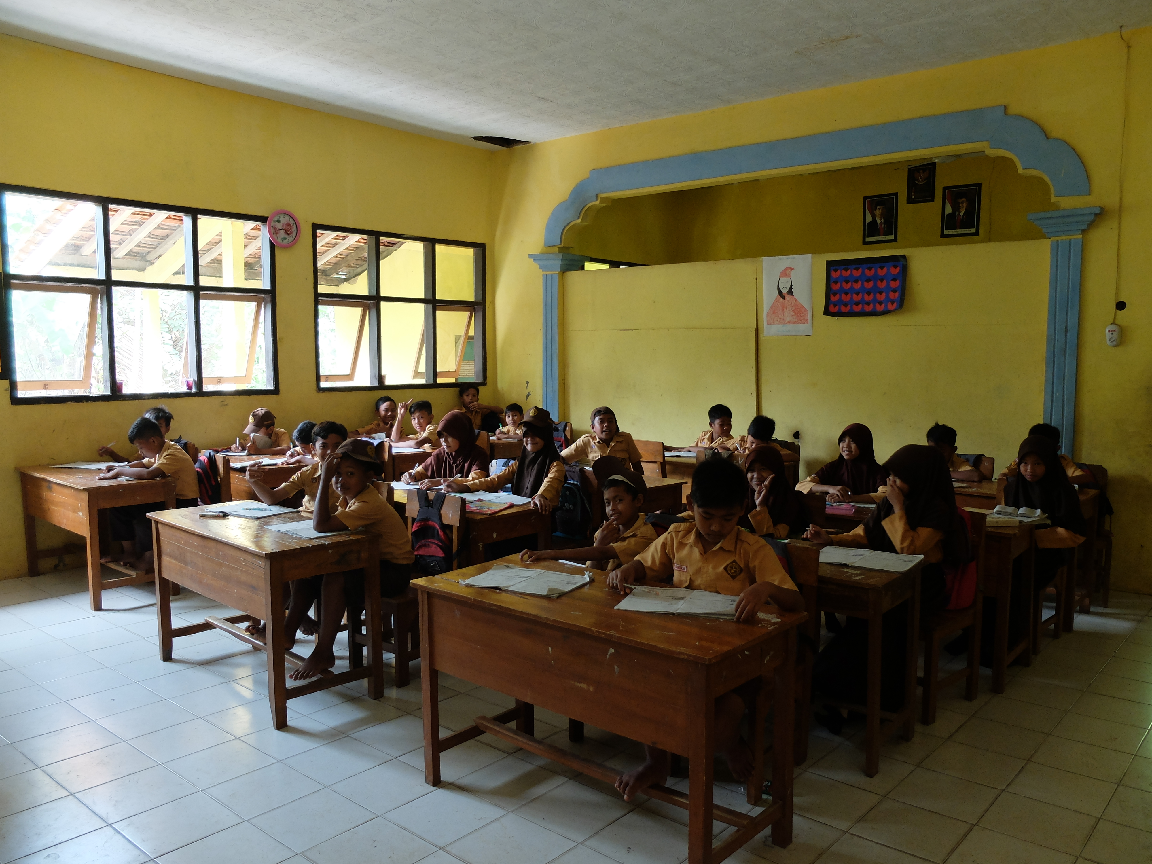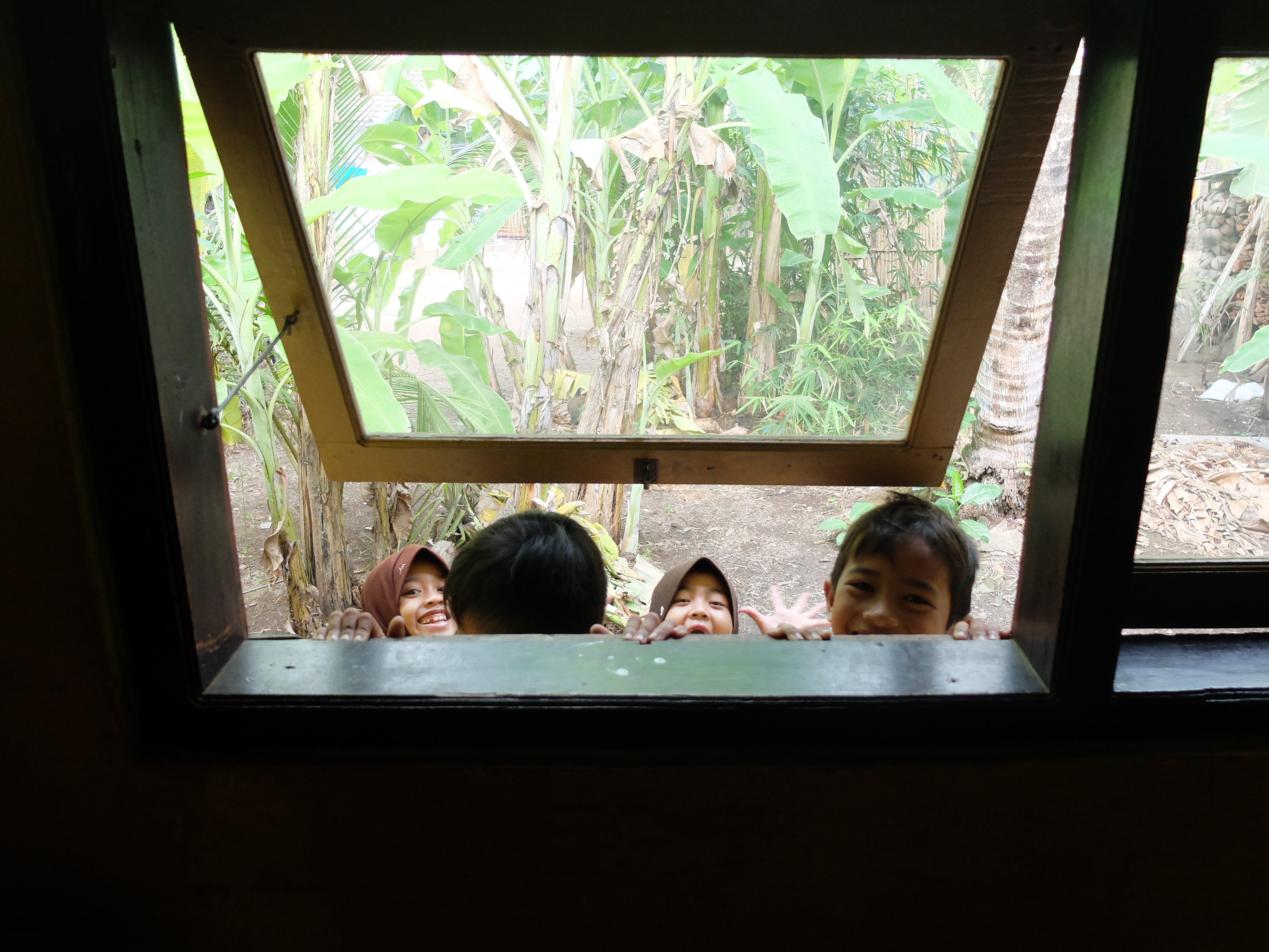 Toen ik mijn ogen opende hoorde ik de vader van de familie goodmorning oefenen. Zachtjes deed ik de deur open en hij draaide heel snel naar me toe met een grote glimlach. Goodmorning! Mijn dag was meteen gemaakt. En hij leek in het begin zo ongeïnteresseerd. Mijn intuïtie zei toen al dat de kans groot is dat hij het spannend vond, de eerste toerist ooit in dorp en dan ook nog in zijn huis. En daarbij ook nog eens geen woord engels spreekt. Ik deed de mandi, begint te wennen. Het was zes uur. Het duurde twee en half uur voordat ik op de school was, de Indonesische way of living. Onderweg familie bezoeken, roti, soort brood, kopen. Mensen die van verbazing bijna van hun veranda afvielen; de eerste bule, toerist, in het dorp ooit. Ik lachte en zwaaide maar, in het begin voelde het heel ongemakkelijk; ik wilde niet als indringer gezien worden. Ik liet het maar los, kon me er wel druk over maken, maar zou hier toch nog de aanstaande dagen verblijven. Dus beter het beste van maken! De skola was weer heel anders dan die in Laos. Ik moest gesluierd en sommige andere vrouwen hadden een boerka. De kinderen kwamen niet meer bij. Ik denk dat sommige nog nooit een 'blanke' gezien hadden. Lesgeven was heel heftig, tenminste op deze dag, weet niet hoe het op andere dagen is. Er werd muziek gemaakt naast me, de kinderen in de andere klas braken t lokaal af, ik moest schreeuwen om er bovenuit te komen. Maar ze luisterden wel, ze waren vooral erg onder de indruk denk ik. Ook hier trouwens een sedikit, kleine, candyshop. Tijdens mijn les kwamen er steeds andere kinderen binnen via de deur maar er hingen er ook een paar aan de ramen. Waar waren de leerkrachten? Achja er moet ook gegeten worden toch en gebruik gemaakt worden van de wifi in het dorp om youtube te kijken… Hihi. Bovendien waren de kinderen niet meer te hiuden. School was om elf uur alweer klaar, de kinderen vrij. Bizar dat die kleine kindjes gewoon een motor besturen; het enige vervoersmiddel in het dorp.