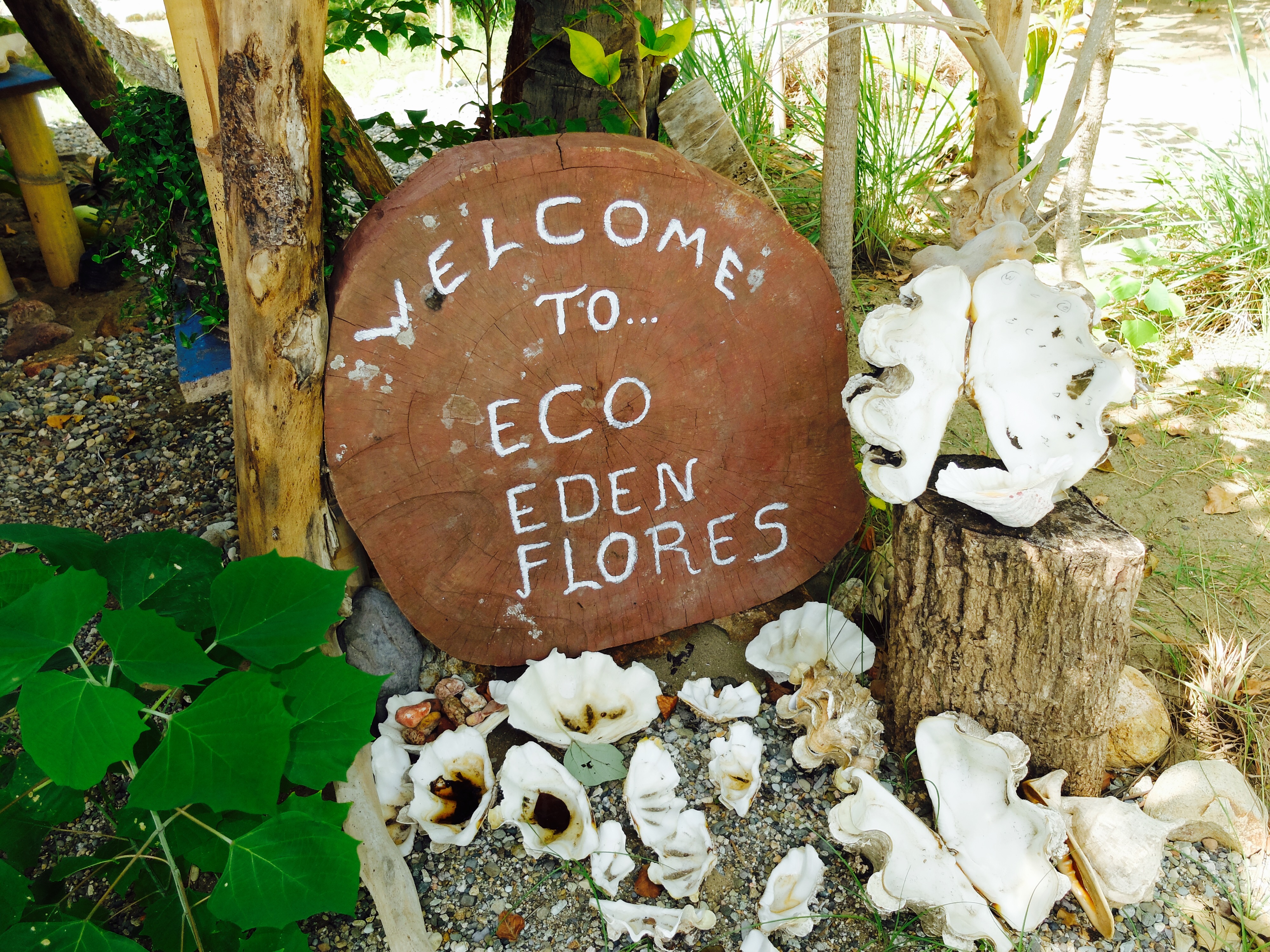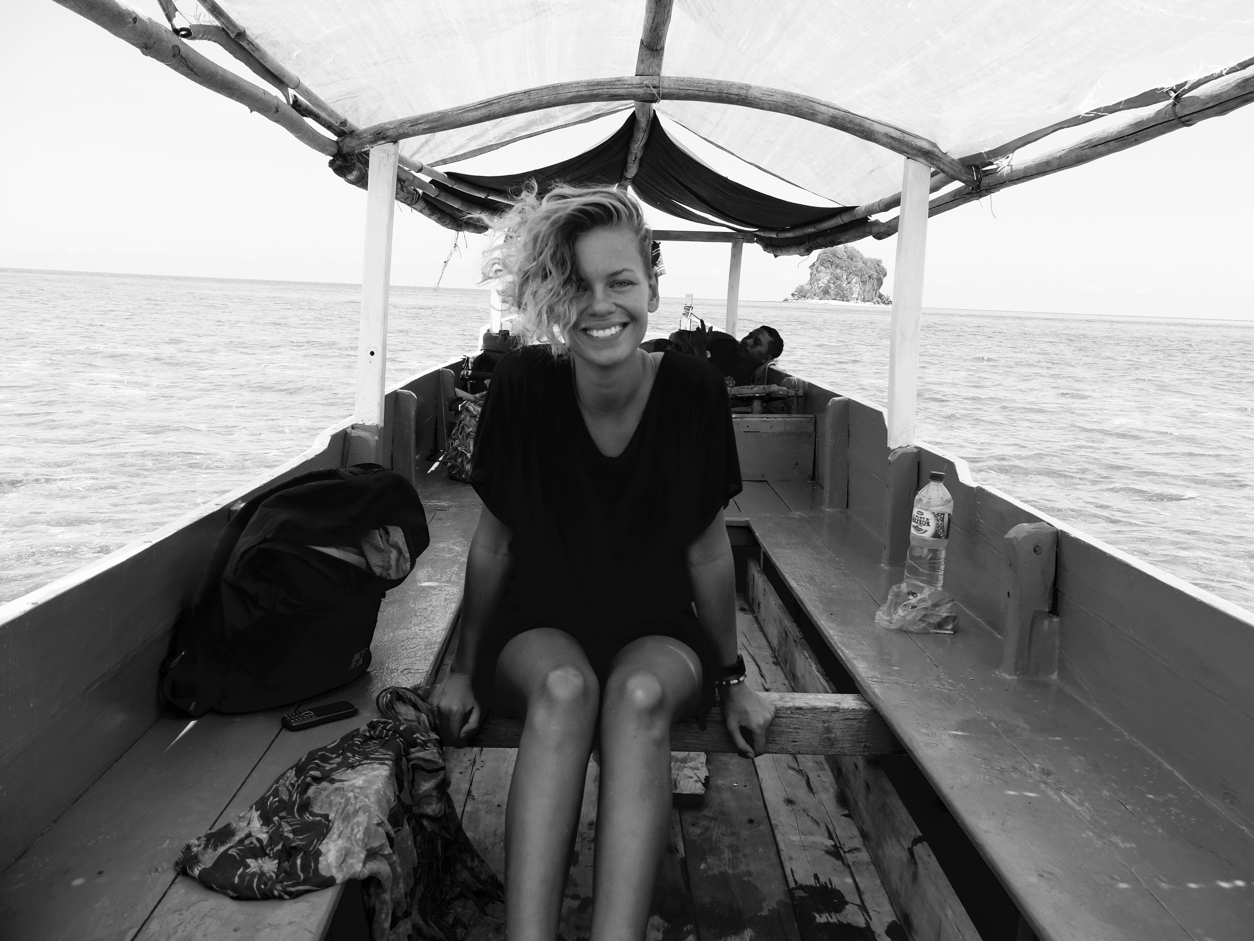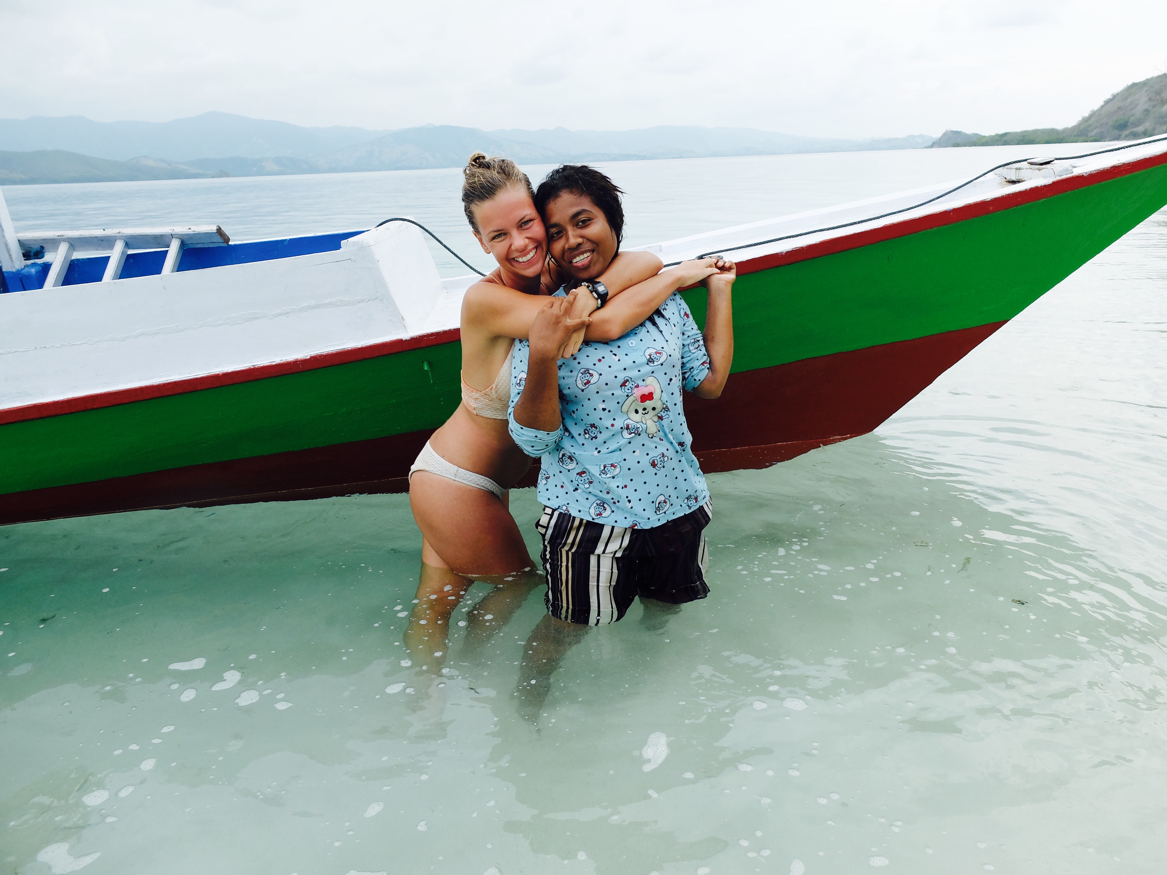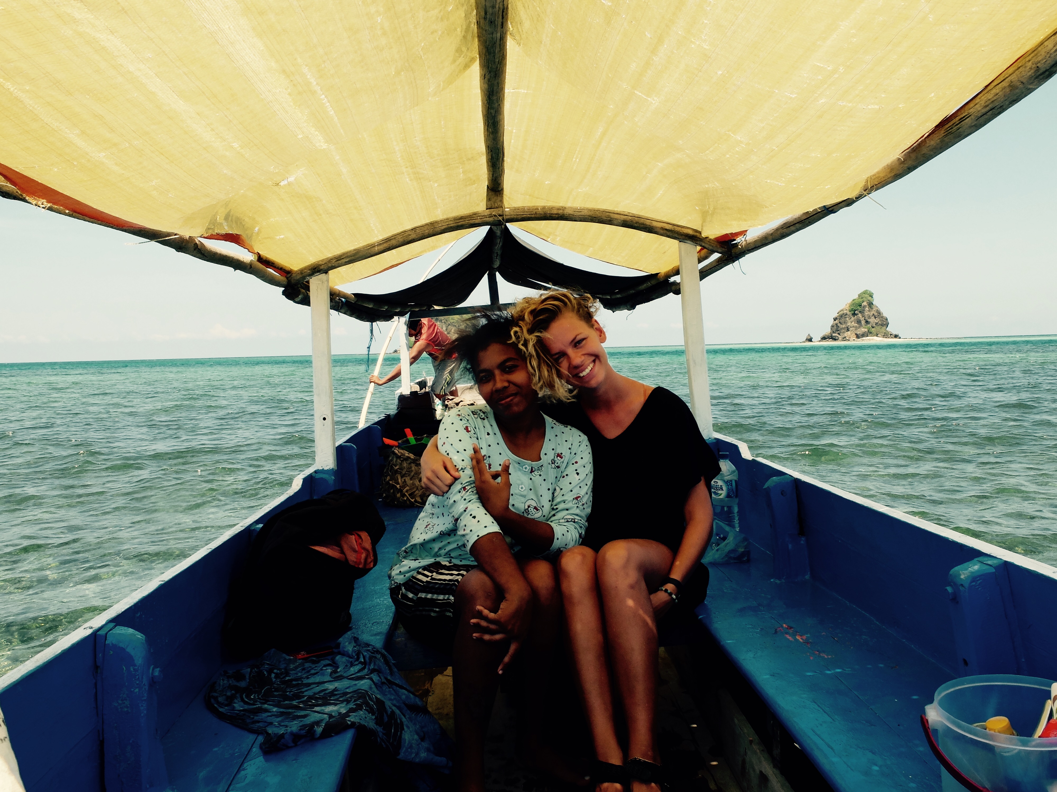 Daarna at ik mijn ontbijt in een open huisje, met allemaal positieve voorwerpen van Flores om me heen en las ik een boek over positief denken en het werkte. Ik probeerde mijn pulserende headdack te vergeten, zei niets van het zeer slechte ontbijt maar knikte vrolijk en deed mijn uiterste best om bahasa te spreken met het niet-engels-spekende personeel. Wat resulteerde in lange interessante gesprekken en beide partijen voelde hoeveel waarde het had. De tijd vloog om. Ik aaide de twee biggetjes die spontaan omvielen, zo fijn vonden ze het. Ik was verkocht… Ik wees naar het eiland wat opvallend dichtbij de kust lag en grapte dat we er ook heen konden zwemmen. En een van de meiden wilde dat wel doen. Laat dat nu sinds de filis iets zijn wat ik graag wil; naar een onbewoond eiland zwemmen. Maar tis best gevaarlijk. Fuck it. Na de lunch, die ik niet hoefde te betalen, instrueerde ik een van de locals hoe met mijn camera om te gaan (hoe gaaf, jezelf op een onbewoond eiland op foto hebben) en zwom. Mathilda, een local uit Eco Eden, zwom hangende in een zwemband en het was niet zo dichtbij als ik dacht, terwijl ik weet wat ze over eilanden zeggen. Ik werd een aantal keer flink gebeten door kwalletjes en zij tilde er doodleuk een op uit de zee. Fearless die meid. Ik ging er wel echt voor, wilde er wel graag zijn. Ik voelde me net als in the beach toen ik aankwam op het eilandje; half dood aanspoelen. En het was zo een mooi moment want na elkaar omhelst te hebben zeiden we niets. We liepen allebei op ons dooie akkertje rond te kijken en schelpen te zoeken. En tot onze grote verbazing was de jongen met de camera al fotos makende en Sylvester (de meest beleefde en puurste local ooit) onderweg vanaf de kant in een kano. We waren zo blij toen ze steeds dichterbij kwamen. En ik heb nog nooit zo een extreme fotoshoot gehad, het was onbetaalbaar. De fotograaf noemde het trots ‘my trip’ nadat hij honderd fotos van mij maakte en daarna met mij wilde poseren en alleen. Het was hilarisch. Na wat rondgehangen te hebben, grote vogels zien uitvliegen en slangen gaan zoeken, gingen we terug met de katamaran. We meerden aan en drie kleine jongetjes, van wie de boot bleek te zijn, namen deze mee met een schatkist vol schelpen aan boord. Ik liet t gaan. Ik voelde me steeds meer op mn gemak in het huisje en had mn hoofdlamp eigenlijk direct al bij de hand toen de stroom uitviel. Later hadden we vissenkopsoep en rijst, waar ik heel blij van werd en dat weer gratis (zoals dat ook ik bahasa genoemd wordt) was.