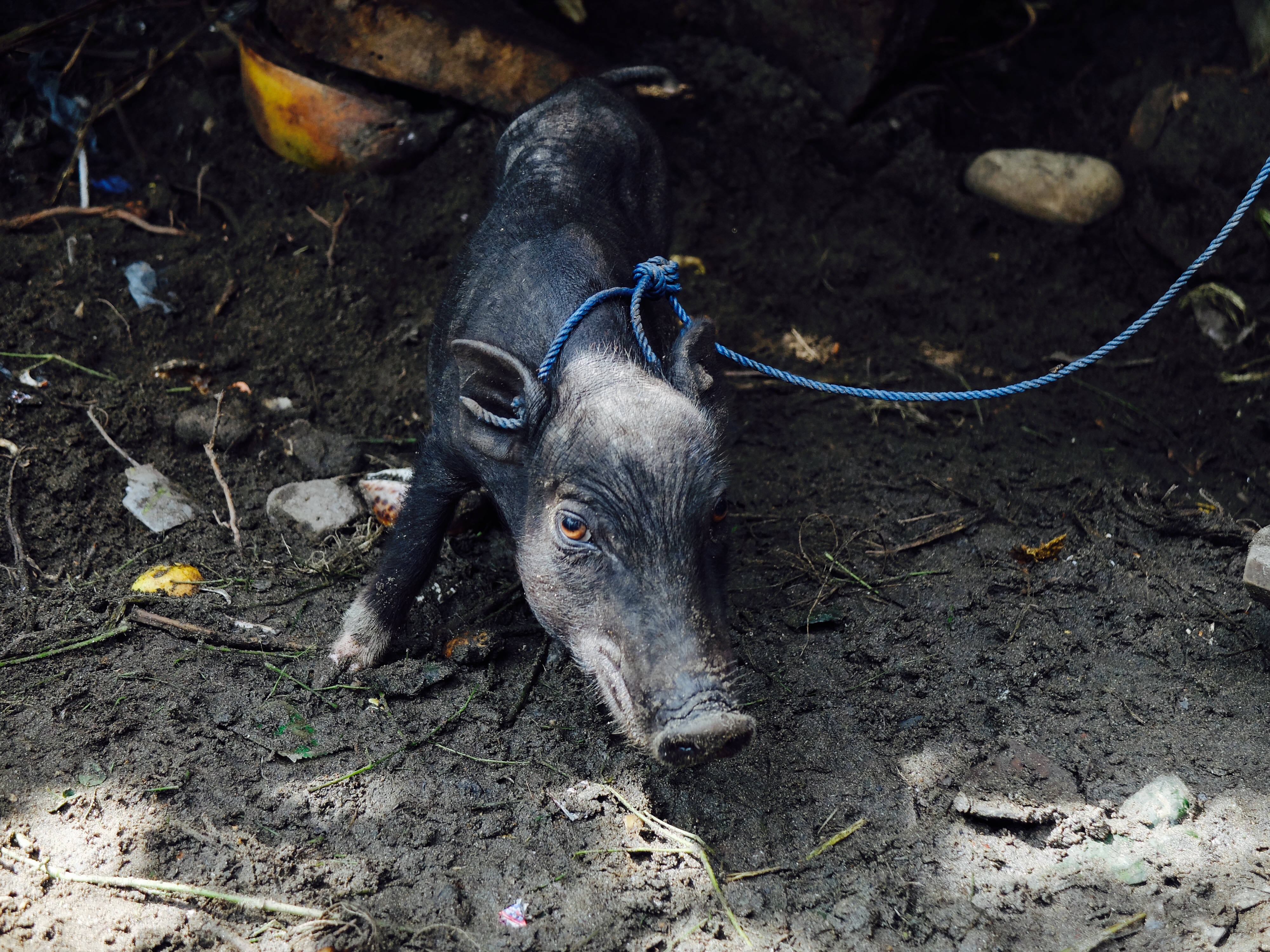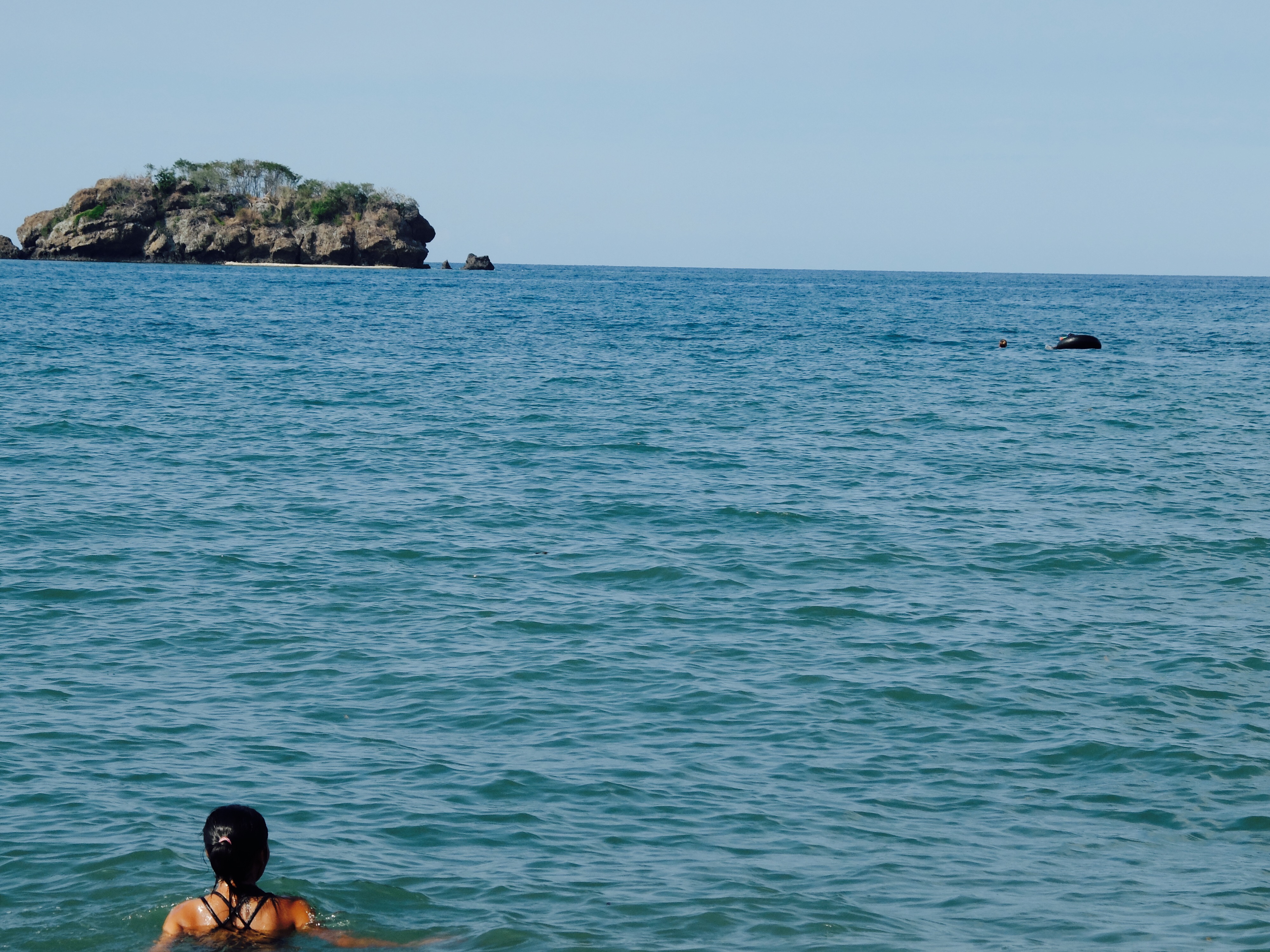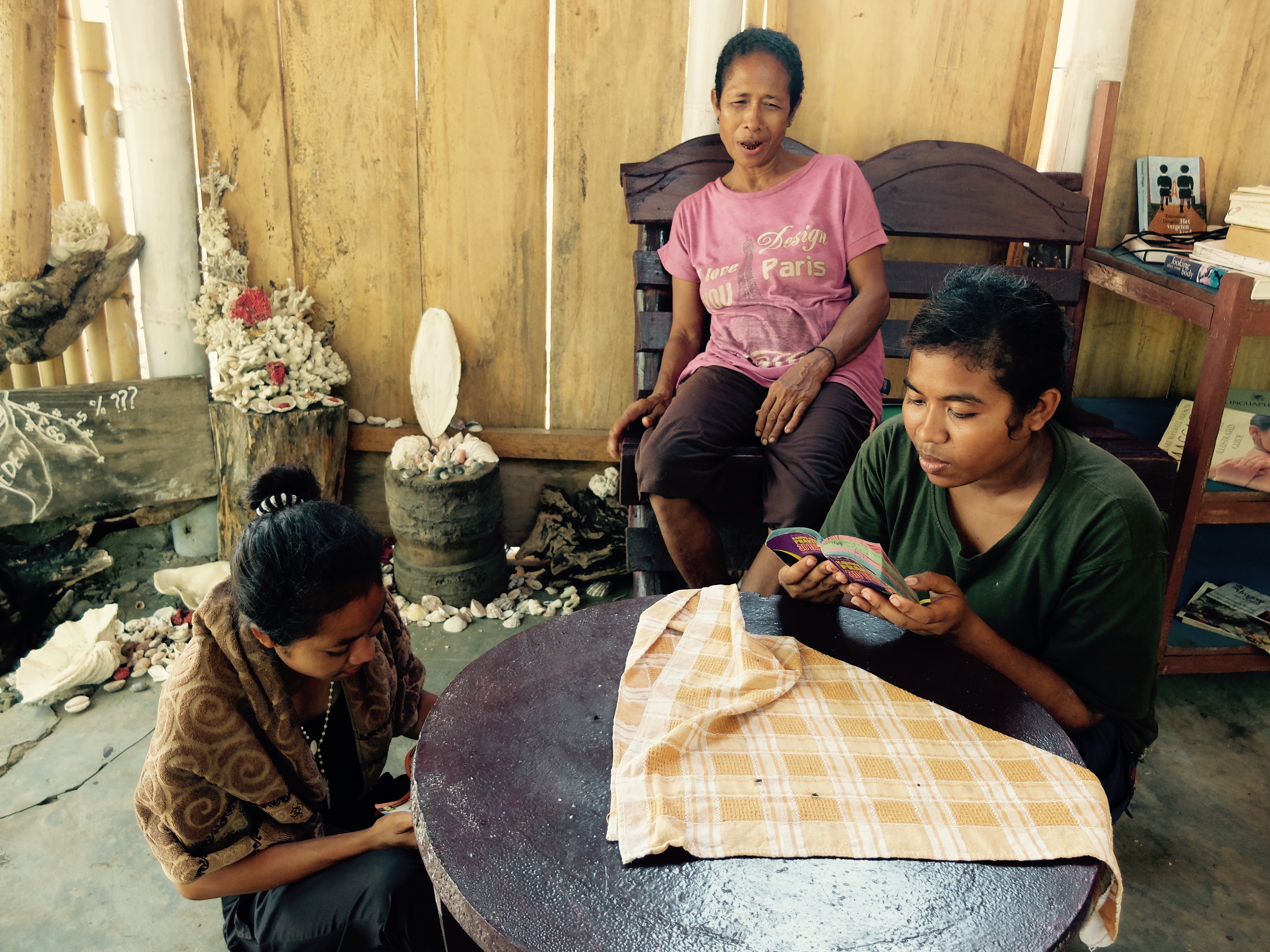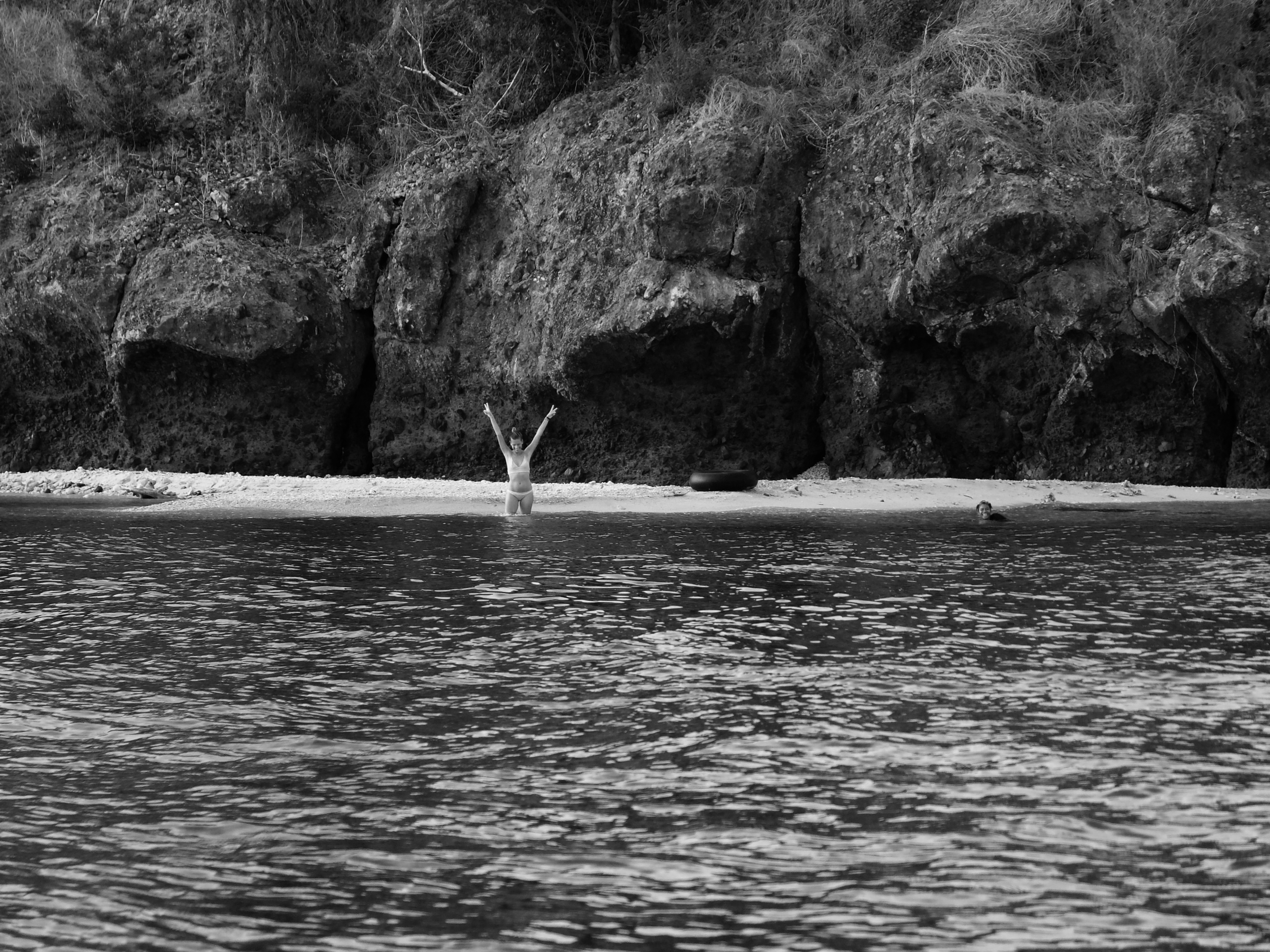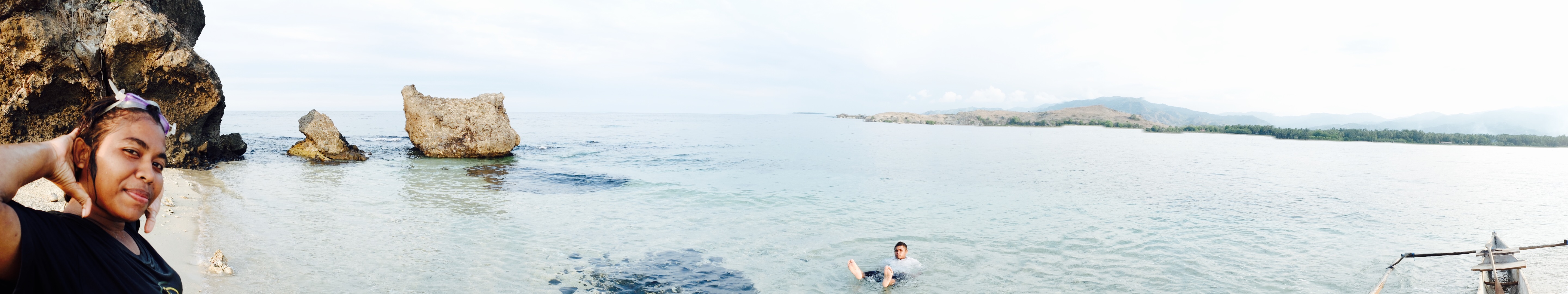 Daarna at ik mijn ontbijt in een open huisje, met allemaal positieve voorwerpen van Flores om me heen en las ik een boek over positief denken en het werkte. Ik probeerde mijn pulserende headdack te vergeten, zei niets van het zeer slechte ontbijt maar knikte vrolijk en deed mijn uiterste best om bahasa te spreken met het niet-engels-spekende personeel. Wat resulteerde in lange interessante gesprekken en beide partijen voelde hoeveel waarde het had. De tijd vloog om. Ik aaide de twee biggetjes die spontaan omvielen, zo fijn vonden ze het. Ik was verkocht… Ik wees naar het eiland wat opvallend dichtbij de kust lag en grapte dat we er ook heen konden zwemmen. En een van de meiden wilde dat wel doen. Laat dat nu sinds de filis iets zijn wat ik graag wil; naar een onbewoond eiland zwemmen. Maar tis best gevaarlijk. Fuck it. Na de lunch, die ik niet hoefde te betalen, instrueerde ik een van de locals hoe met mijn camera om te gaan (hoe gaaf, jezelf op een onbewoond eiland op foto hebben) en zwom. Mathilda, een local uit Eco Eden, zwom hangende in een zwemband en het was niet zo dichtbij als ik dacht, terwijl ik weet wat ze over eilanden zeggen. Ik werd een aantal keer flink gebeten door kwalletjes en zij tilde er doodleuk een op uit de zee. Fearless die meid. Ik ging er wel echt voor, wilde er wel graag zijn. Ik voelde me net als in the beach toen ik aankwam op het eilandje; half dood aanspoelen. En het was zo een mooi moment want na elkaar omhelst te hebben zeiden we niets. We liepen allebei op ons dooie akkertje rond te kijken en schelpen te zoeken. En tot onze grote verbazing was de jongen met de camera al fotos makende en Sylvester (de meest beleefde en puurste local ooit) onderweg vanaf de kant in een kano. We waren zo blij toen ze steeds dichterbij kwamen. En ik heb nog nooit zo een extreme fotoshoot gehad, het was onbetaalbaar. De fotograaf noemde het trots ‘my trip’ nadat hij honderd fotos van mij maakte en daarna met mij wilde poseren en alleen. Het was hilarisch. Na wat rondgehangen te hebben, grote vogels zien uitvliegen en slangen gaan zoeken, gingen we terug met de katamaran. We meerden aan en drie kleine jongetjes, van wie de boot bleek te zijn, namen deze mee met een schatkist vol schelpen aan boord. Ik liet t gaan. Ik voelde me steeds meer op mn gemak in het huisje en had mn hoofdlamp eigenlijk direct al bij de hand toen de stroom uitviel. Later hadden we vissenkopsoep en rijst, waar ik heel blij van werd en dat weer gratis (zoals dat ook ik bahasa genoemd wordt) was.