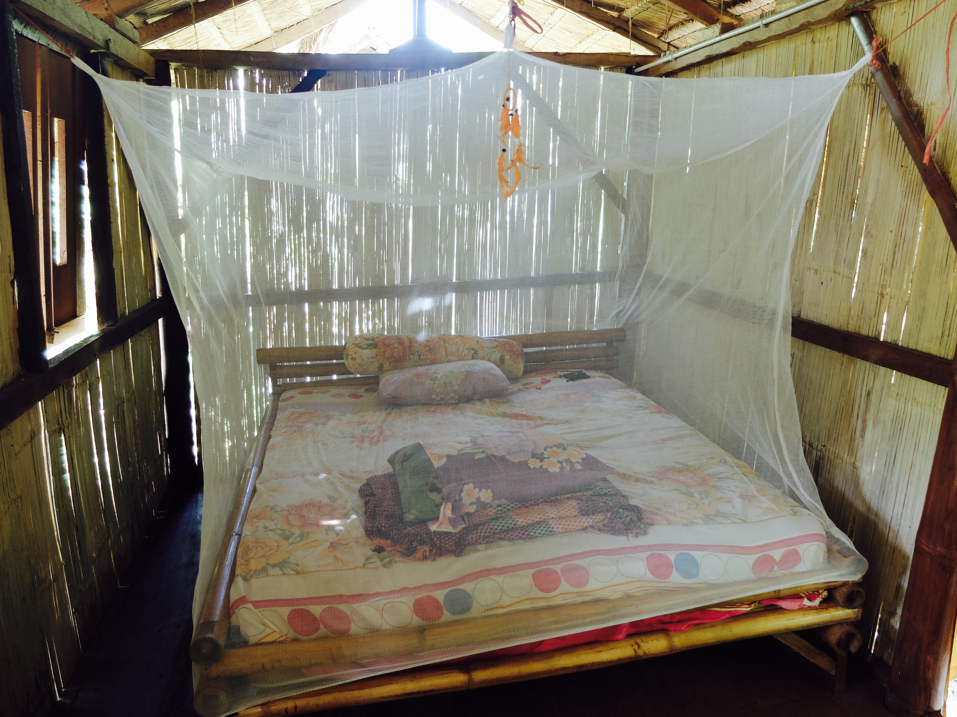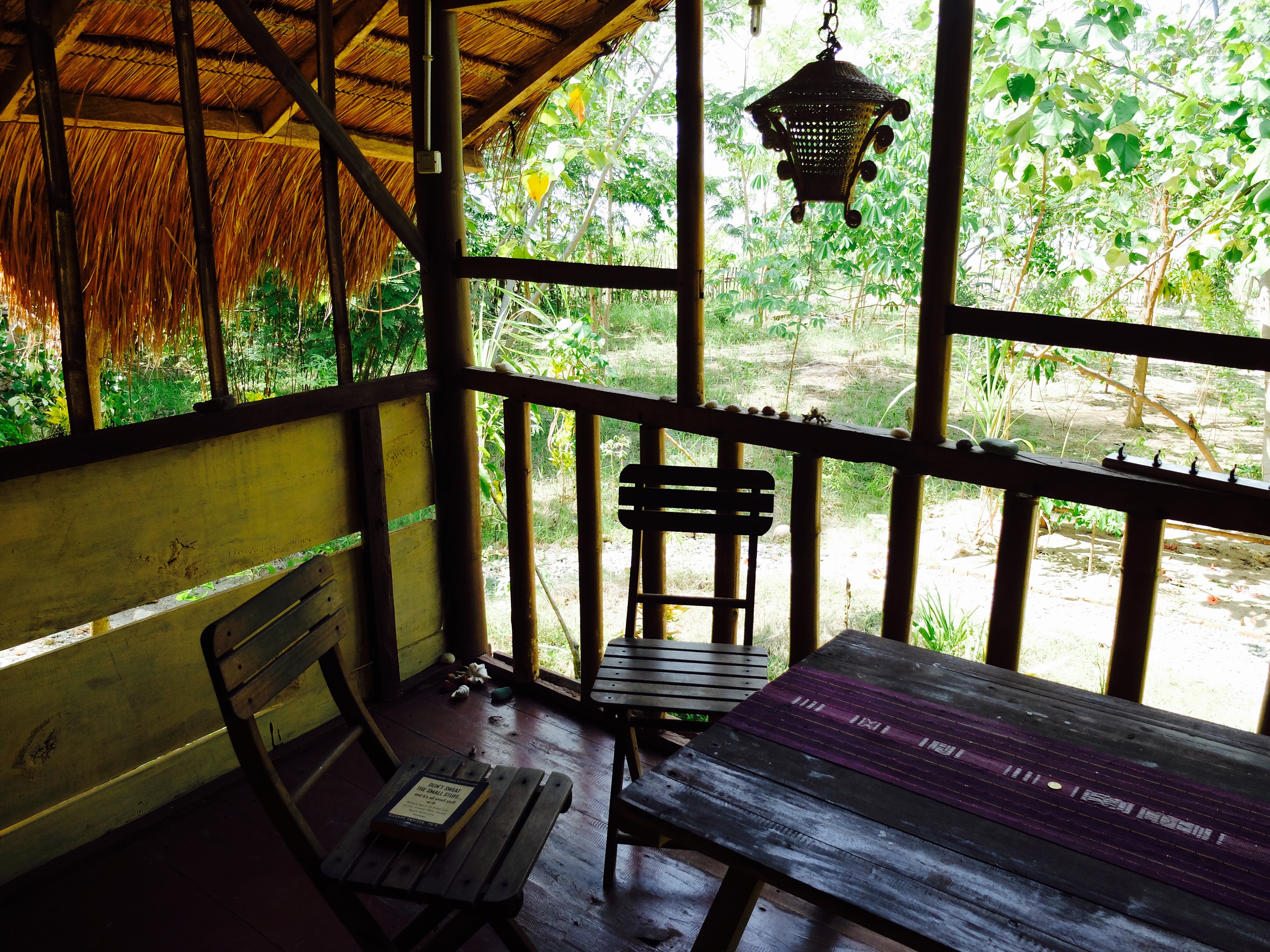 Ik viel savonds in slaap met het geluid van de zee. Ik werd smorgens wakker verbleef in een superlux bamboe huisje op palen aan het strand. Overal kleine schelpjes, heel veel ruimte. Rieten dakje en een patio. Een wc en douche in de achtertuin, welke in de jungle is. Dus douchen onder een palmboom. Dat is toch de droom van iedereen. Ik begon bij te trekken en voelde me eigenlijk wel heel fijn in mijn riante comfortabele tweepersoonsbed met (jaja) een gatenloze klamboe. Ik ging na mn douche even rustig op de patio zitten om het geheel te overzien. Ik voelde me best een lucky bastard.