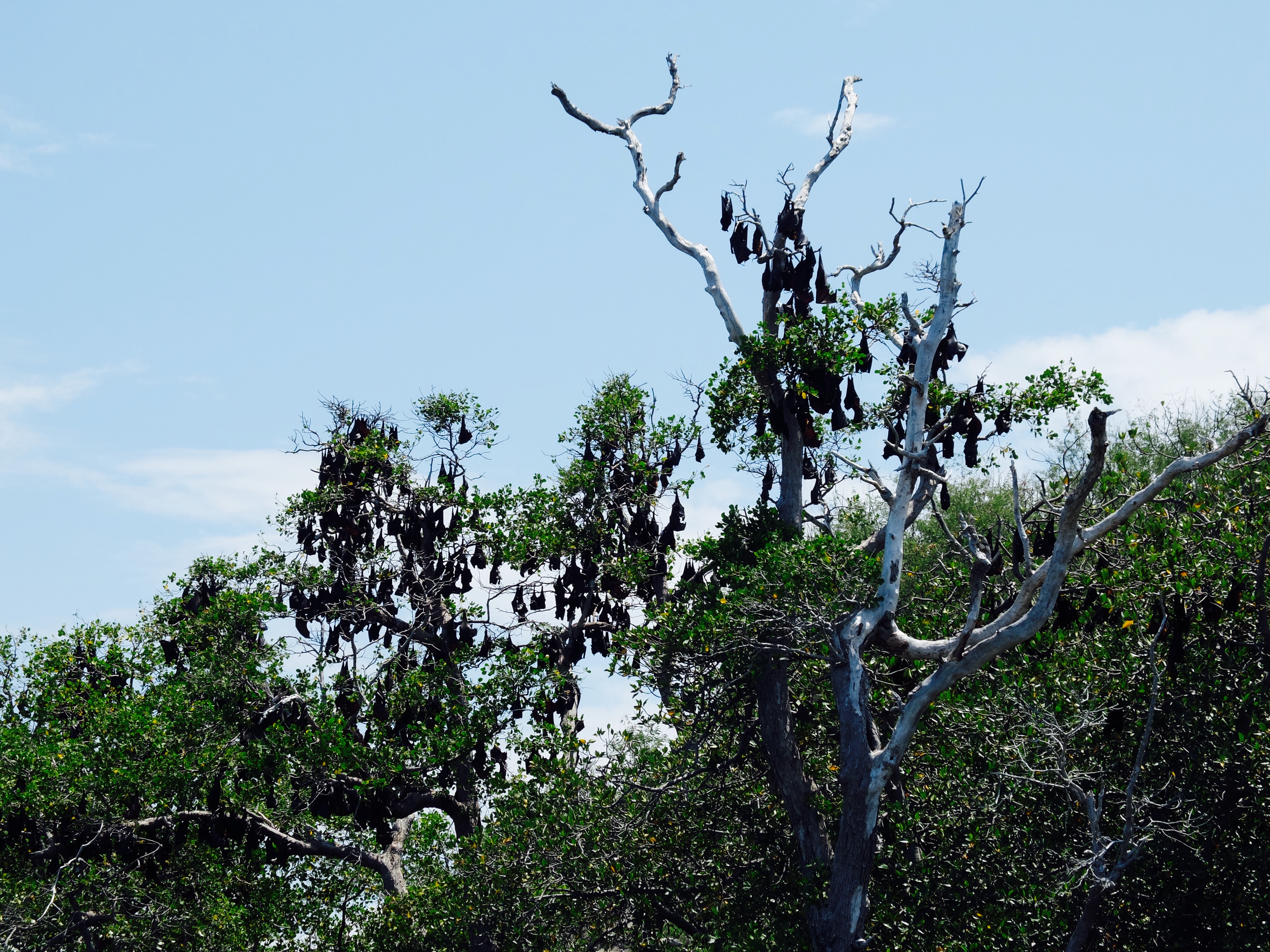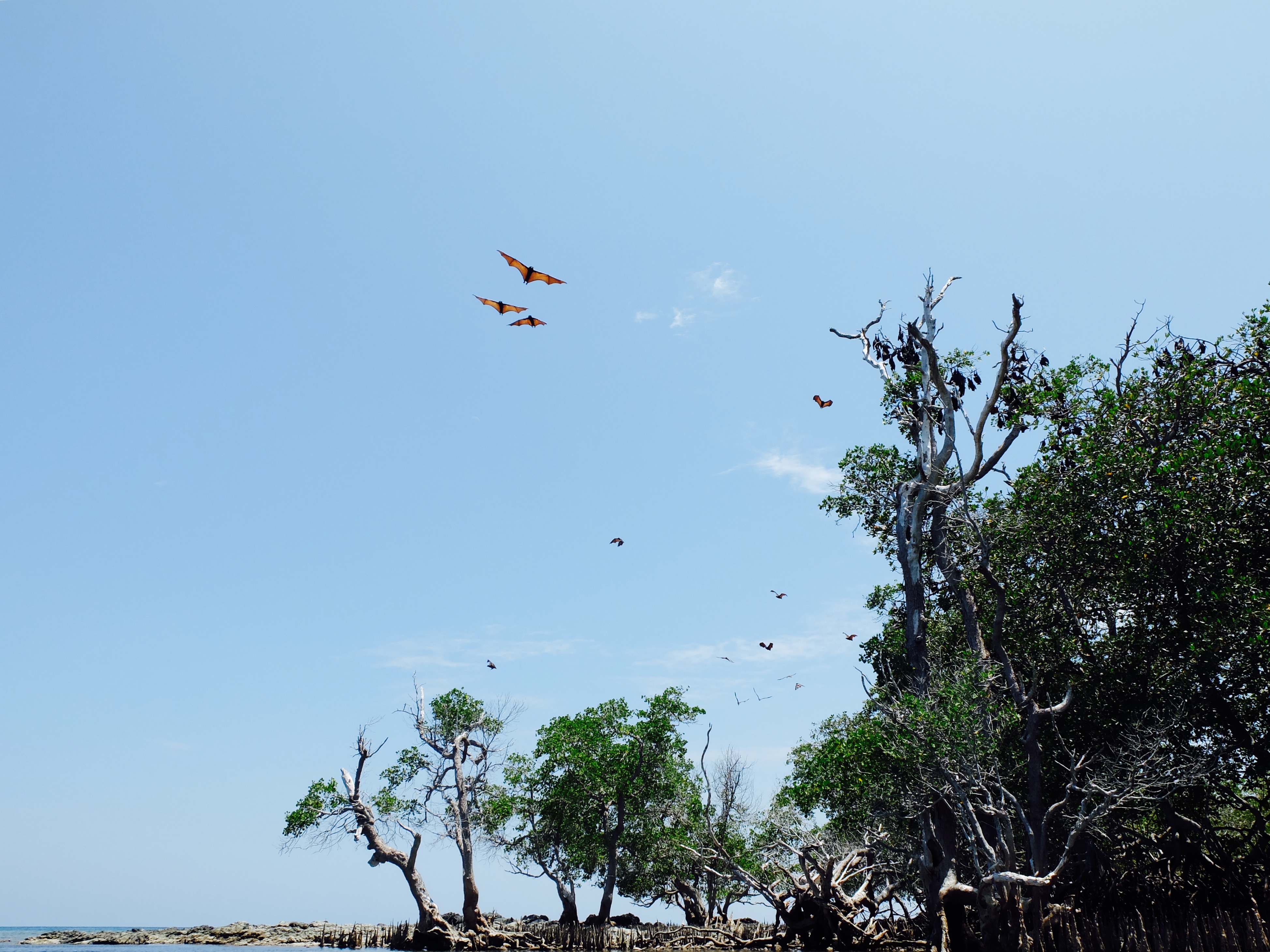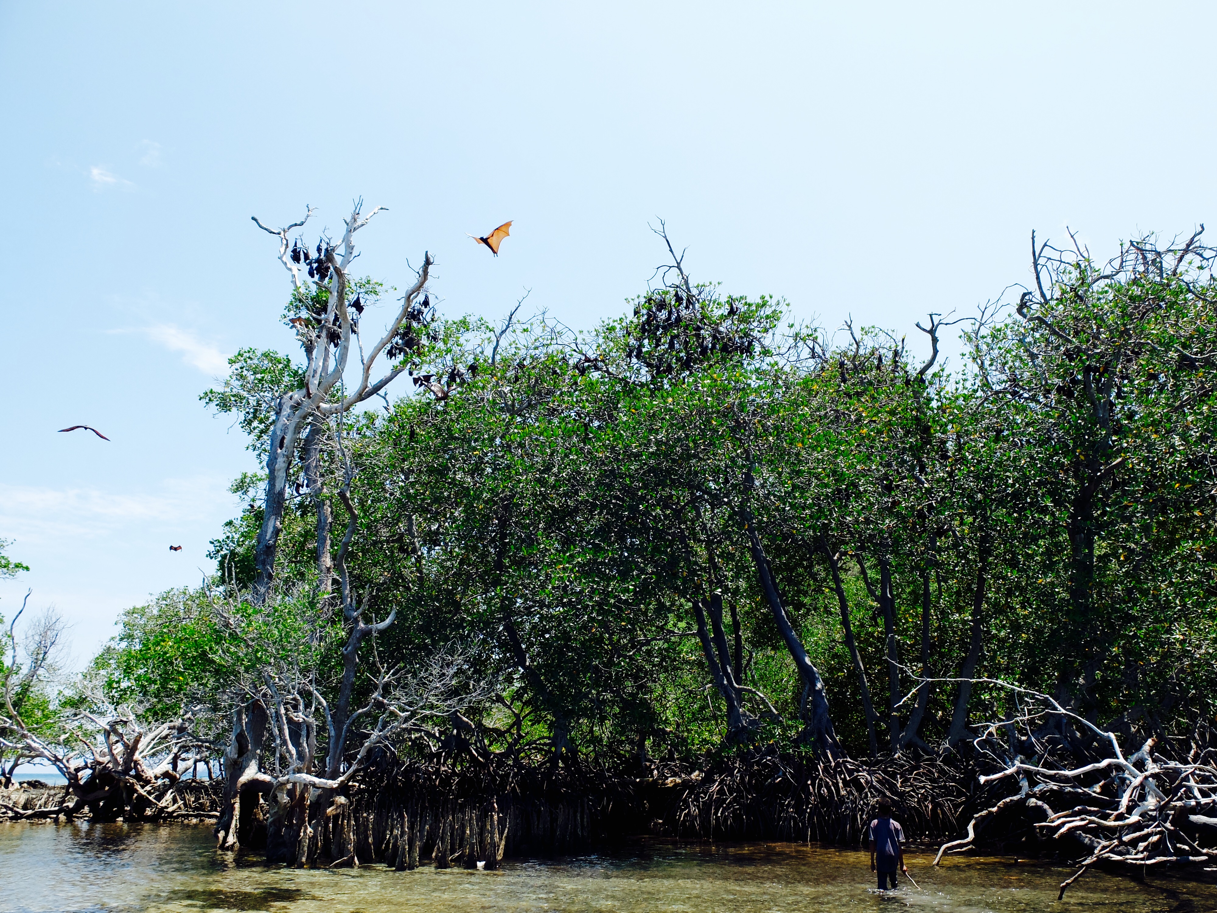 Toen er genoeg vis was vertrokken we naar het kelelawar eiland, wat vleermuis betekent. Omdat we erlangs voeren, vroeg ik of we ernaaroe konden, maar het was te ondiep. Dus sprong ik met het vaardige zoontje van de boot en waadden we erheen. Ik vond het wel een beetje spannend, want mijn bahasa is niet goed genoeg om te vragen of t wel kon en zij spreken geen engels. De rand van het eiland staat vol met bomen en alle bomen zaten helemaal vol met vleermuizen. Niet in een grot ofzo dus, waar je ze zou verwachten maar hangend in de brandende zon. Het zoontje begon ze op te jagen door stokken naar ze te gooien en hoewel me dat helemaal niet beviel, zag ik wat hij wilde laten zien. Ze vlogen met tientallen tegelijk over ons heen en door het licht van de zon waren de vleugels oranje en kon je de bloedvaatjes in de vleugels zien. Heb flink wat mooie plaatjes geschoten. We hadden lunch op een volgend wit strand. De gevangen vis werd op de bbq gelegd en was heerlijk. Een vis met een puntige bek met vlijmscherpe tandjes leek in het water zo lief maar was toch wat minder op het bord. Op het laatste strand las ik een boek (wat ik in al die tijd nog amper heb gedaan) bij terugkomst aten we samen (weer vis) en was heel gezellig.