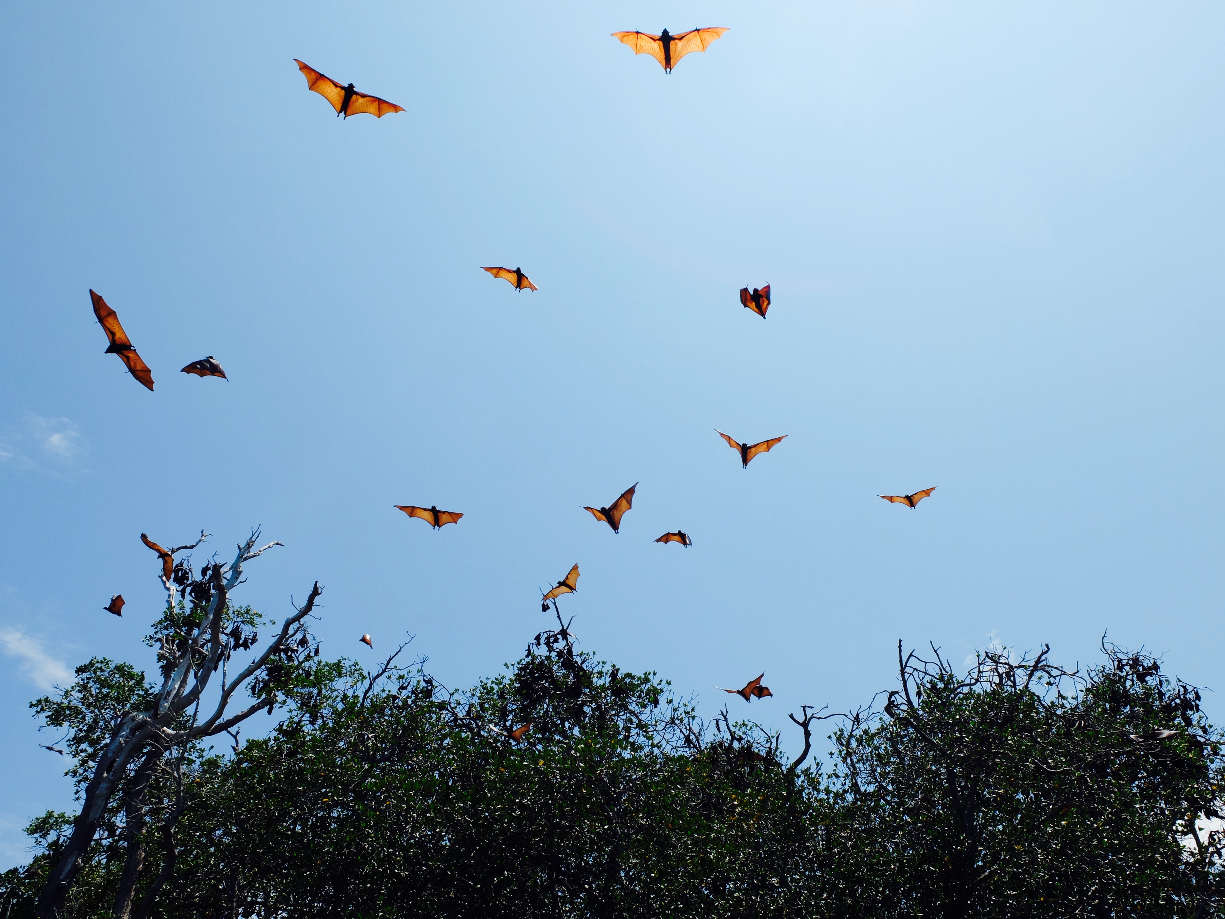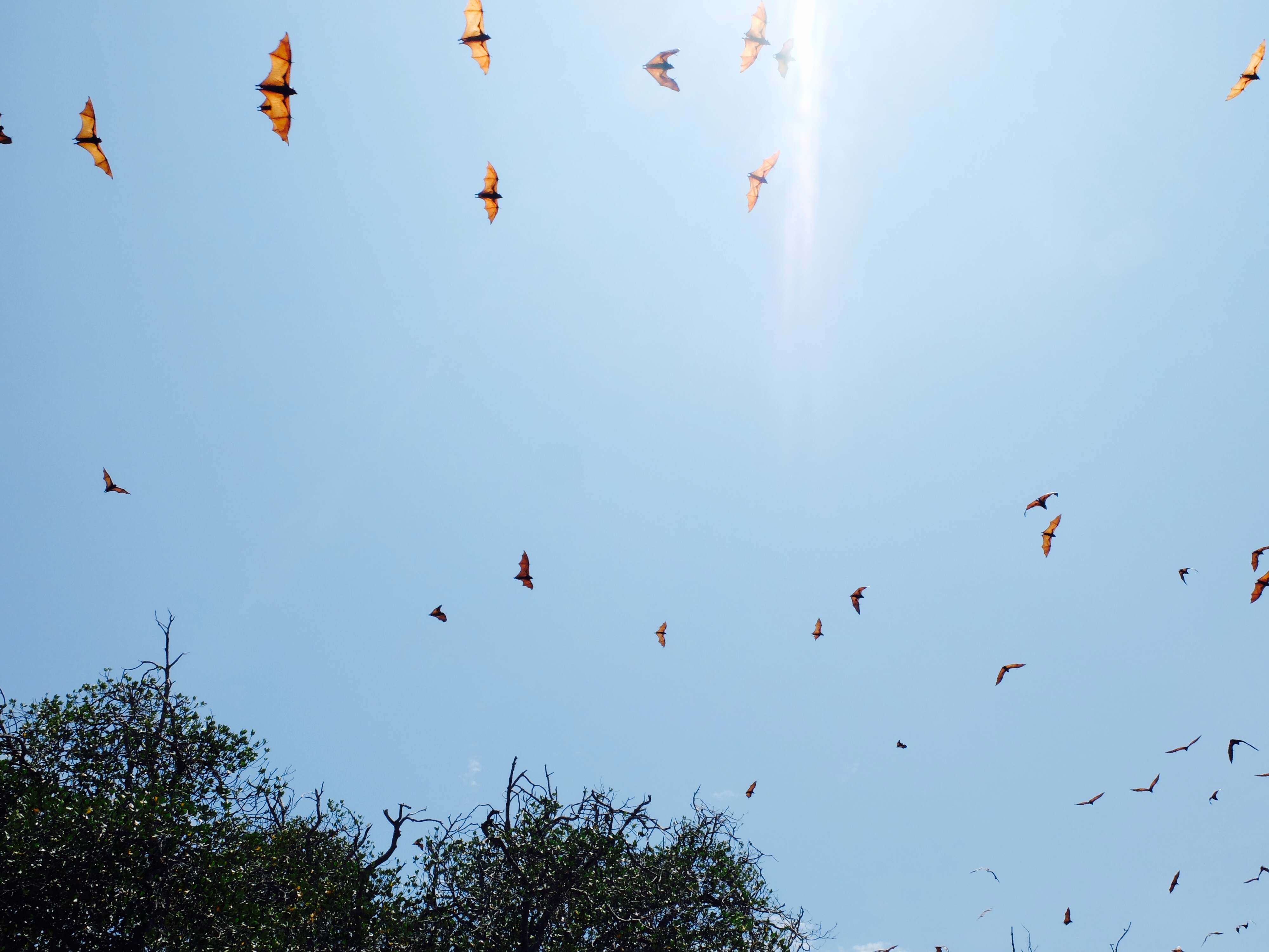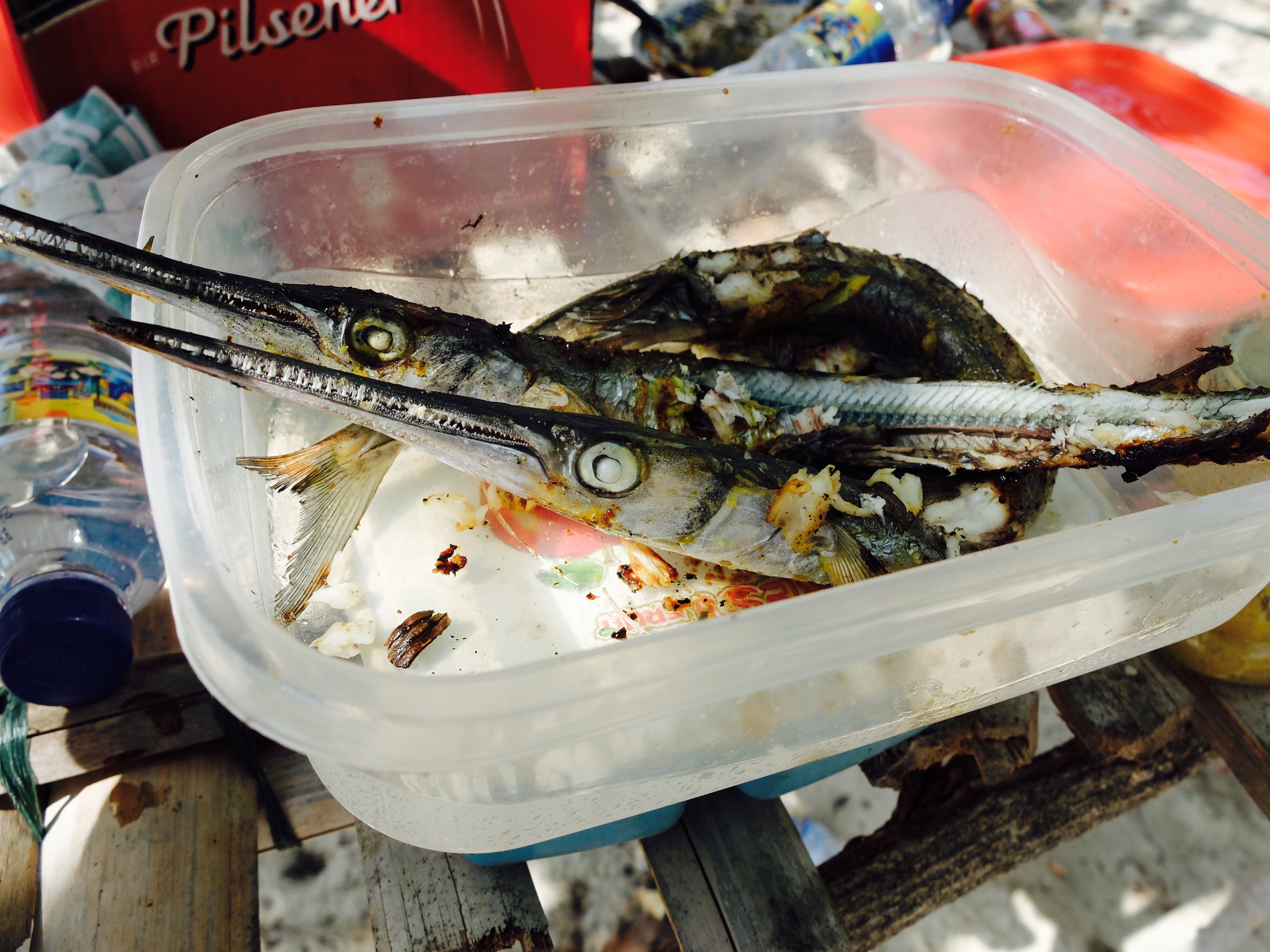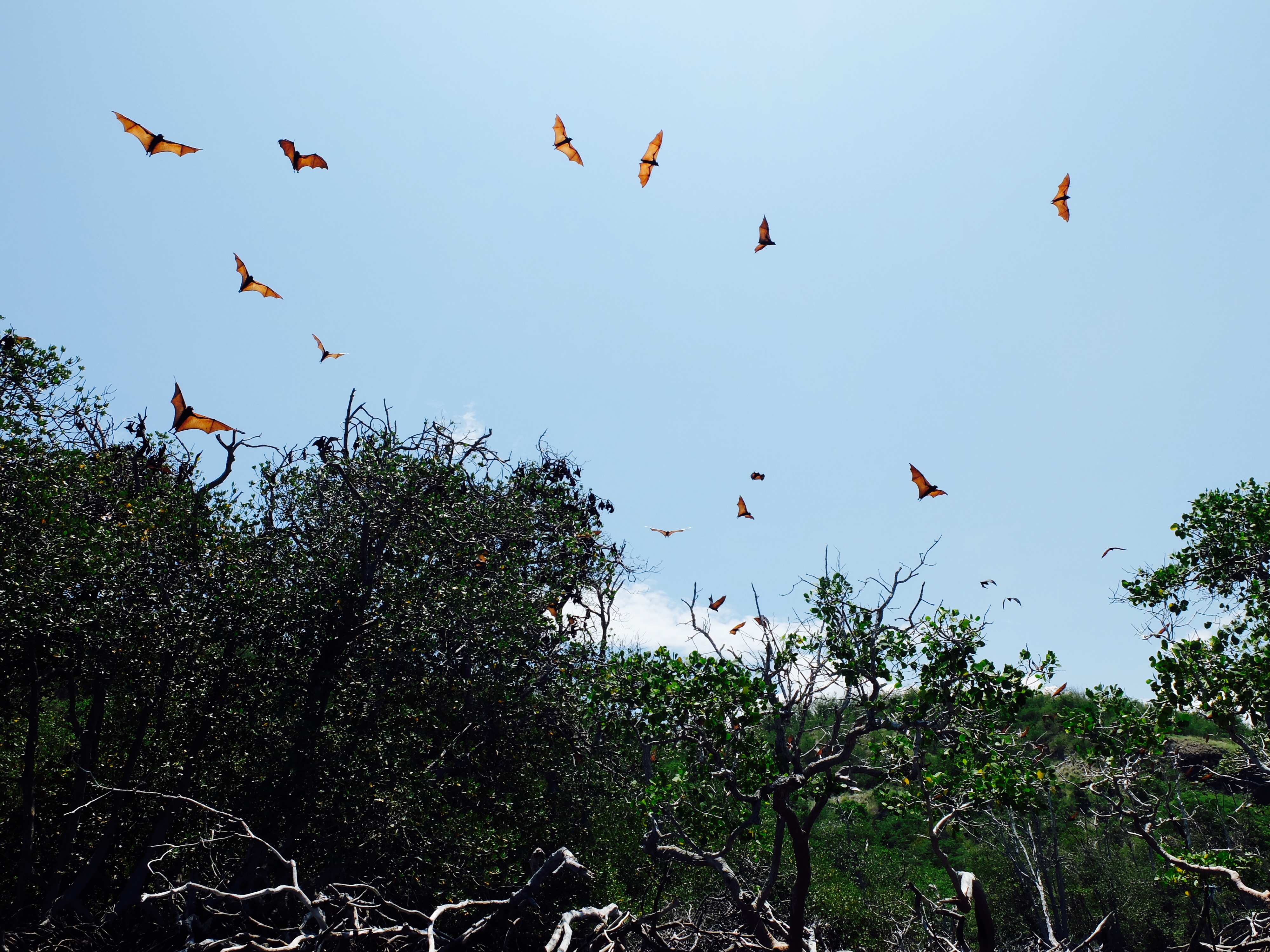 Toen er genoeg vis was vertrokken we naar het kelelawar eiland, wat vleermuis betekent. Omdat we erlangs voeren, vroeg ik of we ernaaroe konden, maar het was te ondiep. Dus sprong ik met het vaardige zoontje van de boot en waadden we erheen. Ik vond het wel een beetje spannend, want mijn bahasa is niet goed genoeg om te vragen of t wel kon en zij spreken geen engels. De rand van het eiland staat vol met bomen en alle bomen zaten helemaal vol met vleermuizen. Niet in een grot ofzo dus, waar je ze zou verwachten maar hangend in de brandende zon. Het zoontje begon ze op te jagen door stokken naar ze te gooien en hoewel me dat helemaal niet beviel, zag ik wat hij wilde laten zien. Ze vlogen met tientallen tegelijk over ons heen en door het licht van de zon waren de vleugels oranje en kon je de bloedvaatjes in de vleugels zien. Heb flink wat mooie plaatjes geschoten. We hadden lunch op een volgend wit strand. De gevangen vis werd op de bbq gelegd en was heerlijk. Een vis met een puntige bek met vlijmscherpe tandjes leek in het water zo lief maar was toch wat minder op het bord. Op het laatste strand las ik een boek (wat ik in al die tijd nog amper heb gedaan) bij terugkomst aten we samen (weer vis) en was heel gezellig.