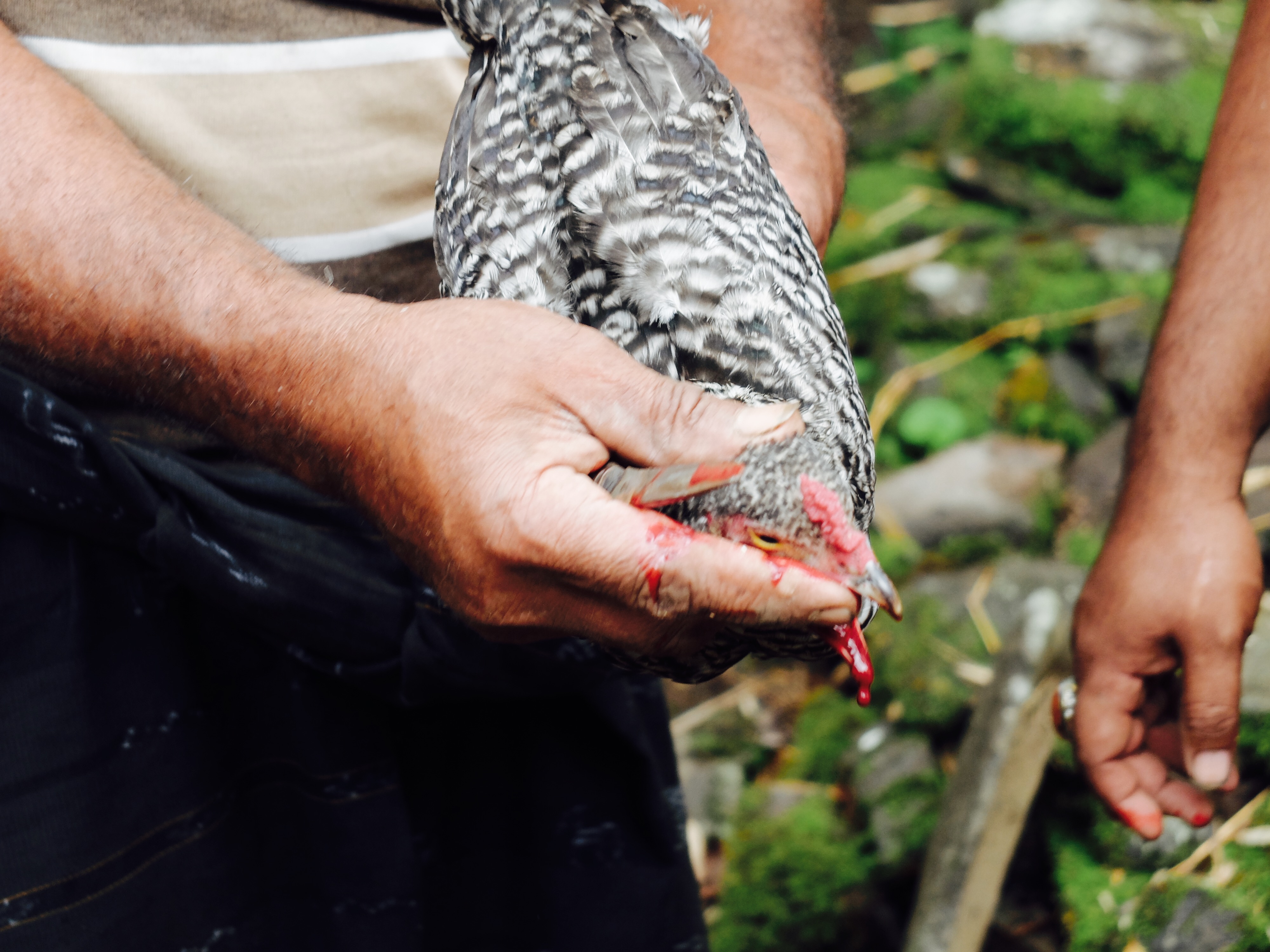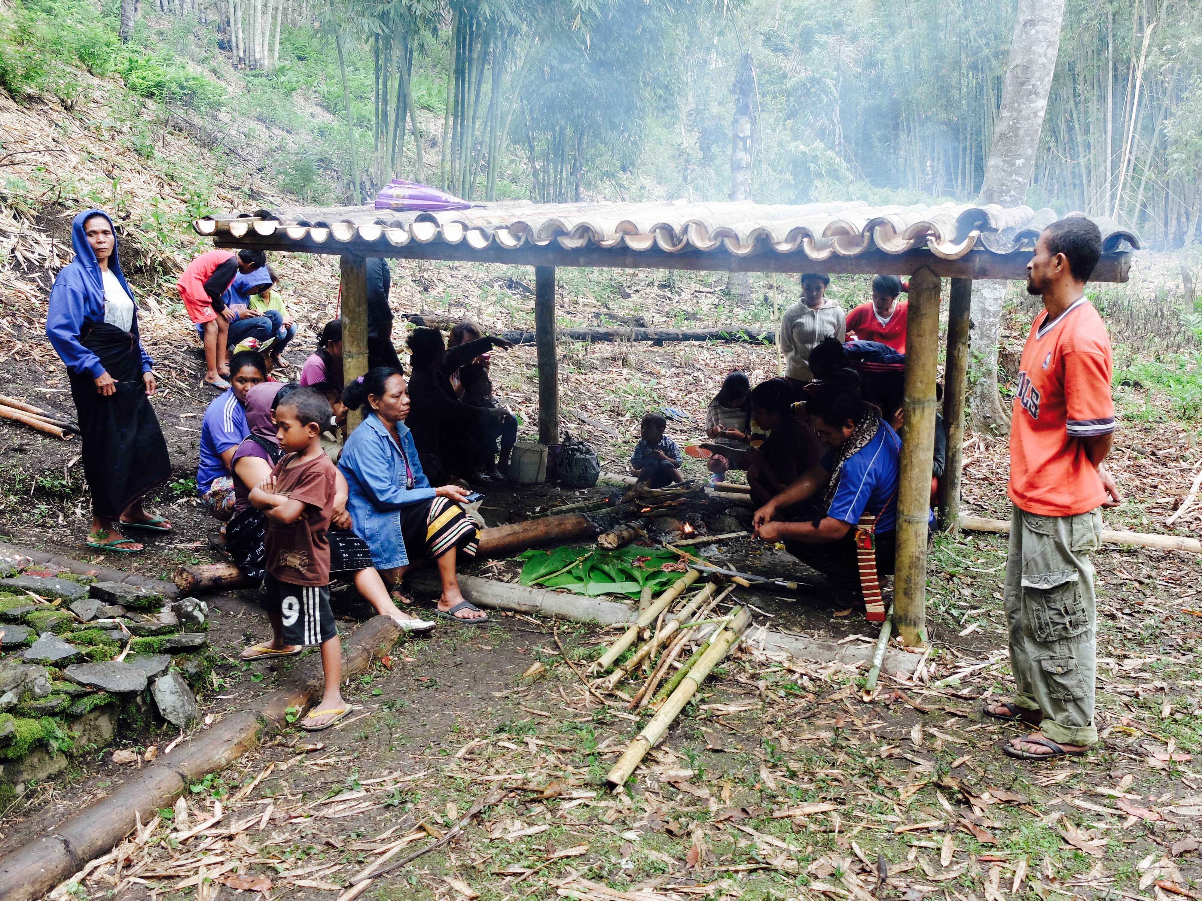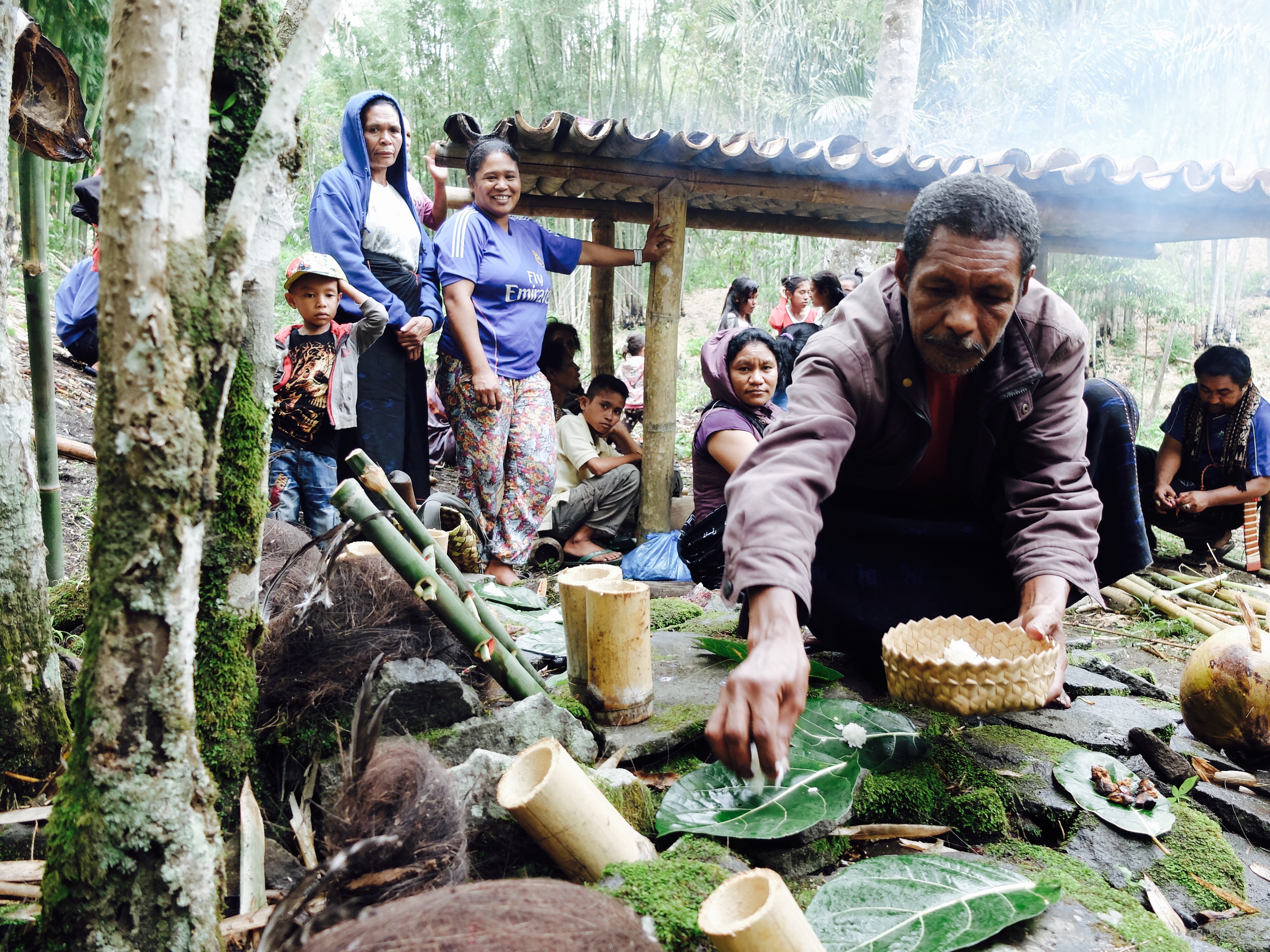 De baas van Eco Eden had me uitgenodigd om een ceremonie bij te wonen in zijn dorp. Dus ging ik met Silvester op de motor naar Bajawa (waar ik al eens ben geweest). Ik had het onderschat. Het was een heel slechte weg en ik had nog steeds veel hoofdpijn en voelde me niet honderd procent. Aangekomen bij Philip voelde ik me echt heel moe en behoorlijk labiel. Philip was teleurgesteld toen ik zei dat ik niet bleef slapen maar ik zou dat echt niet trekken. Het was namelijk niet respectvol om alleen maar een deel van de ceremonie bij te wonen maar dat was me niet verteld en vond het ook moeilijk dat hij me hiermee zo onder druk zette. Ik woonde uiteindelijk een deel van de ceremonie bij, welke behoorlijk heftig was. In het dorp waar Philip vandaan komt hebben ze elk jaar een bijeenkomst voor alle familieleden van negen voorouders. Er wordt een offerplek gemaakt en er word niet alleen rijst geofferd op negen blaadjes maar ook rijstwijn in negen bekers en je voelt het al aankomen: kippen. Een paar kindjes hielden ze vast, lief strelend. Nadat de spreker klaar was met vertellen werd er bij een van de kippen een mes in zijn bek geduwd en zo ver doorgedrukt dat de hersenen sowieso doorboord werden en het begon te bloeden. Het is een teken van ‘spreken’ met elkaar. En omdat daarop een van de kippen wild begon te krijsen, is dat beest zeker van zijn leven omdat een van de voorouders via de kip heeft geantwoord. Aldus Philip. Het bloed van de kip werd op de offerplek gedruppeld en daarna ging het rond. Iedereen kreeg bloed op zijn vingers, ik moest ook en eigenlijk zelfs op mn voorhoofd maar dat vond ik te ver gaan. Daarna werd de kip half dood half levend geplukt en op het vuur gegooid.