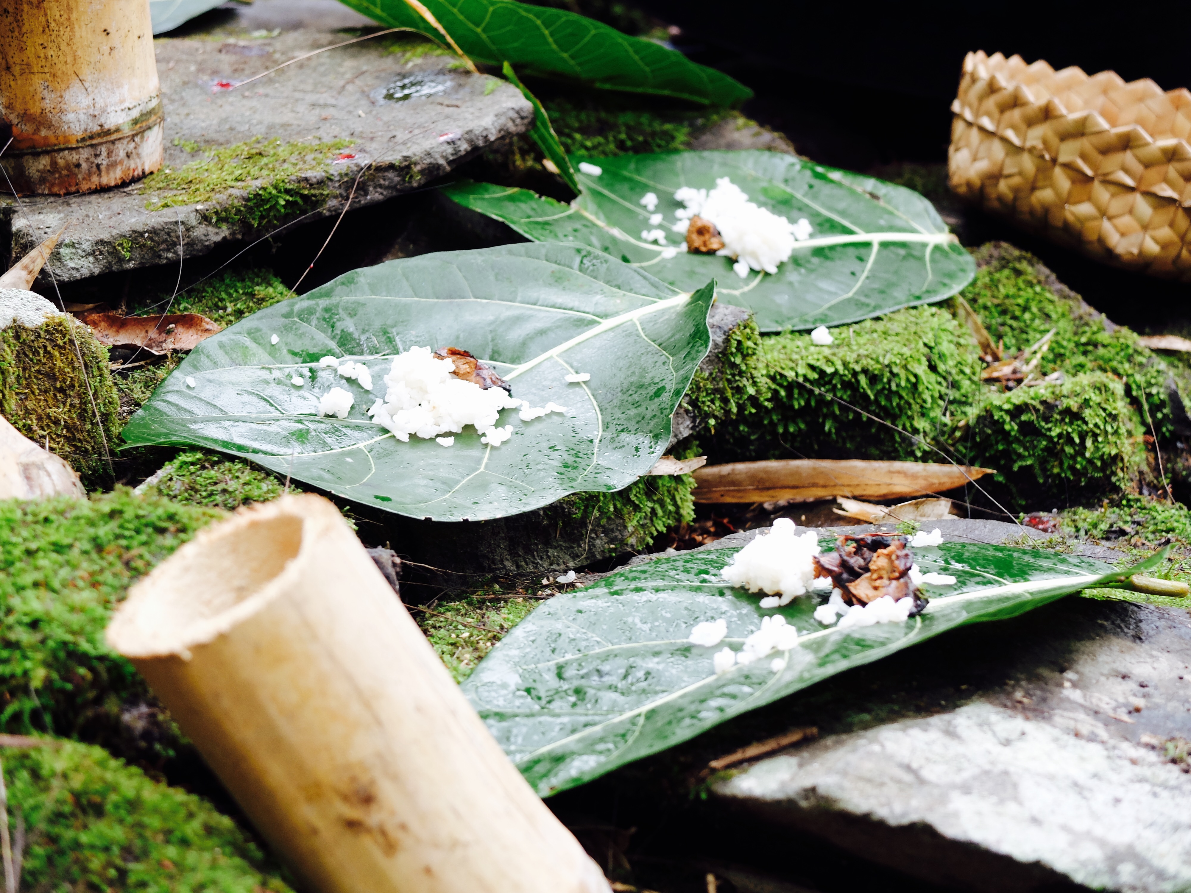 Philip merkte op dat het zeker niet mijn eerste offering was omdat ik niet zo geschokt was. Nou, dat was ik wel maar zei dat niet tegen hem en liet het niet merken. Ik voelde me zelfs nog zieker dan voorheen en wilde weg. De tweede kip werd op dezelfde manier geofferd. De spreker las in het hart van de eerste kip, die hij met de rest van de ingewanden naar de hemel omhoog hield, dat het contact onderling niet goed was. De boodschap was dat mensen meer moesten spreken met elkaar. Joh! Toen kreeg iedereen hele harde rijst op een bananenblad en stukken gehakte kip. Ik heb nog nooit zulke taaie kip gegeten en de mensen om me heen verslonden het met bot en al. Deze kip heeft stress gehad, dat was te proeven. Daarna werd een kokosnoot open gehakt en werd de offerplek gebaptised en aanwezigen ook en kregen we een stukje kokosnoot, waardoor ik me even wat beter voelde. Toen moesten de mannen en vrouwen gescheiden eten in het dorpje en daarna in een huis. Toen we terugliepen voelde ik me opgelucht. In het huis van Philip vertelde hij over zijn plannen voor Eco Eden en sinds ik er aankwam vond ik het al een interessante plek. Ik gaf aan dat ik graag wil volunteeren en zelf ook wat ideeën had. We werden erg enthousiast allebei en voor mij ook de mogelijkheid om wat geld te saven. Later kwam een partner van Eco Eden erbij en er hadden een mooi gesprek. Op maandag ga ik beginnen.